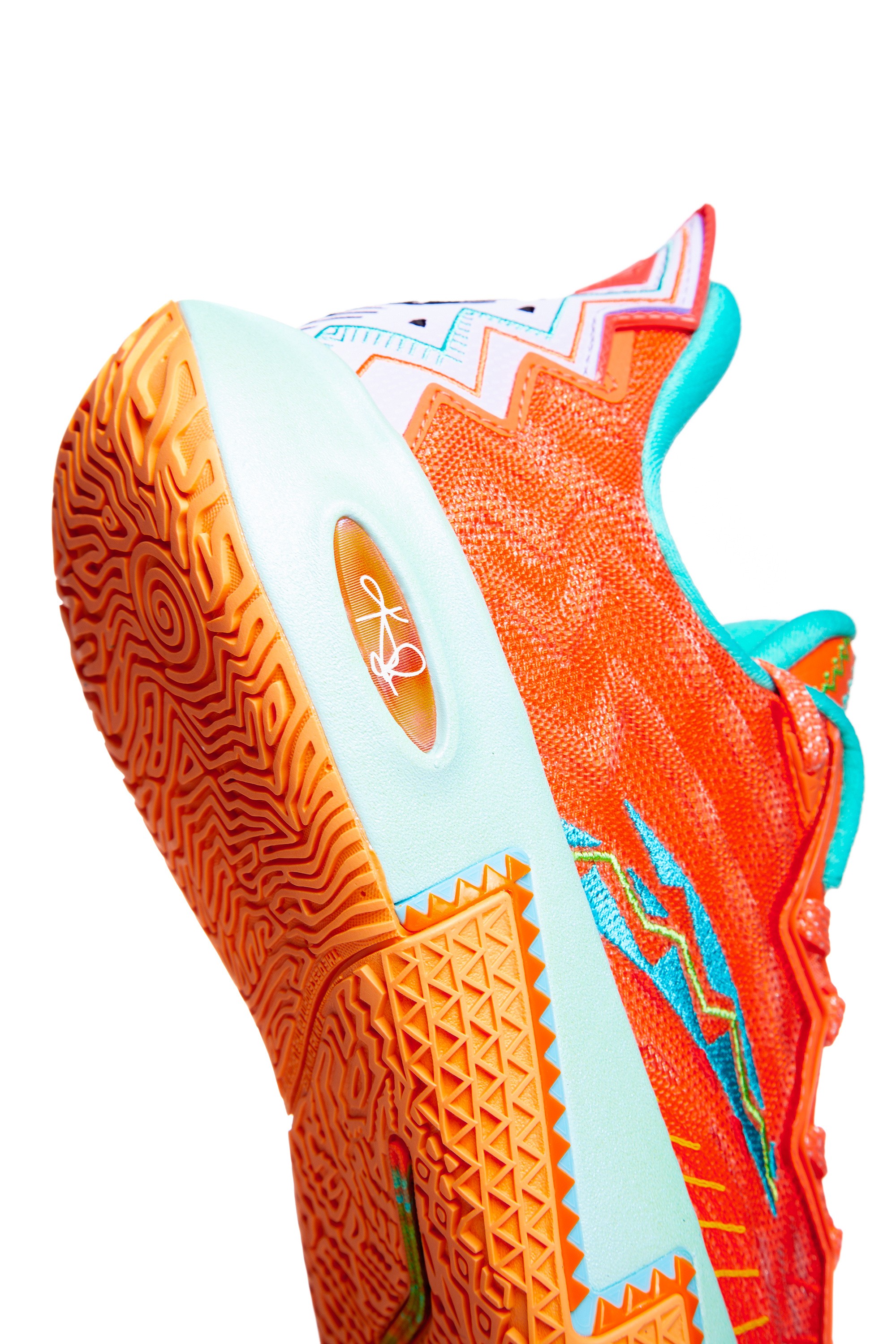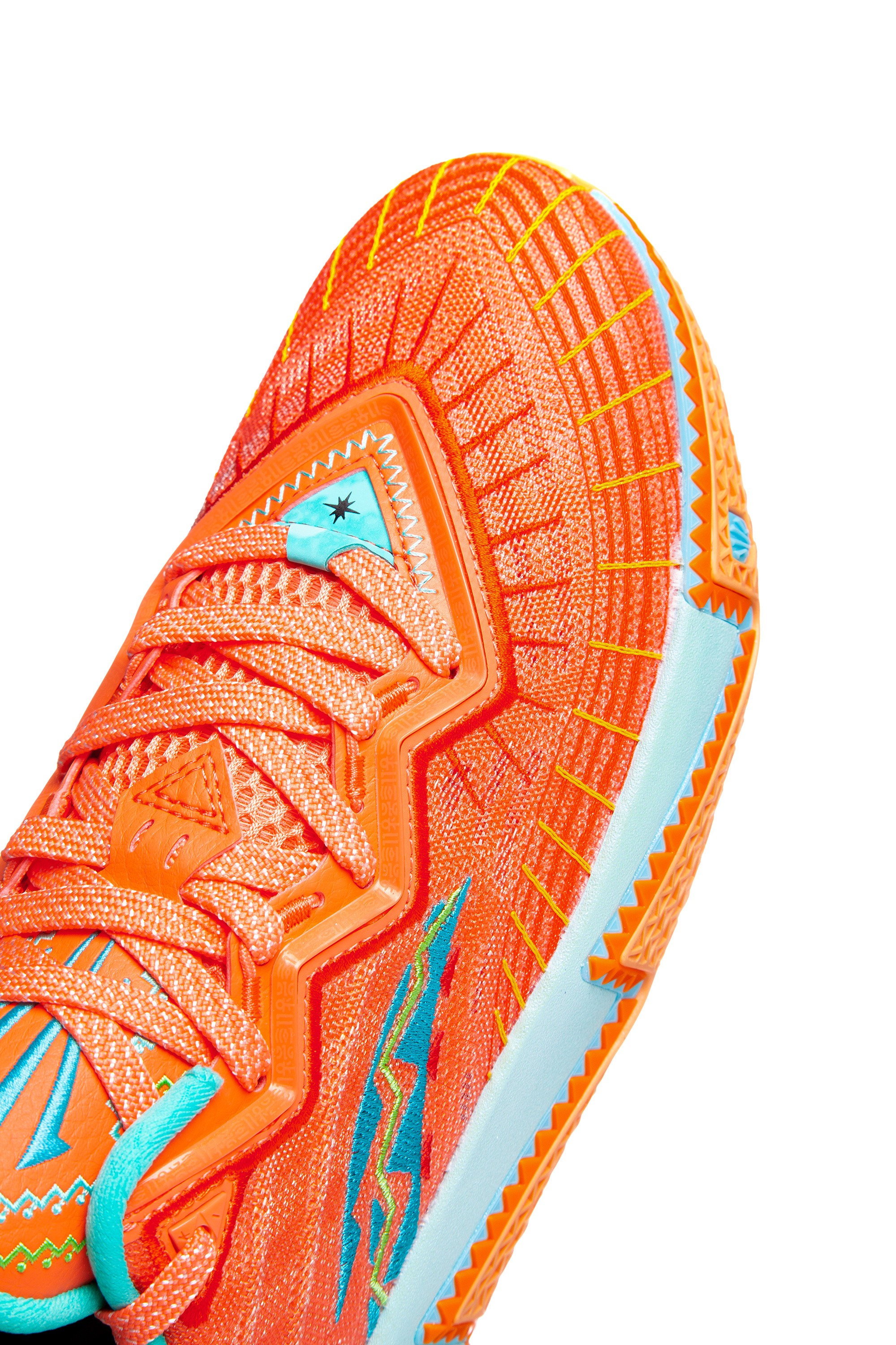 Верх имитирует вид созвездий или космической пыли, визуализируя связь игрока с вселенной. Выразительный графический элемент на пятке – ключевая деталь, несущая идею защиты и высшего руководства. Геометрия подошвы и элементов верха передает энергию восходящего светила и динамику игры звезды NBA.