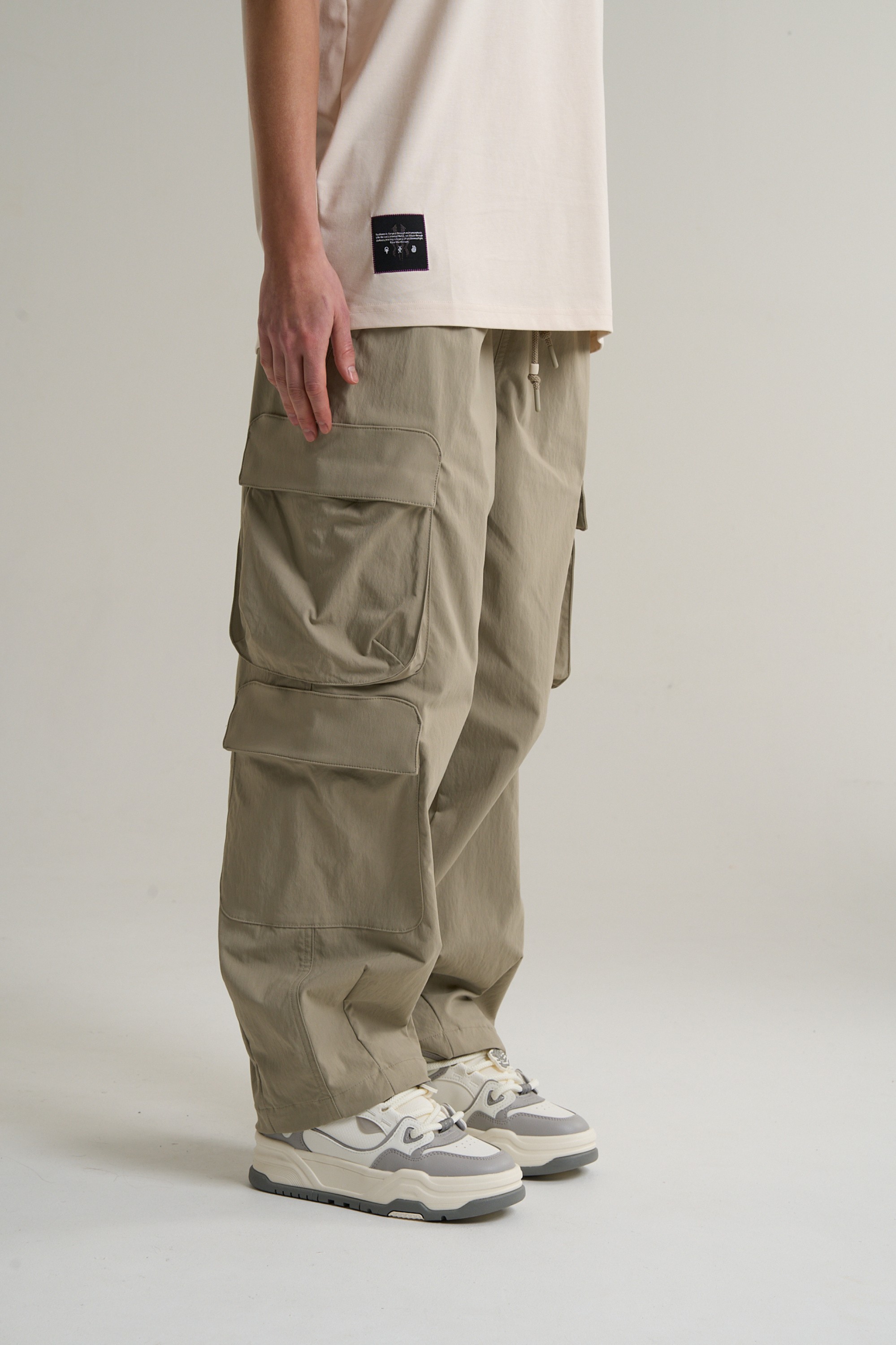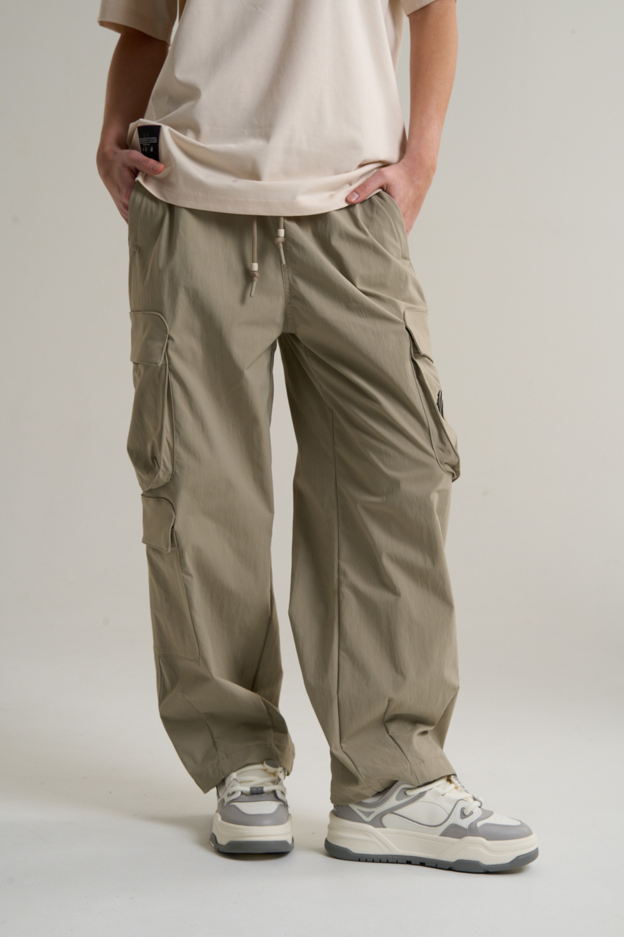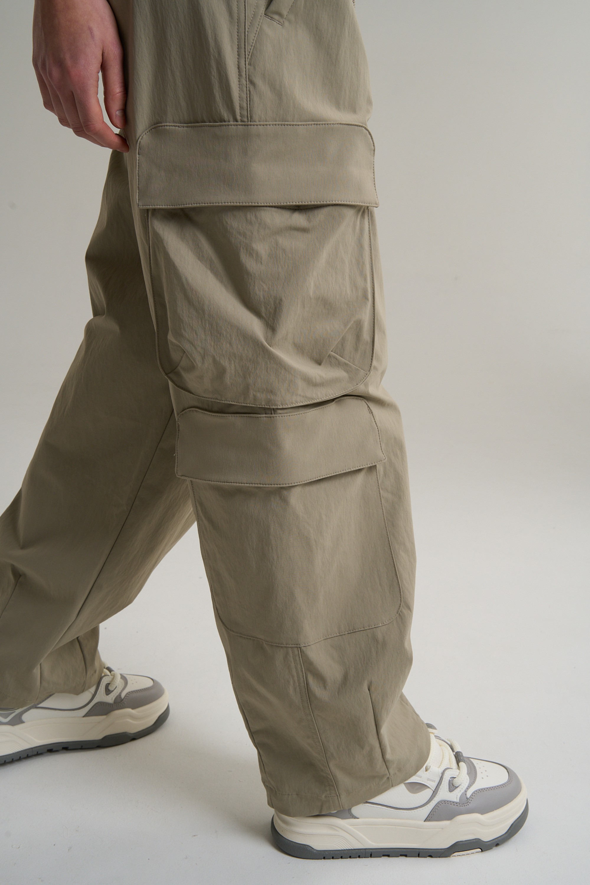 Свободный крой Relaxed Fit не сковывает движений и подходит для любого типа телосложения. Эластичный пояс с внешним регулировочным шнурком и стильными эглетами в цвет шнурка обеспечивает надежную и удобную посадку на талии. Дополнительные швы внизу штанин формируют объемный силуэт в духе оверсайз, а классический подгиб низа завершает аккуратную линию. Два боковых кармана на молнии, два вместительных накладных кармана с клапанами на бедрах и стильный врезной карман с клапаном на правой штанине ниже колена предлагают практичное пространство для надежного хранения личных вещей.
