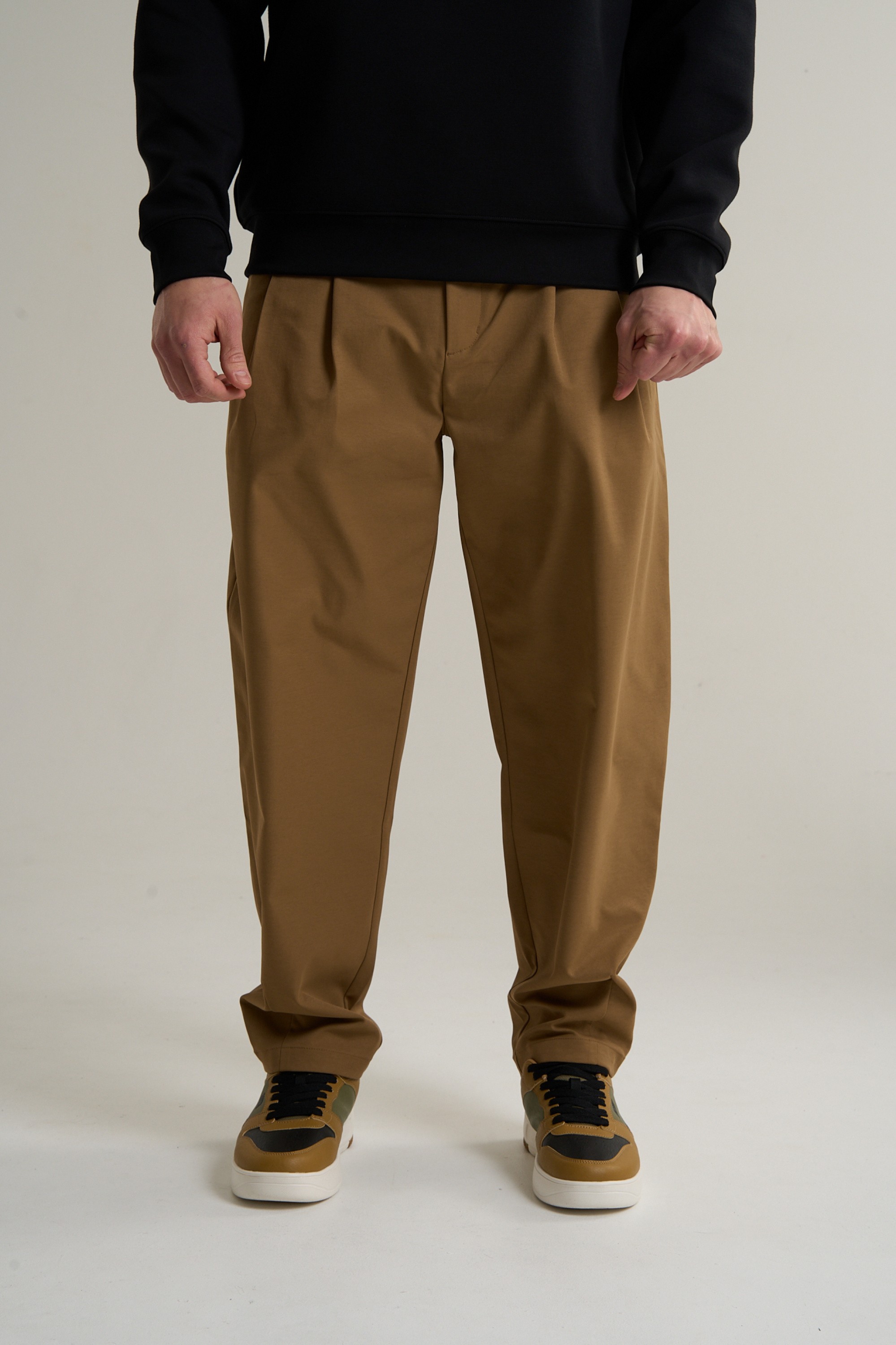 Дизайн модели — это воплощение философии «clean fit» (чистого кроя). Отсутствие лишних деталей, видимых молний или накладных карманов делает брюки визуально легкими и элегантными. Лаконичный, но выразительный крой сам по себе становится главным украшением. Благородный коричневый цвет делает эту модель основой для создания разных образов, легко сочетаясь с оверсайз-худи, футболками, рубашками или жилетами.