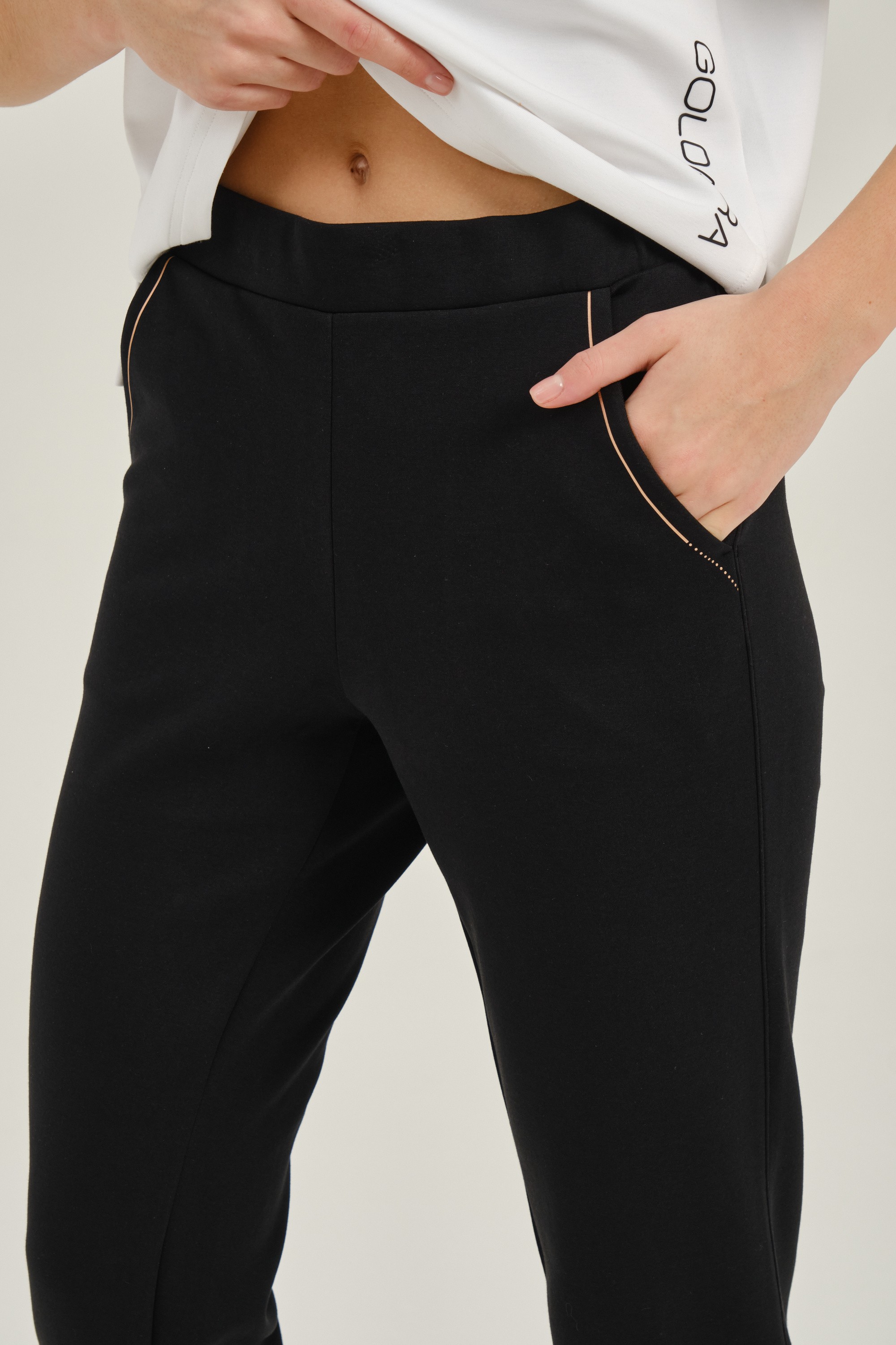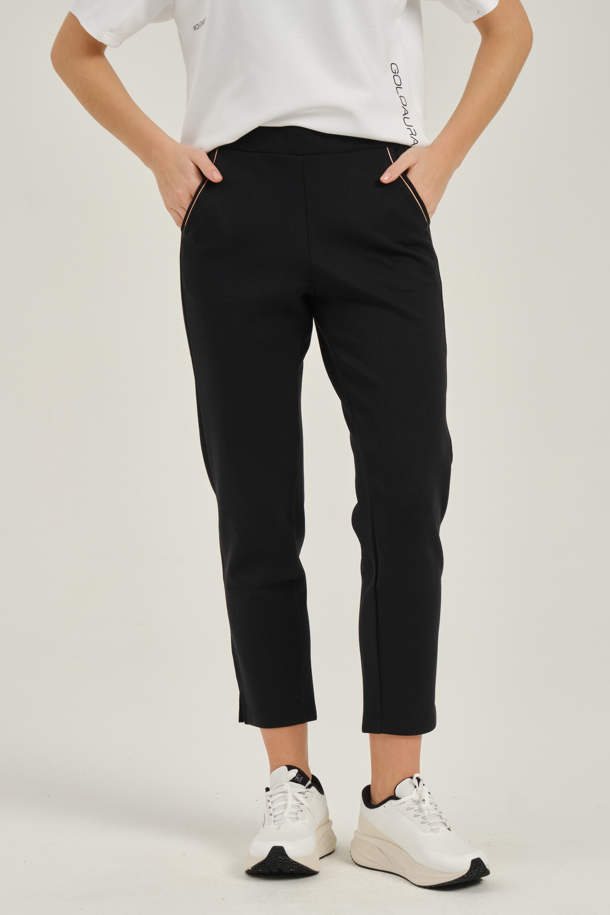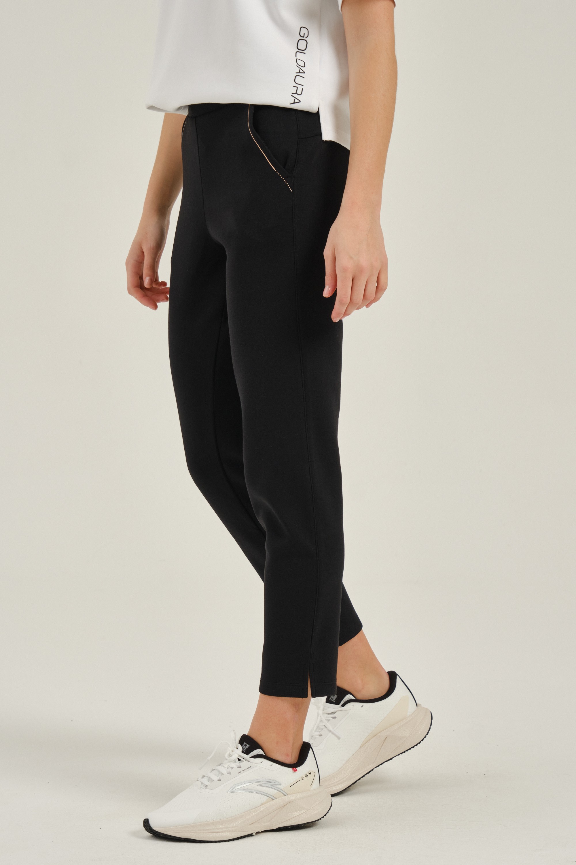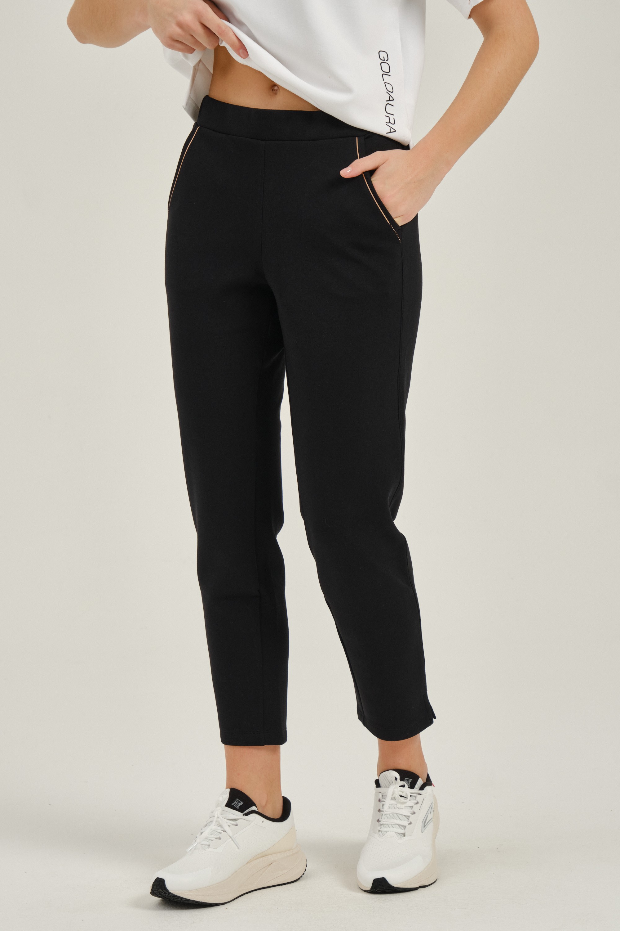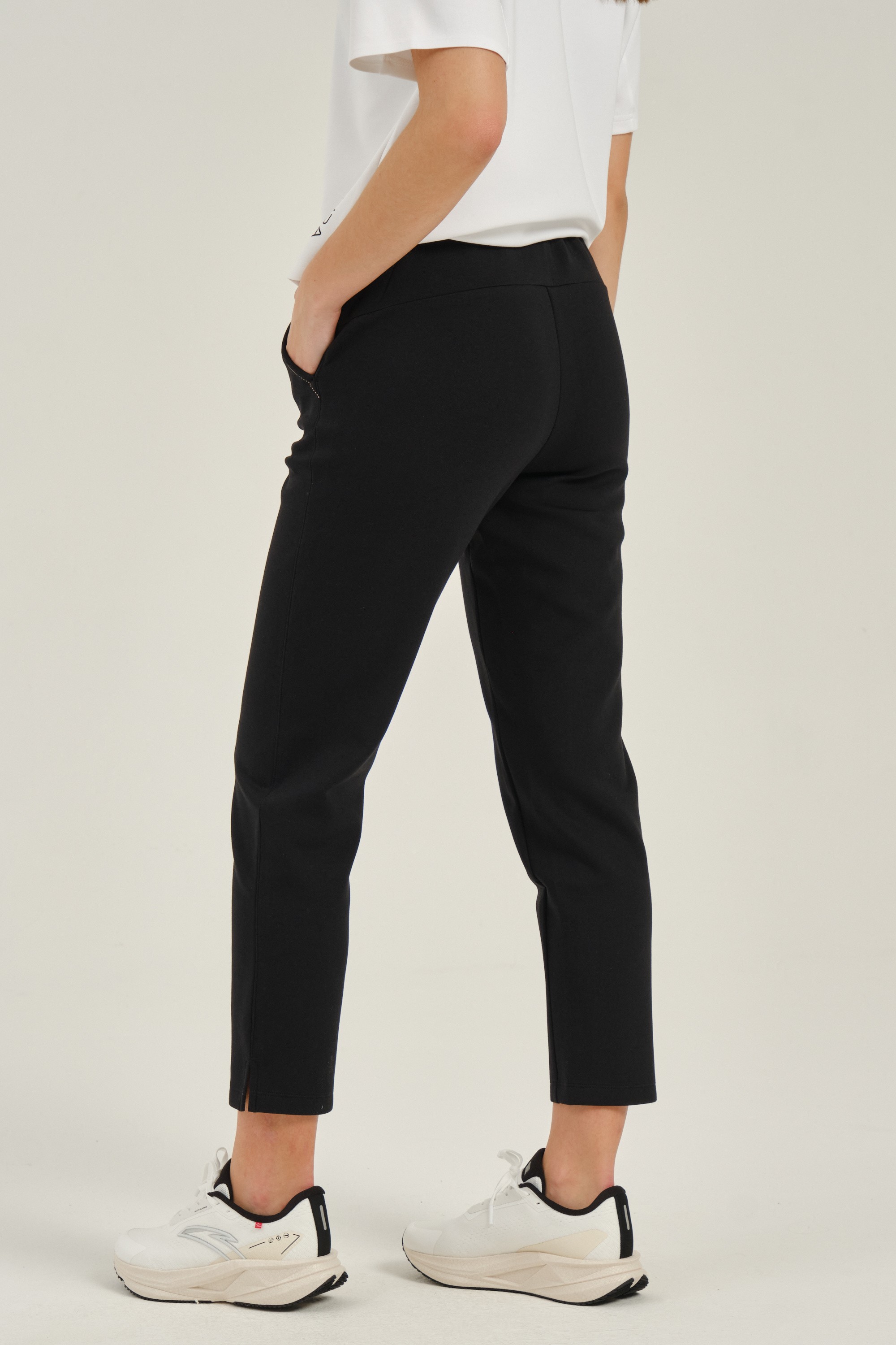Эластичный пояс со шнурком и низ брюк с разрезами делают их удобнее. Два боковых кармана помогают сохранить мелкие вещи.