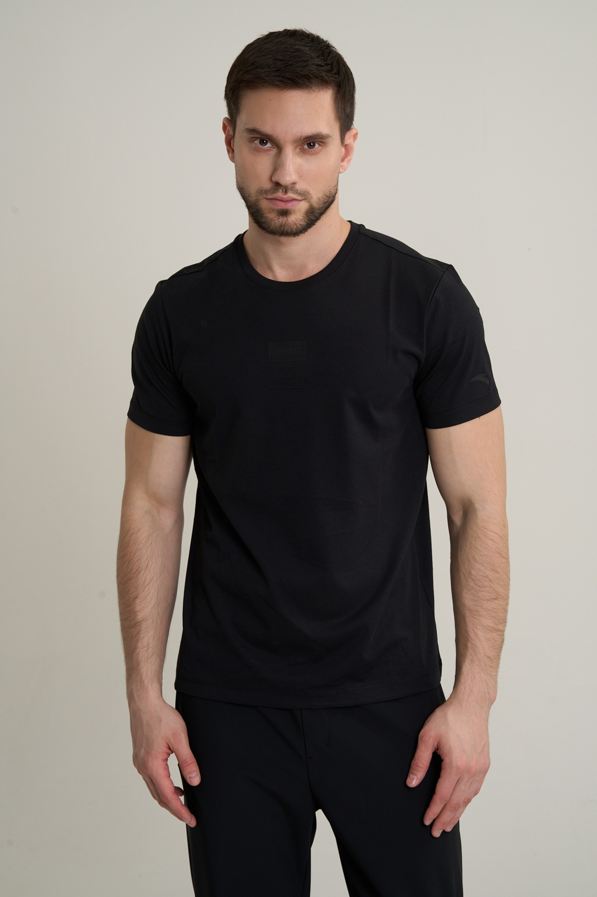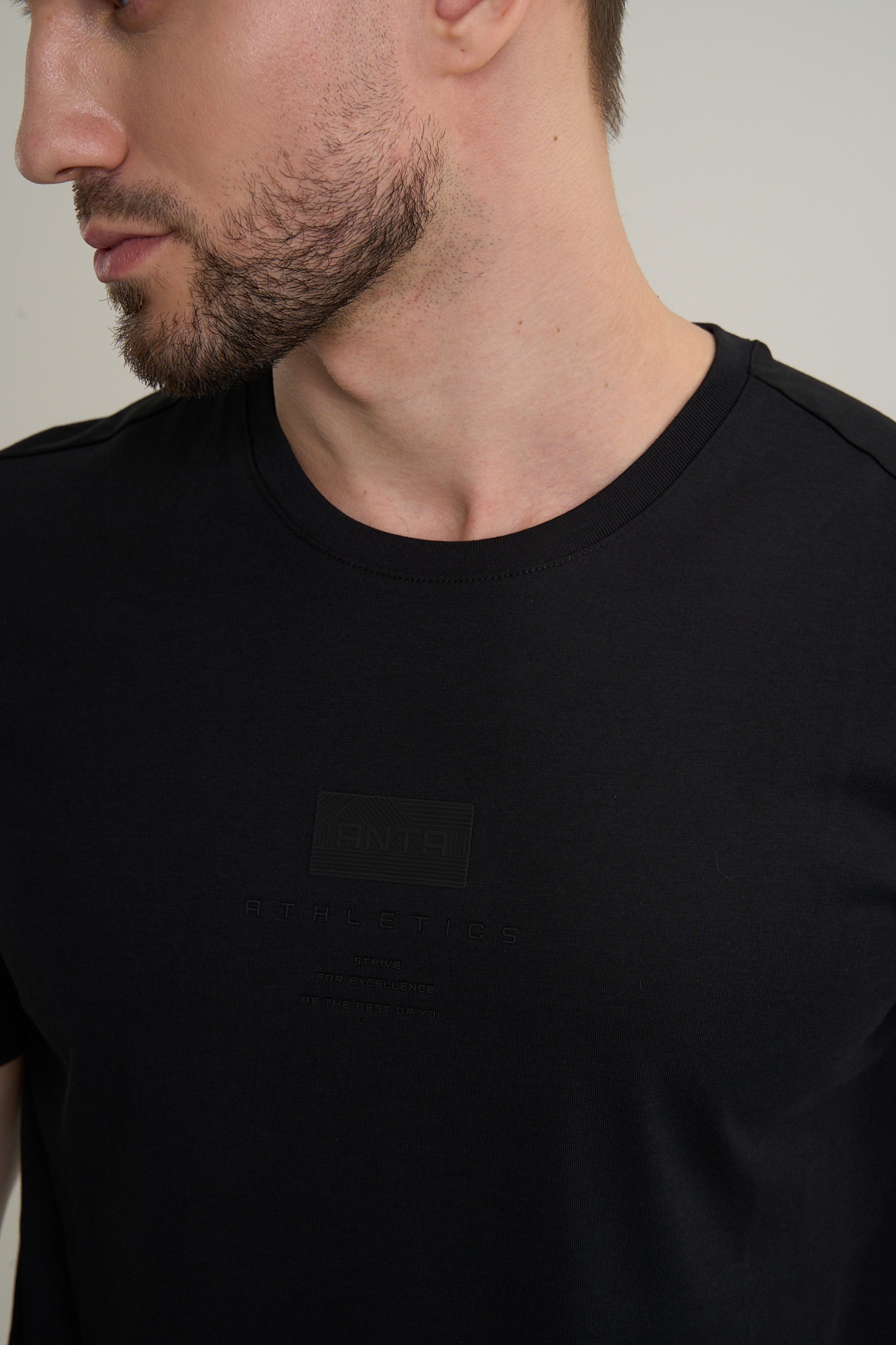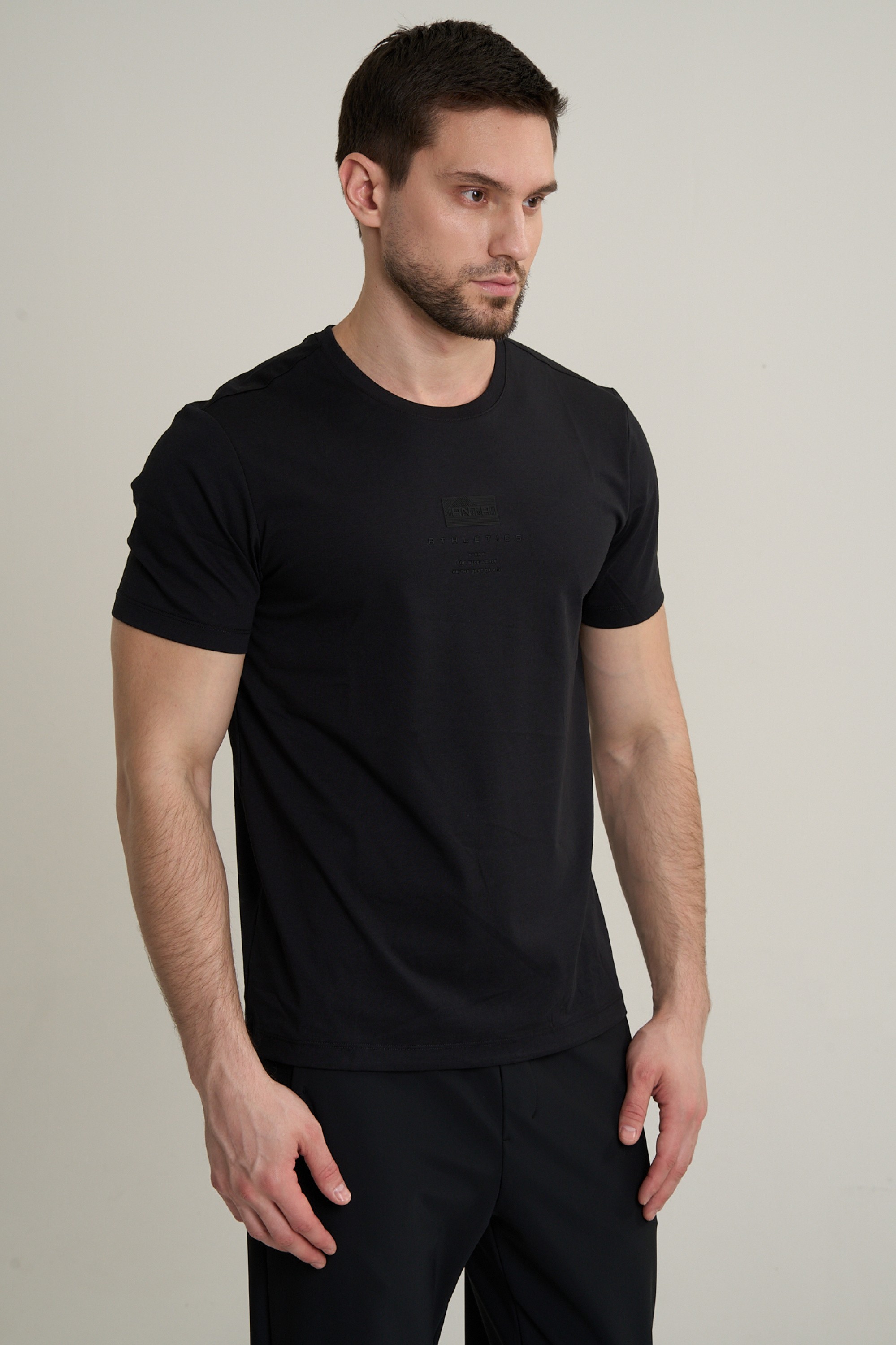 Дизайн модели воплощает осознанный минимализм и функциональную эстетику, вдохновленные гармонией современной архитектуры и природы. На груди нанесено неконтрастное название бренда ANTA, выполненное в «архитектурном» стиле, и ниже вдохновляющие девизы STRIVE FOR EXCELLENCE («Стремись к совершенству») и BE THE BEST OF YOU («Будь лучшей версией себя»). Эта графическая композиция служит не только стильным акцентом, подтверждающим премиальность исполнения, но и ежедневным мотиватором. Классический черный цвет и лаконичный дизайн без лишних деталей делает эту футболку невероятно универсальной.