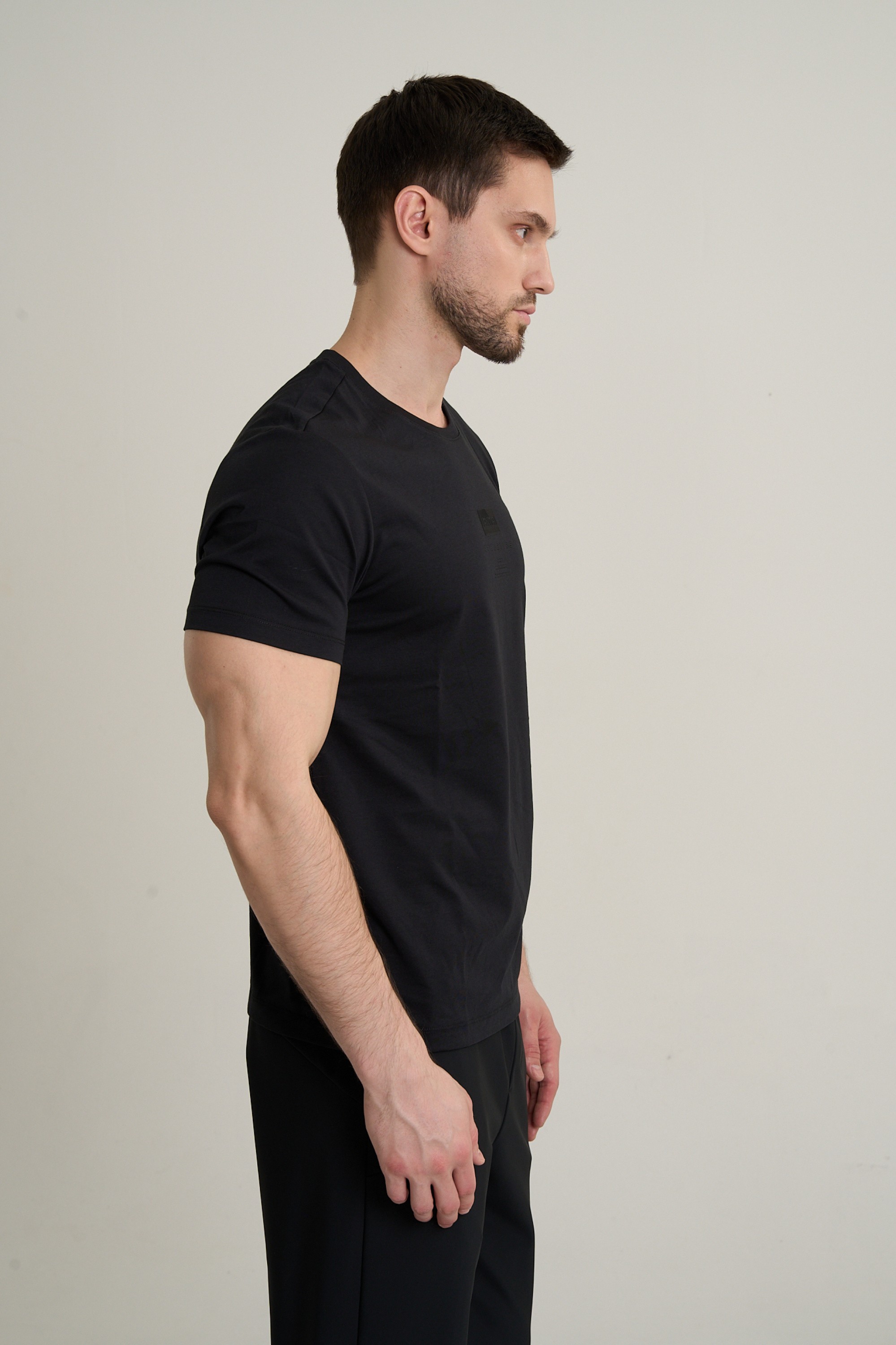Футболка изготовлена из смесового трикотажного полотна средней плотности, в котором хлопок (46%) обеспечивает натуральную мягкость и воздухопроницаемость, полиэстер (33%) отвечает за прочность и сохранение формы, а вискоза (21%) придает материалу легкую шелковистость и улучшает терморегуляцию.