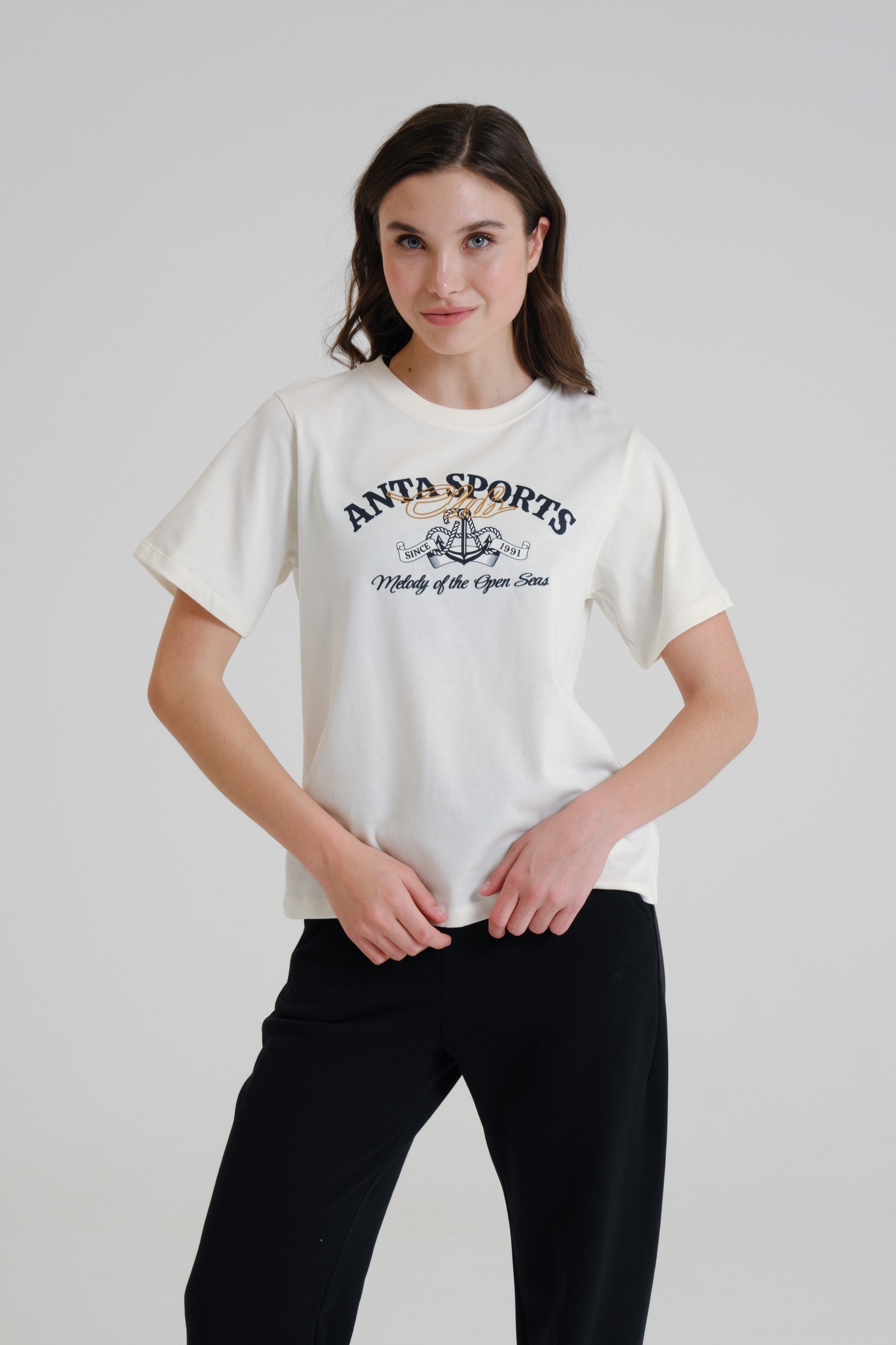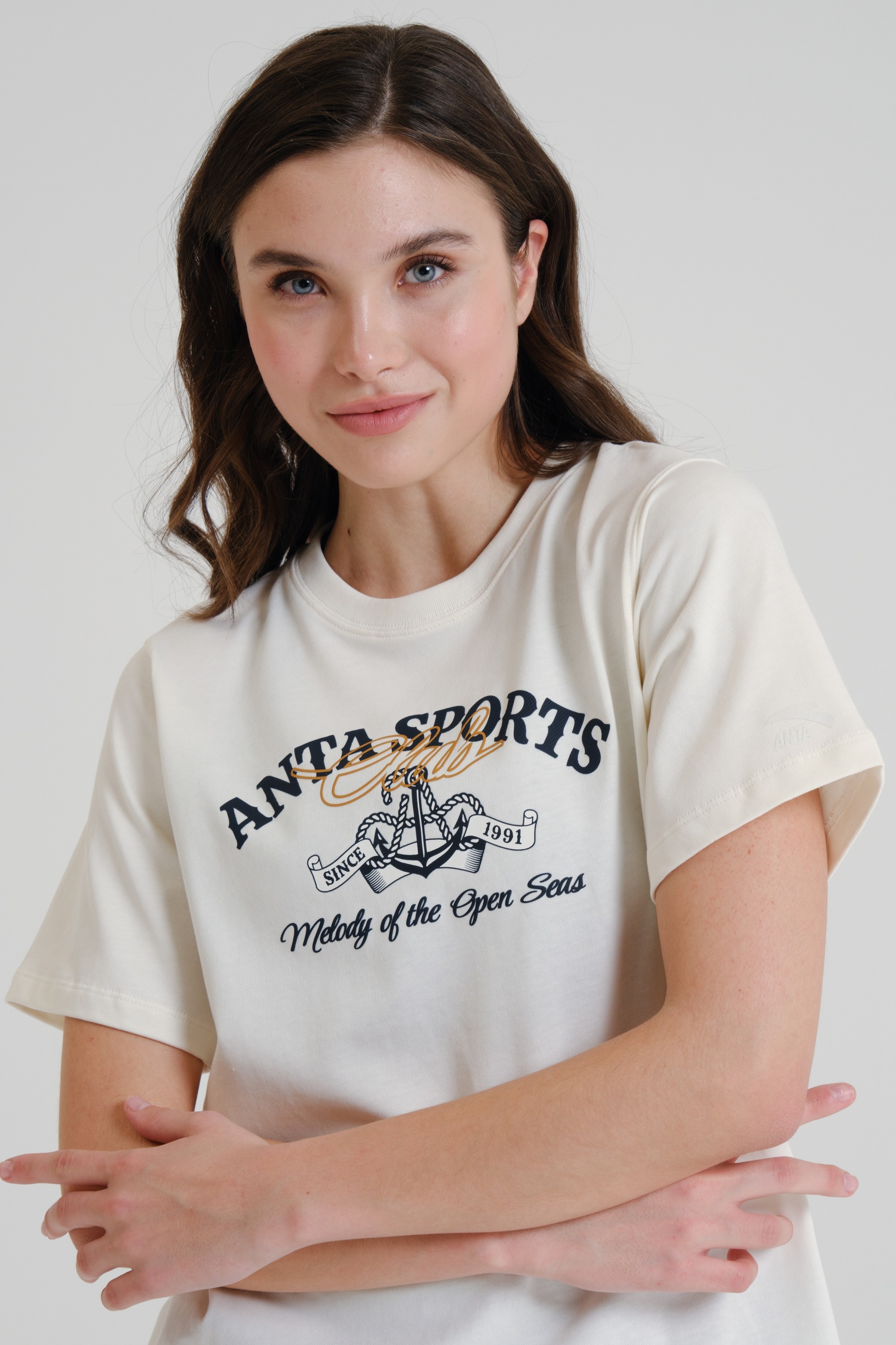 Крупный высококачественный принт на груди содержит название коллекции, дату основания бренда ANTA, а также стилизованное изображение каната и якоря.