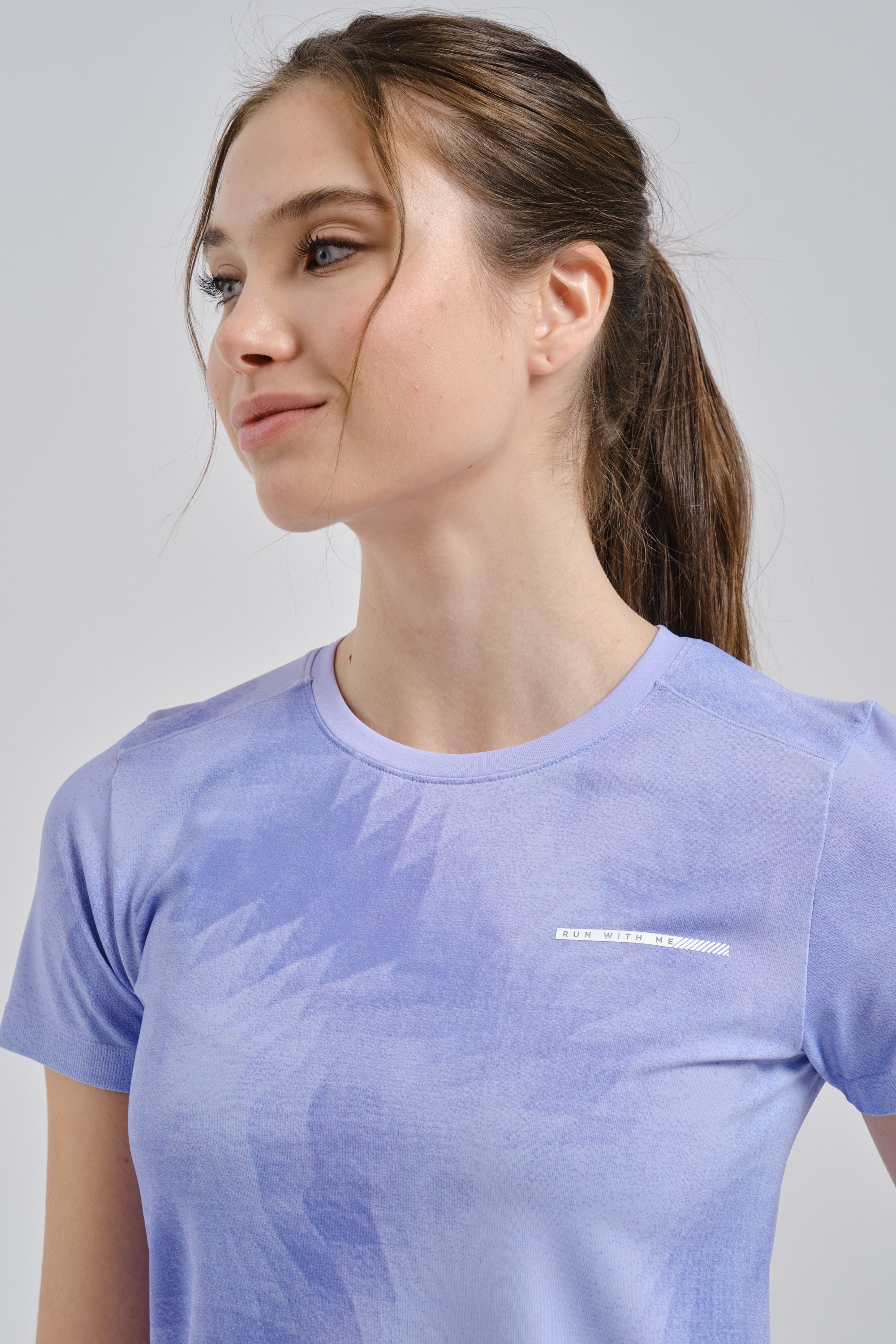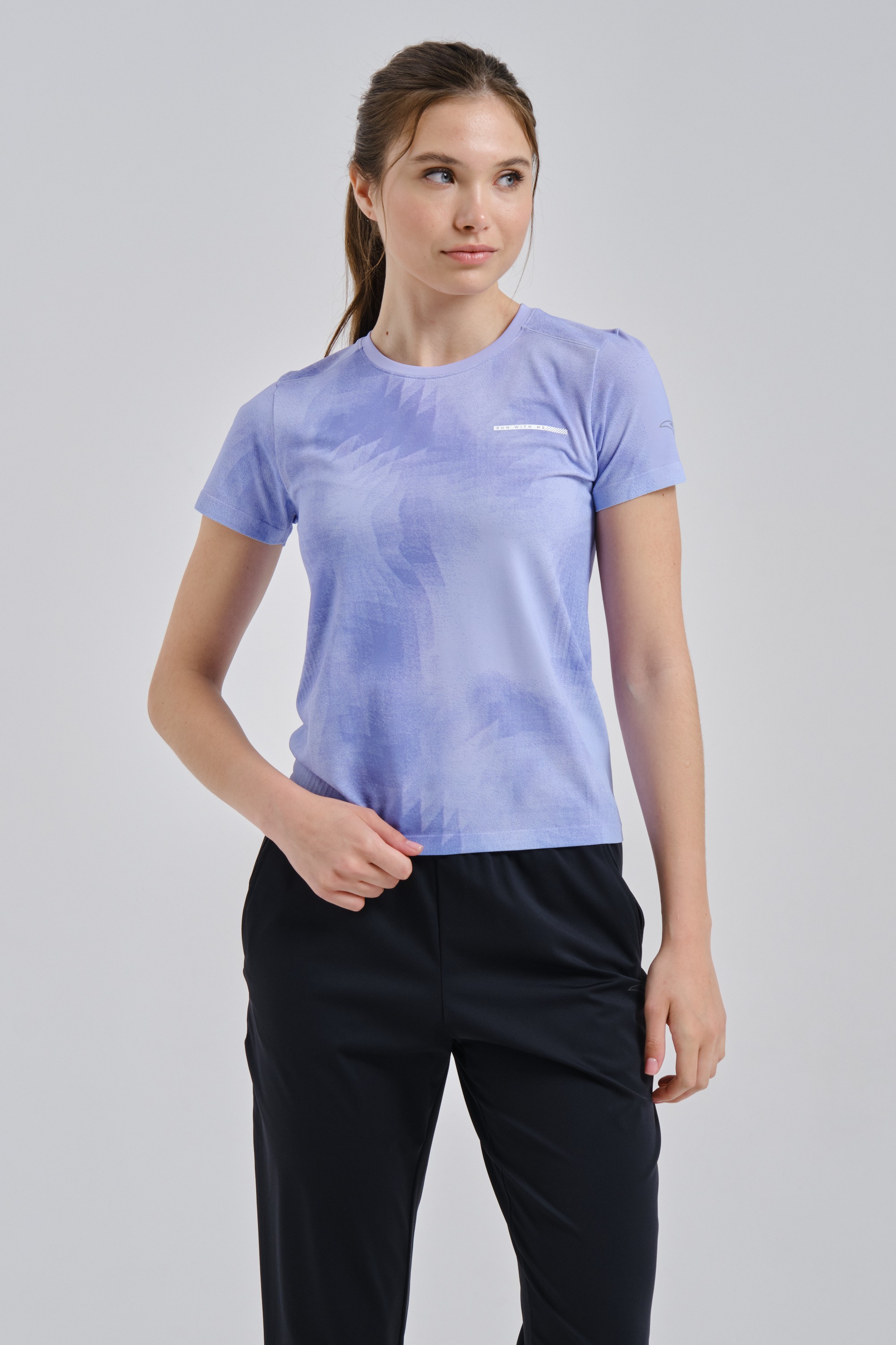 3D-принт, расположенный по всей поверхности футболки, добавляет динамики и привлекательности вашему беговому образу. На груди расположен лаконичный мотивирующий девиз RUN WITH ME. Приятный сиреневый цвет создает легкий романтичный акцент.