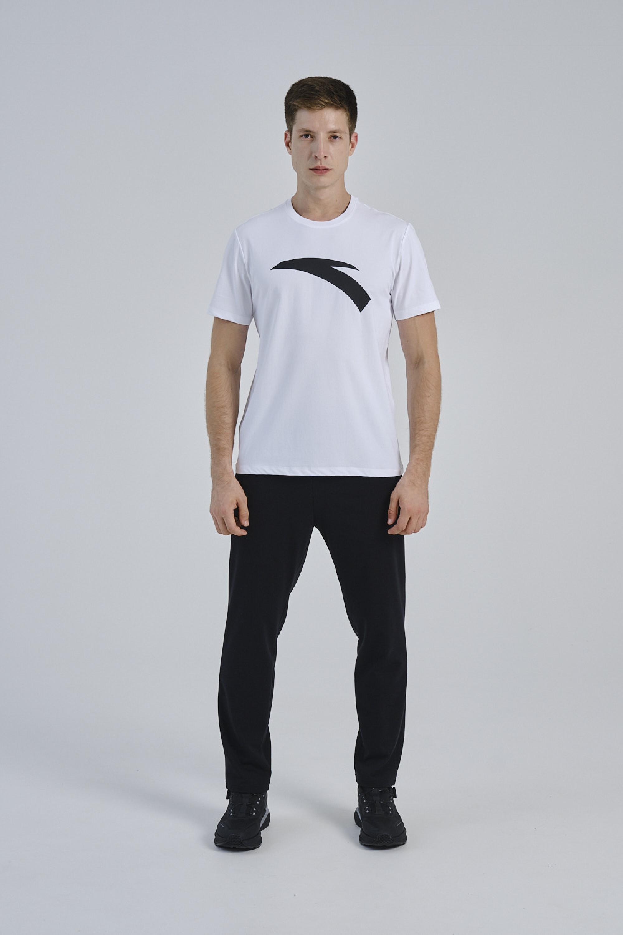 Классический крой Regular Fit гарантирует комфорт и свободу движений, делая футболку универсальной для разных спортивных активностей и городского ритма. Белый цвет подчёркнут крупным чёрным логотипом на всю грудь, придающим образу спортивную динамику и узнаваемый стиль.