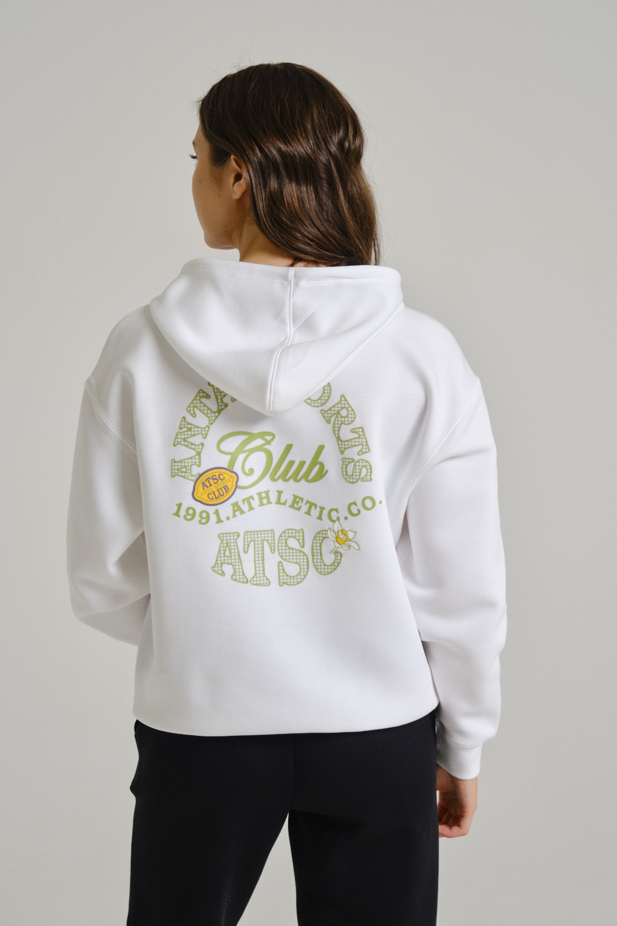 Лаконичная вышивка спереди прекрасно гармонирует с крупным принтом на спине в ретро-спортивном стиле
