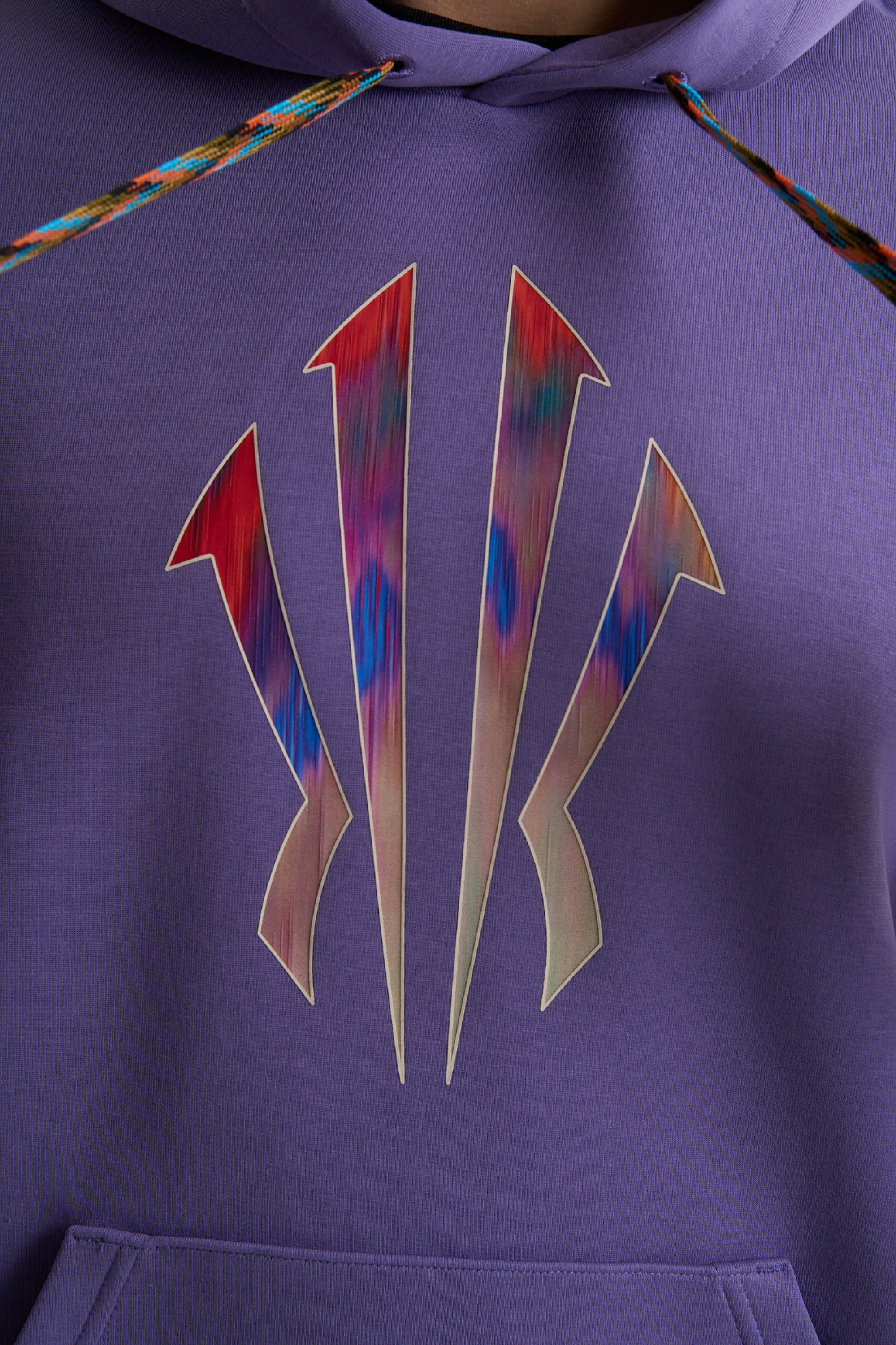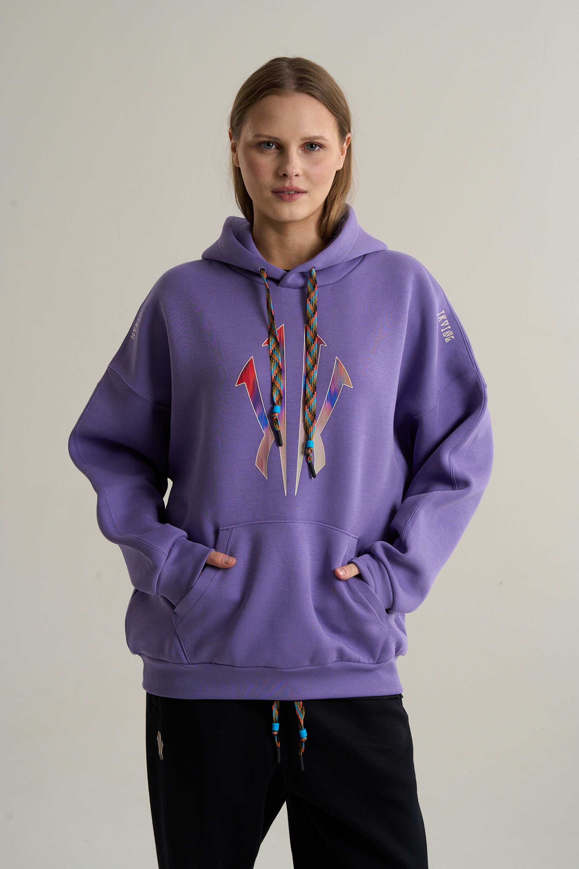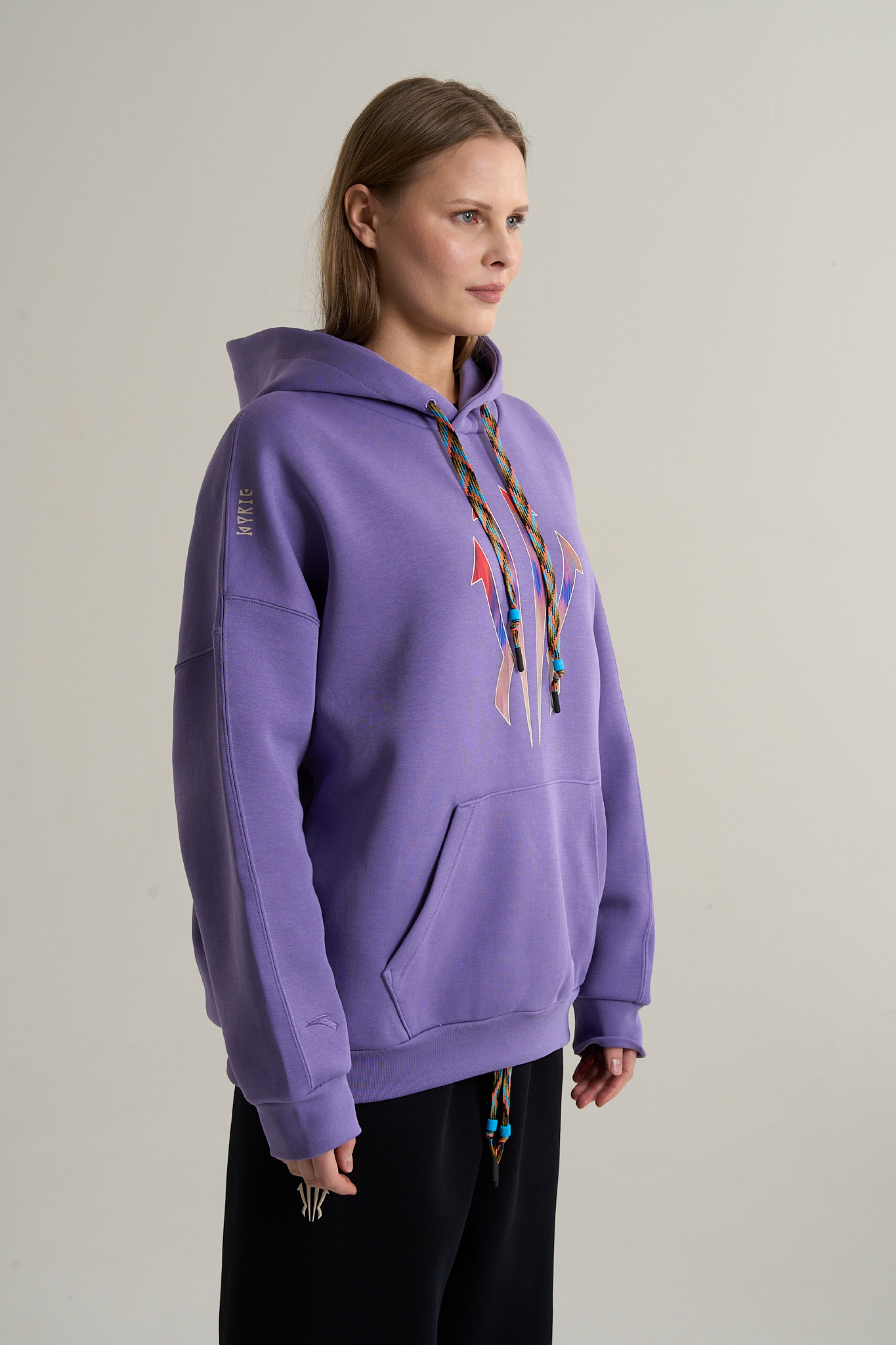 Центральным элементом дизайна является крупный полноцветный принт на груди, представляющий собой «щит Ирвинга». На плечах, размещены слова KYRIE и IRVING, выполненные уникальным шрифтом этой коллекции. Яркий принт на насыщенном фиолетовом фоне приглашает создать на основе худи многоцветный запоминающийся образ в баскетбольном стиле.