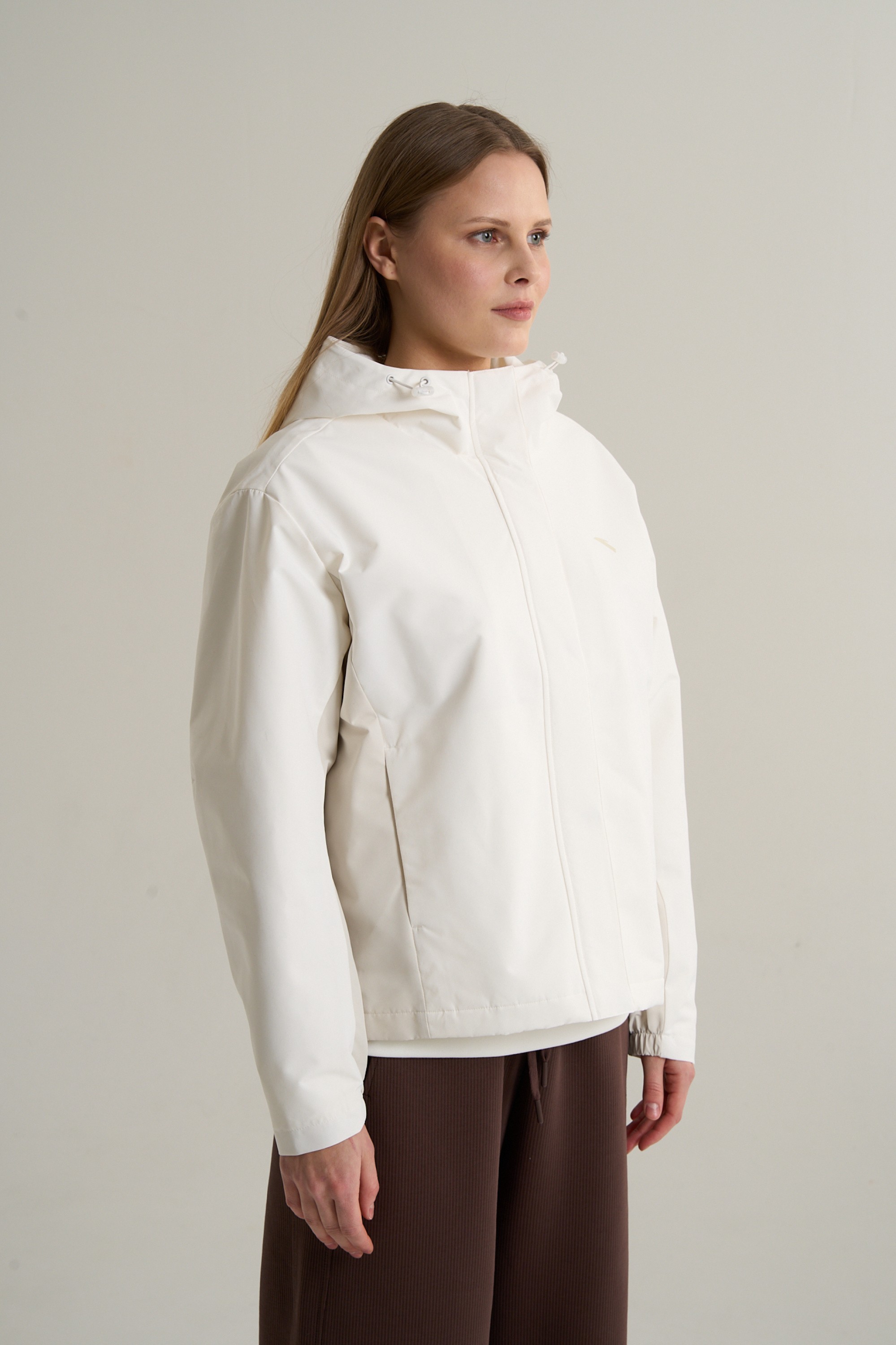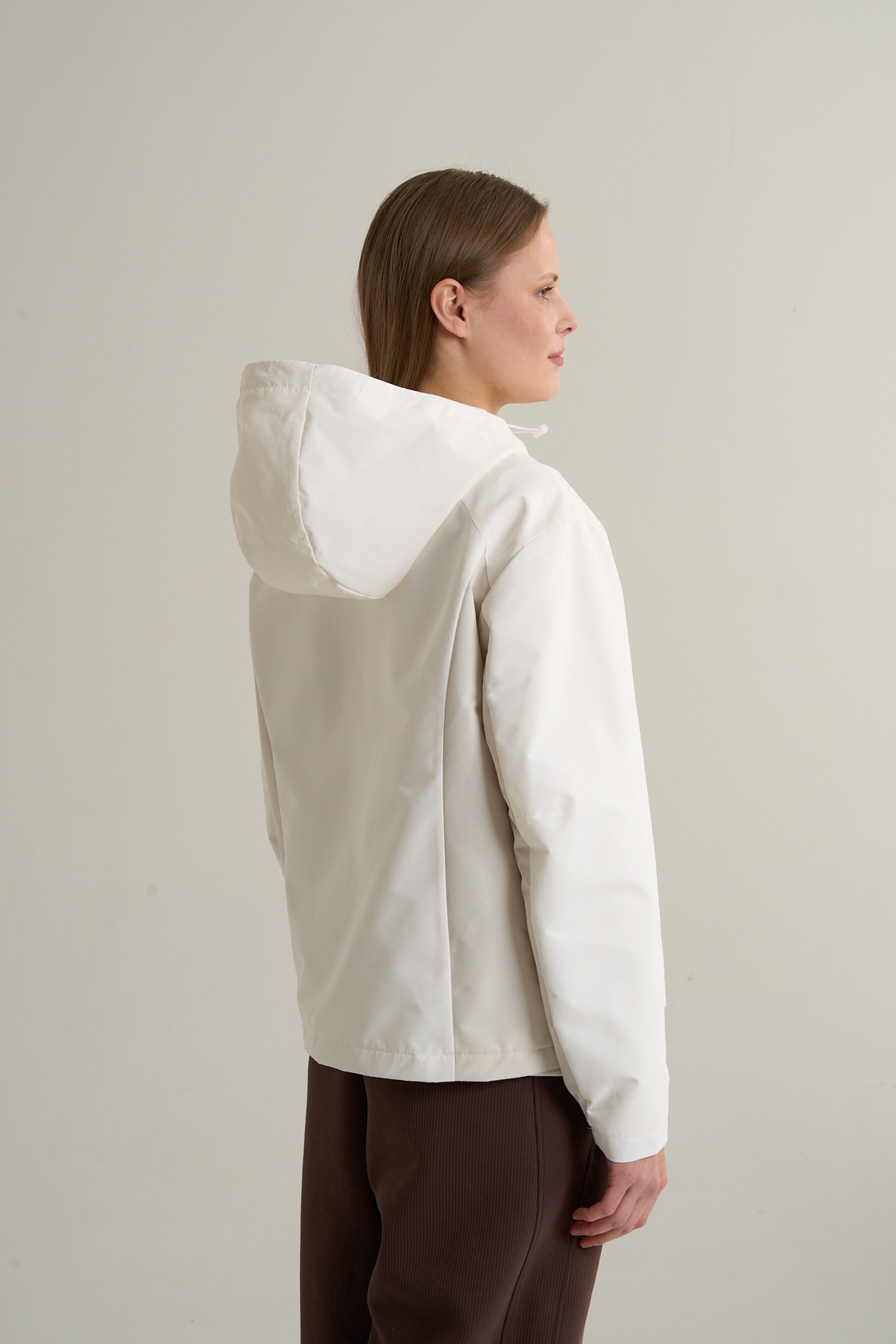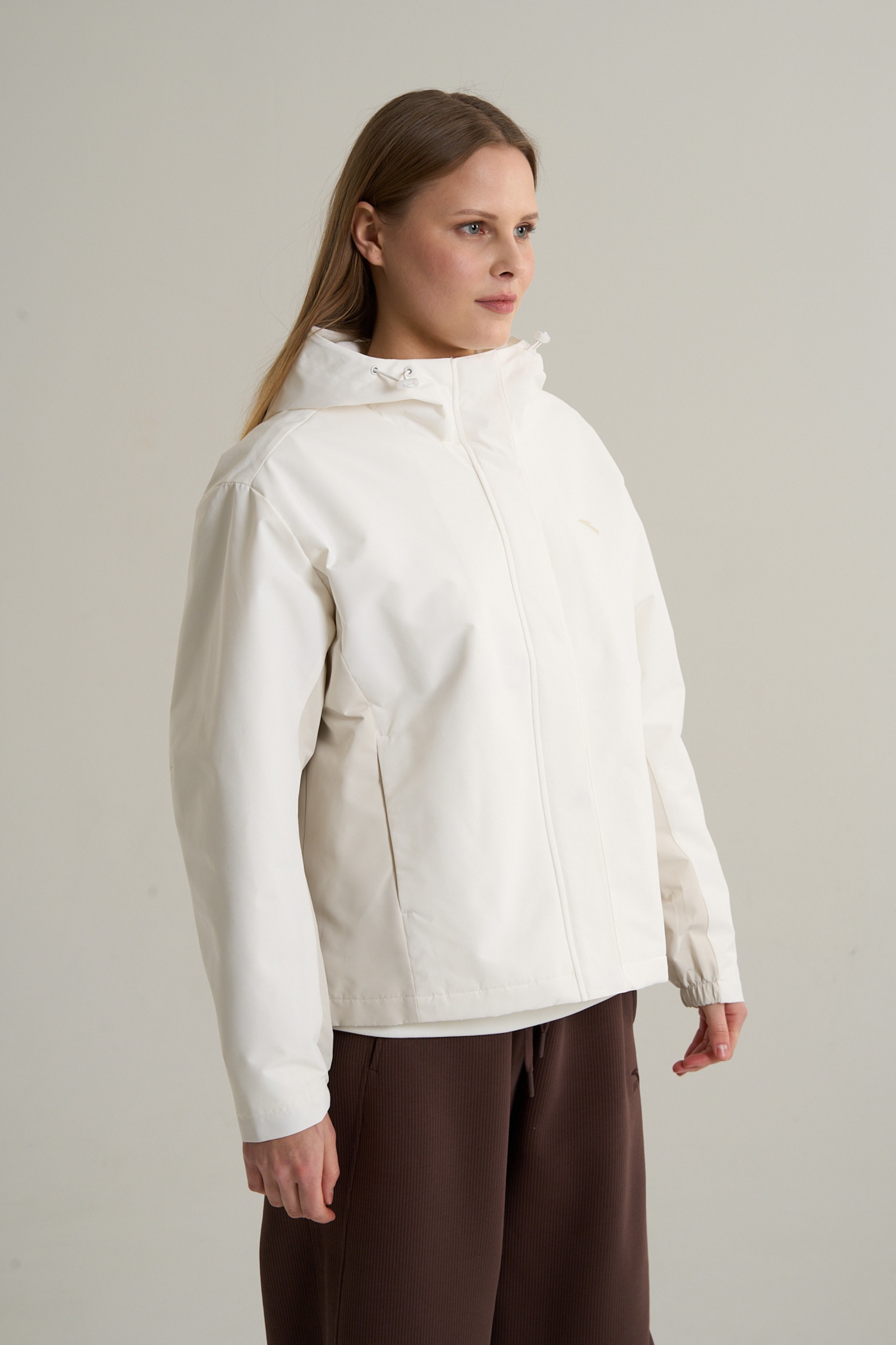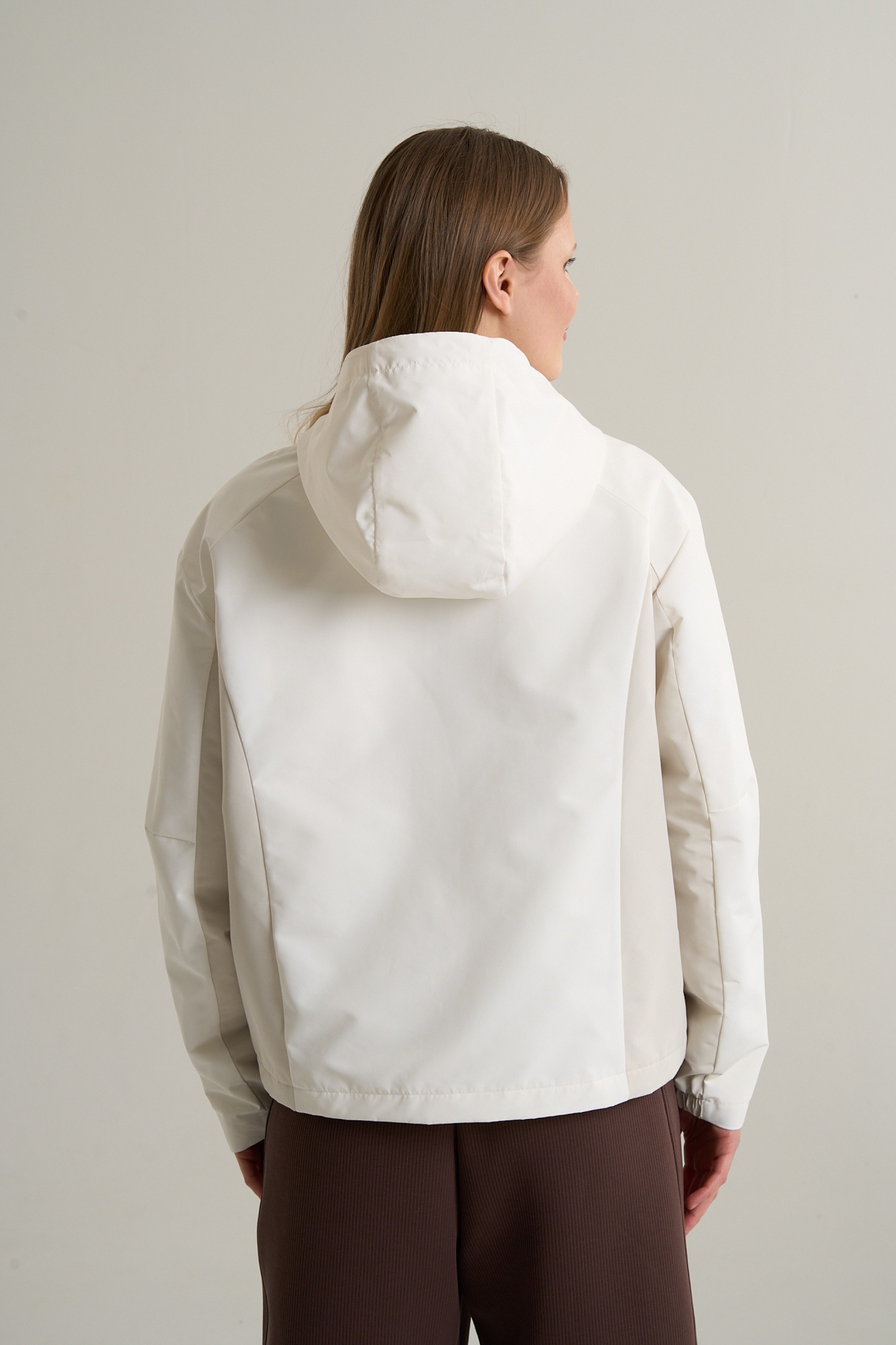 Дизайн модели воплощает осознанный минимализм и функциональную эстетику. Цветовая гамма, построенная на сочетании белого и серого, создает спокойный, цельный образ. Крупные, слабоконтрастные панели по бокам и на внутренней стороне рукавов играют с вертикальными линиями, визуально делая силуэт более стройным и динамичным. Полное отсутствие ярких акцентов и декора подчеркивает утонченность дизайна и делает куртку идеальной основой для создания монохромных или контрастных образов, в сочетании с брюками или леггинсами.