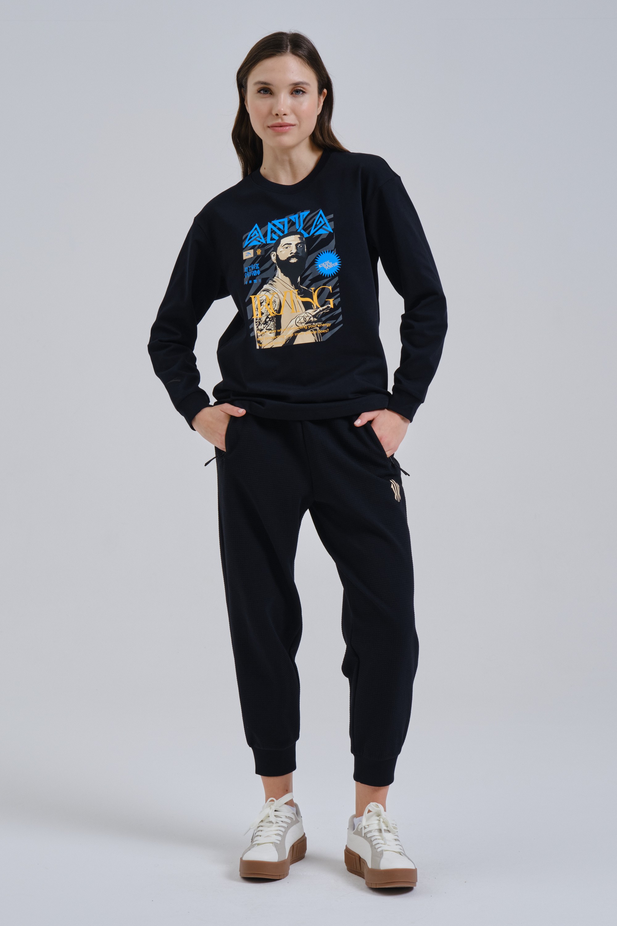 Крупный высокотехнологичный принт напоминает об огромном влиянии, которое баскетбол оказывает на уличную культуру в целом, и делает образ ярким и запоминающимся.