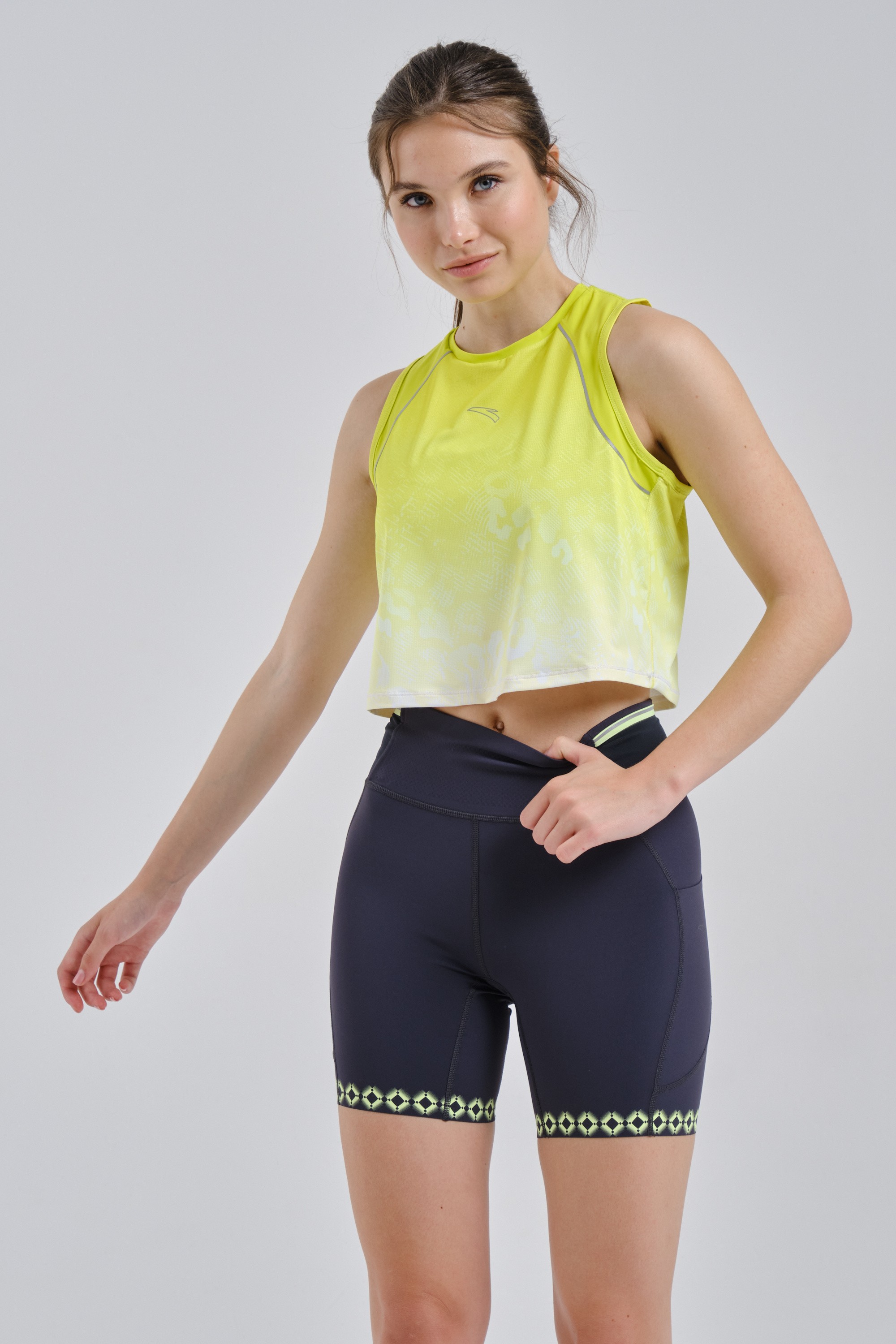 Сочетание белого и яркого неоново-зеленого цветов в динамичном сплошном принте выделит вас на трассе, а светоотражающие элементы на груди и спине улучшат видимость в темное время.
