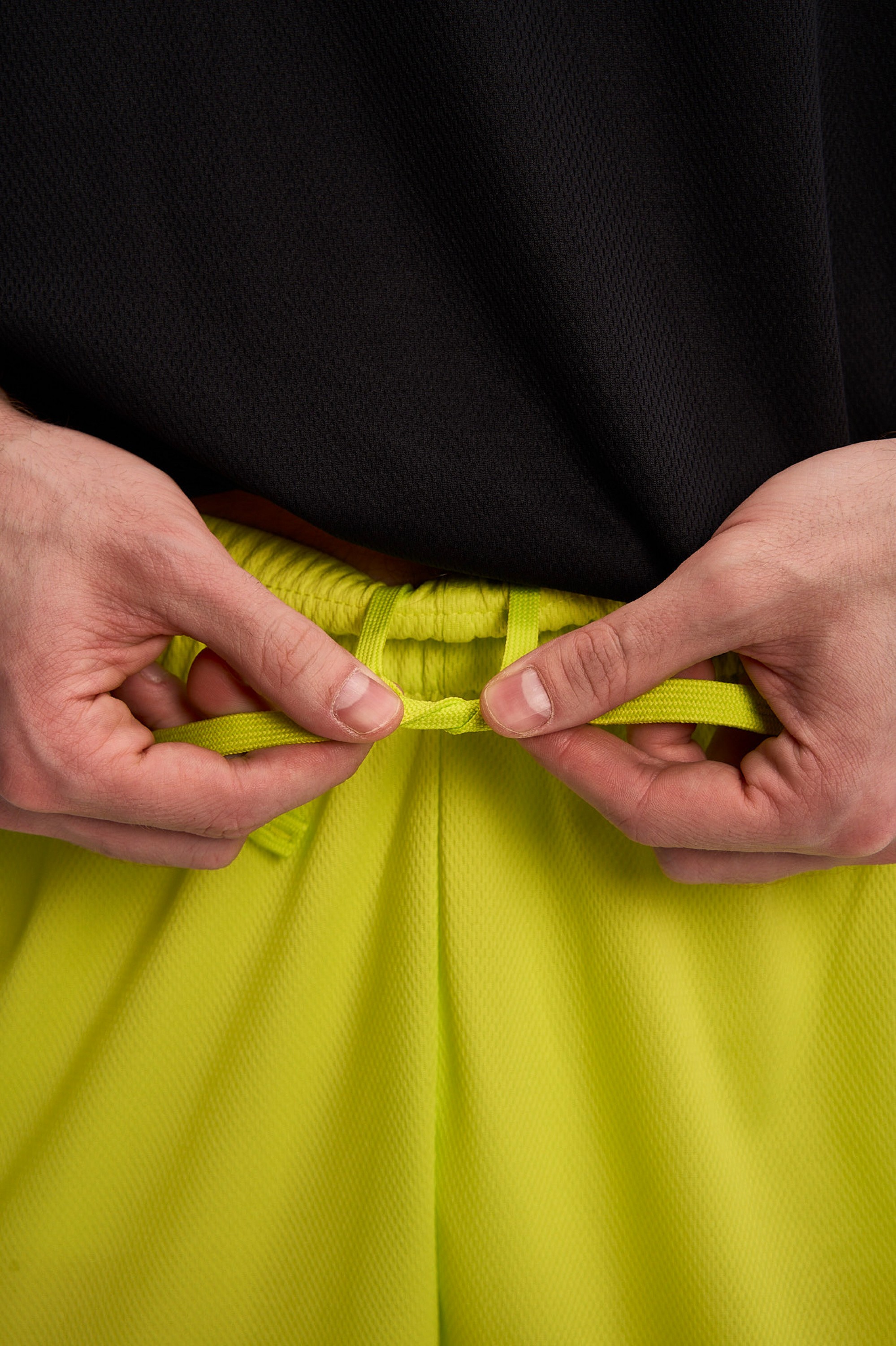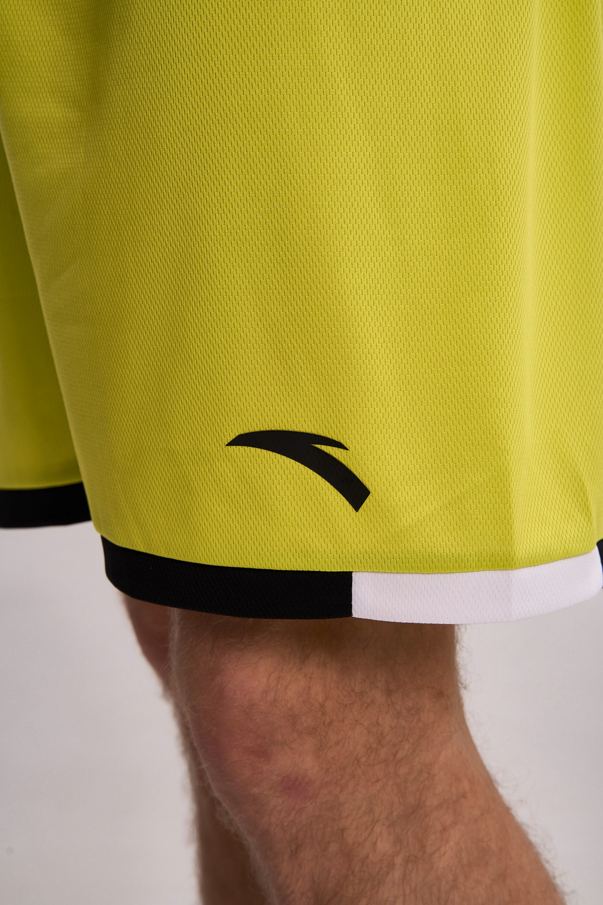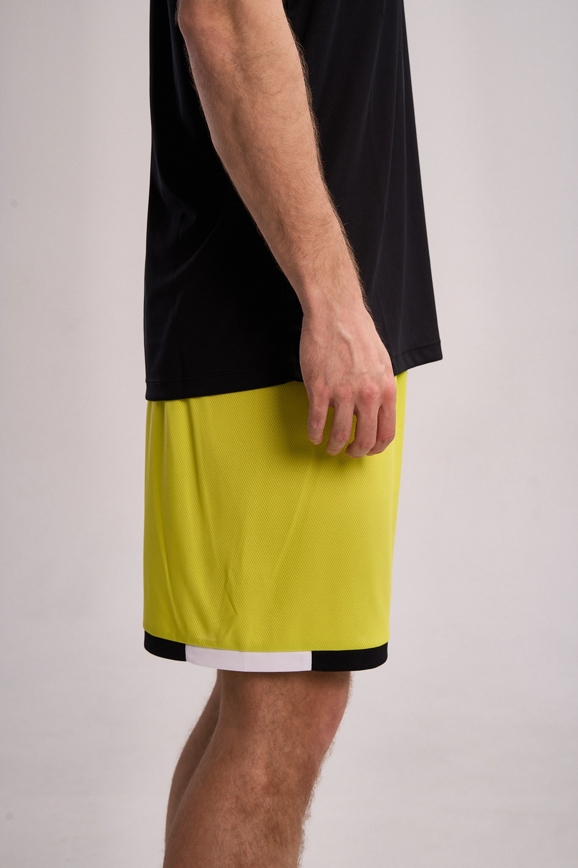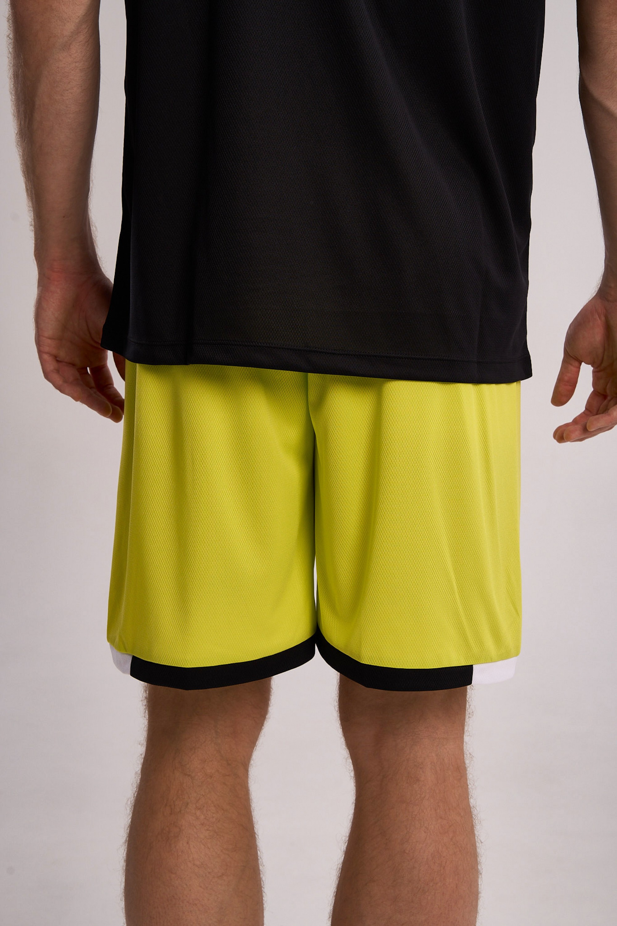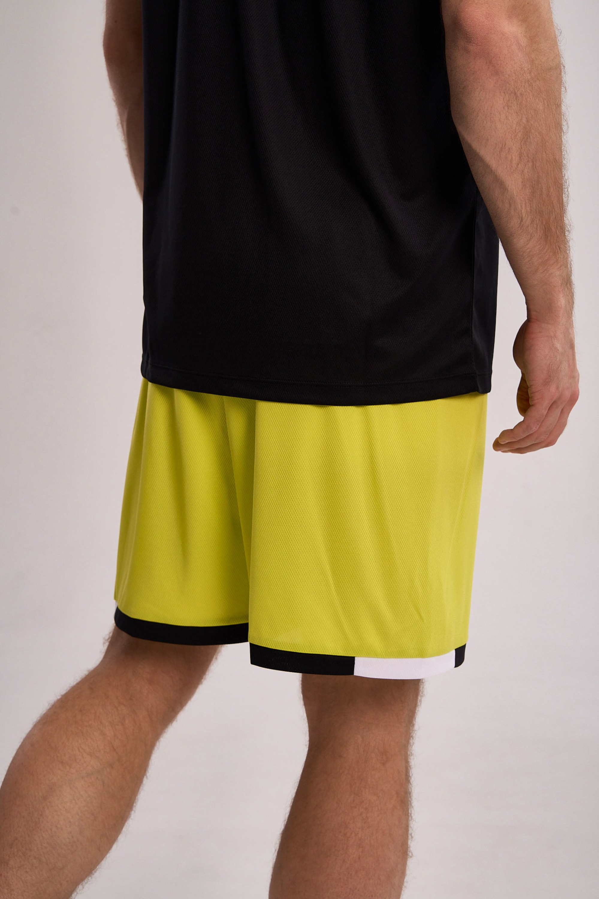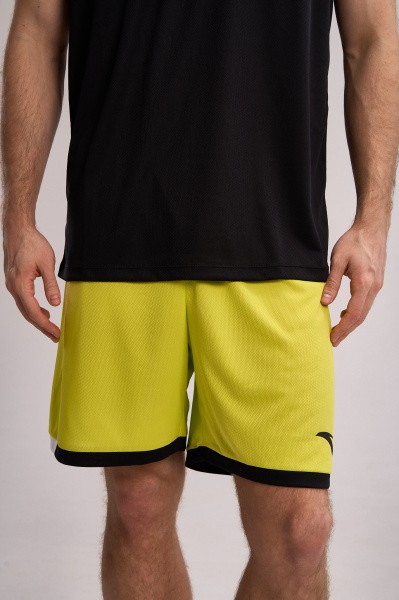 Шорты выполнены в ярком желто-зеленом цвете, украшены контрастной черно-белой окантовкой по низу, что придает образу динамичность и современный спортивный стиль.