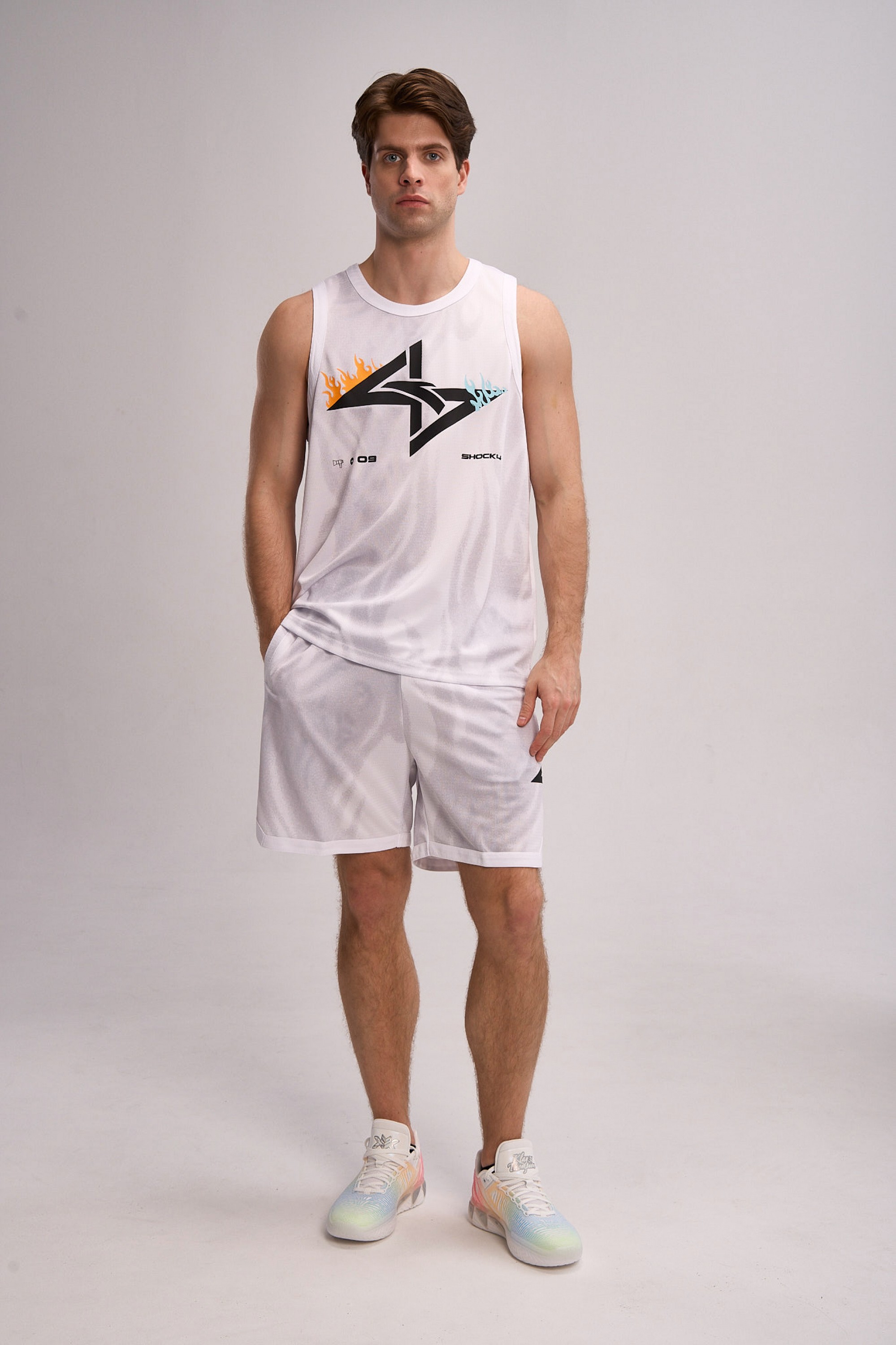 Свободный крой Relax Fit гарантирует комфорт и свободу движений на площадке. Плоские швы минимизируют риск натирания. Дизайн костюма в белом цвете вдохновлен пламенем — символом страсти, пылкости и неукротимой энергии, что отражается в ярком черно-оранжевом принте с крупным логотипом SHOCK 4.