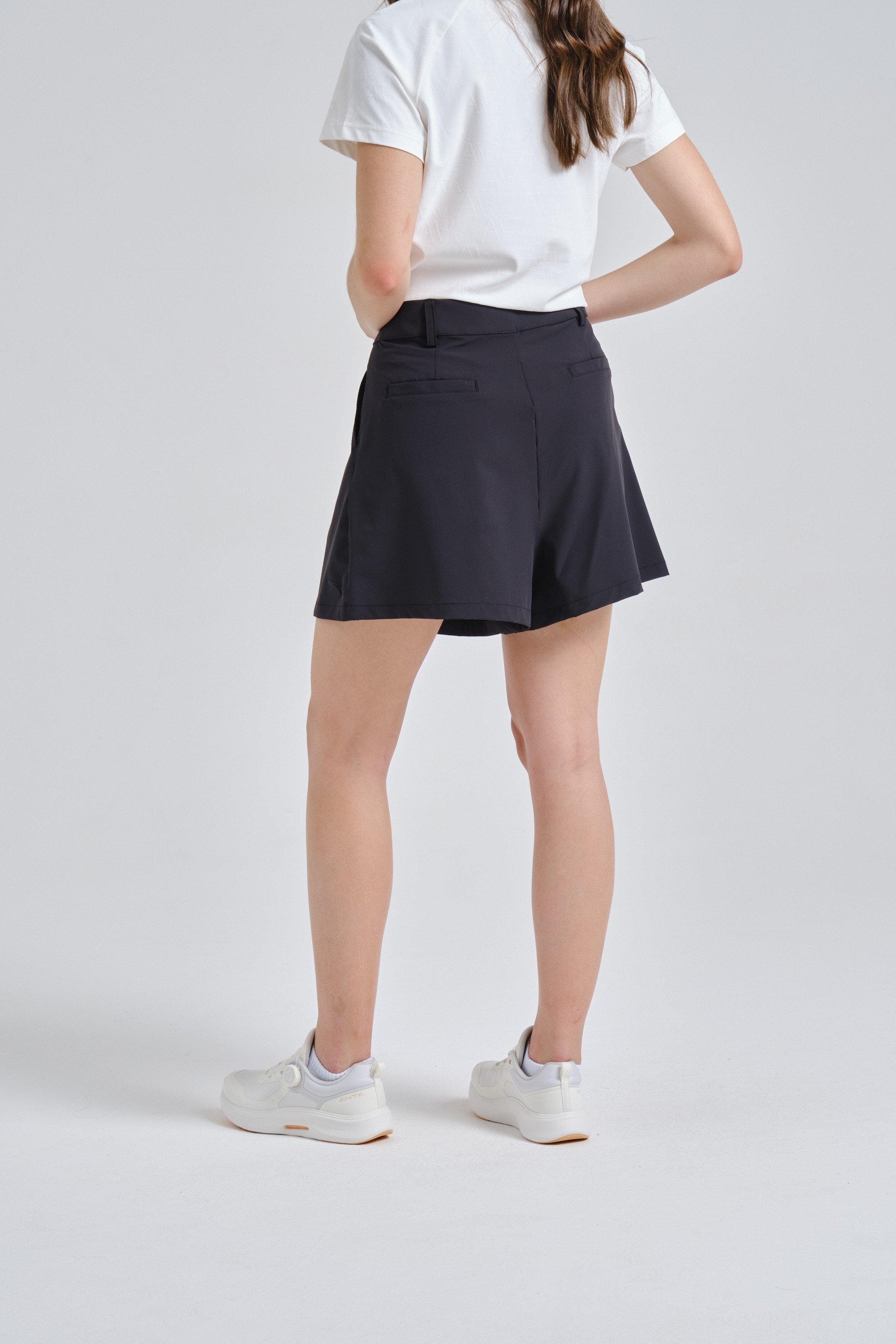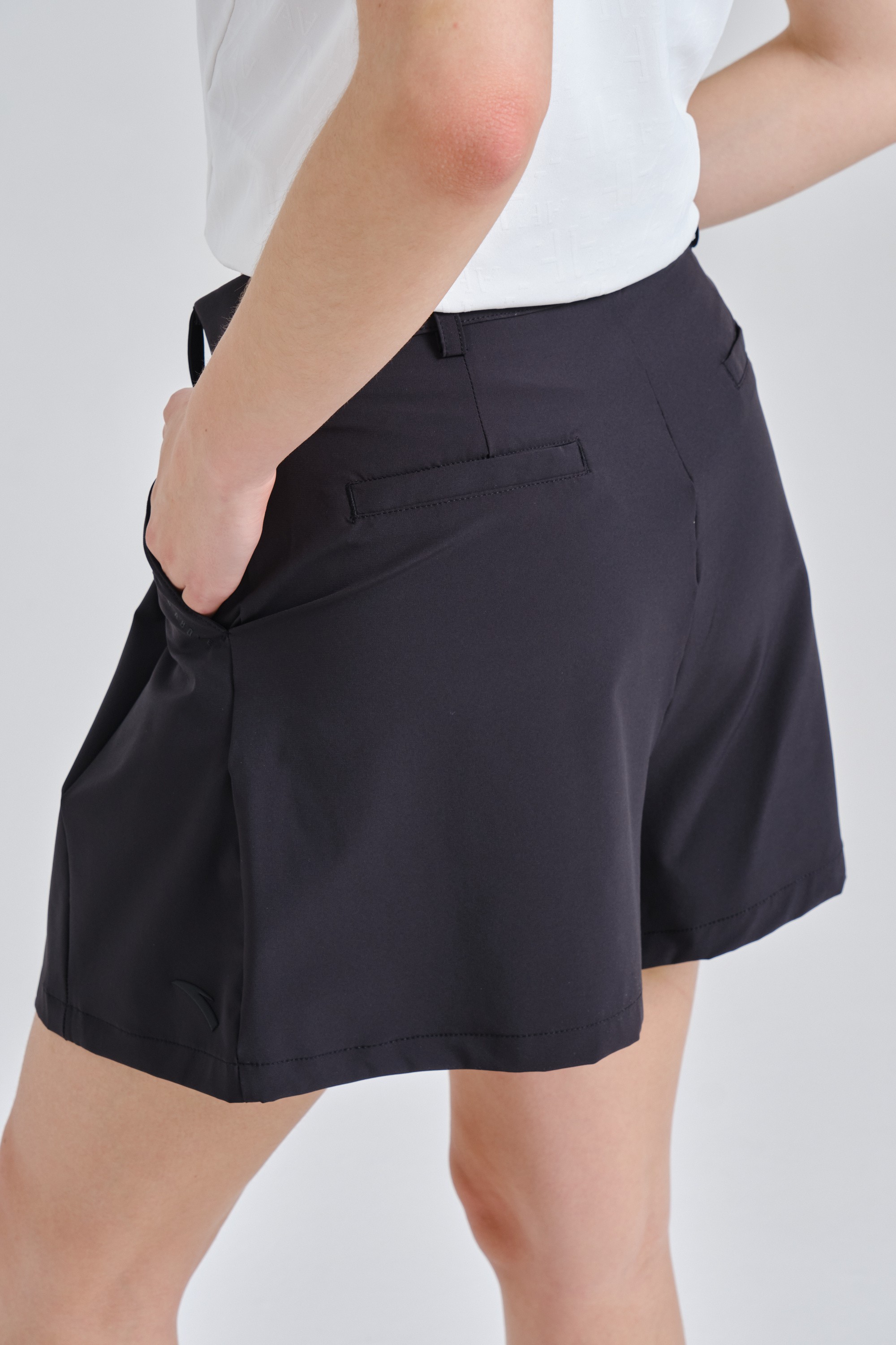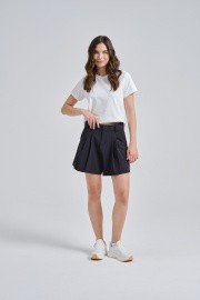 Особенностью этой модели является крой, имитирующий юбку, что придает образу женственность и оригинальность, сохраняя при этом функциональность шорт. Пояс с застежкой на пуговицу-кнопку и шлевками под ремень позволяет дополнять образ стильным аксессуаром. Два боковых кармана обеспечивают удобное хранение мелочей, а два задних кармана завершают классический силуэт. Всегда актуальный черный цвет делает эти шорты универсальным элементом вашего гардероба.