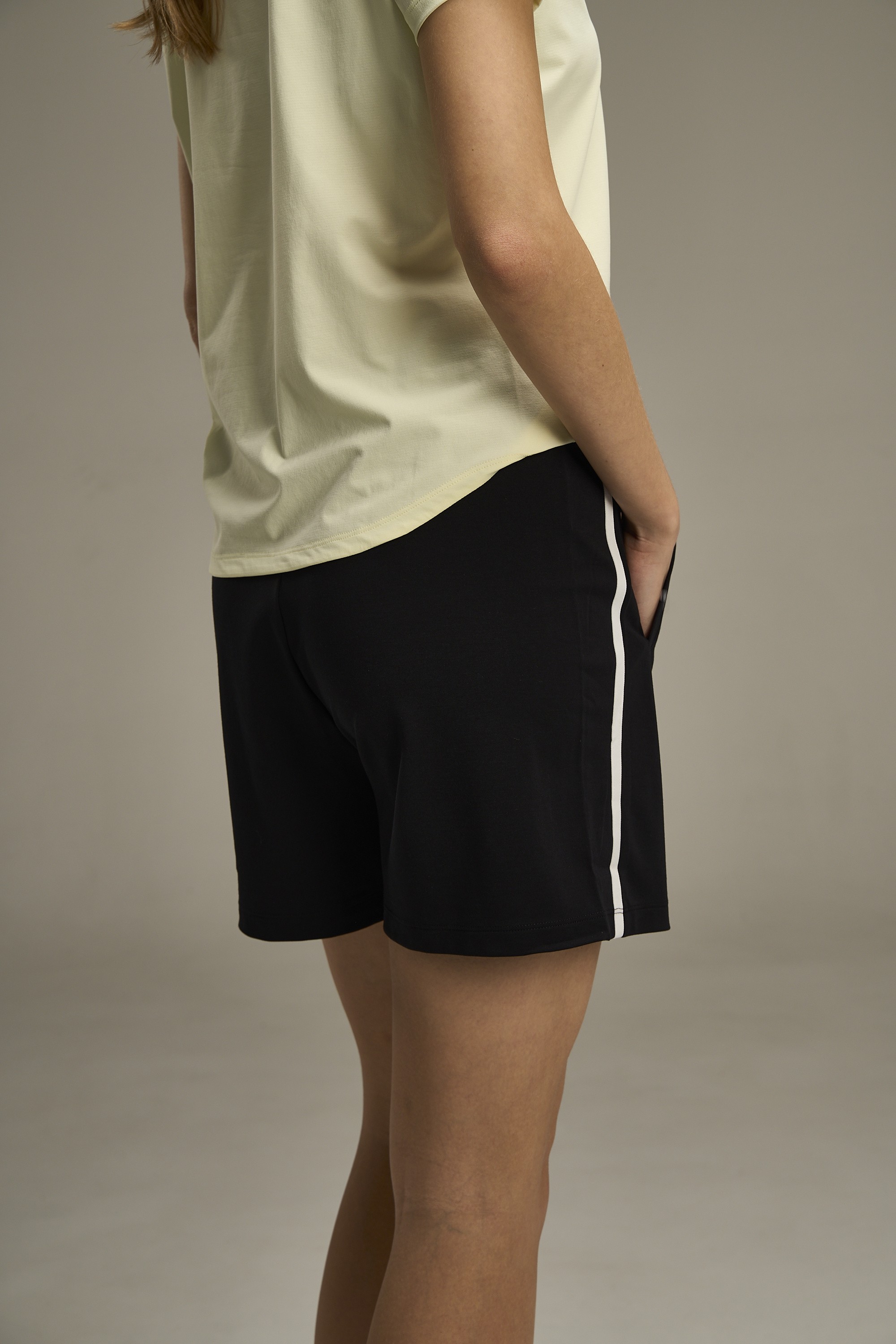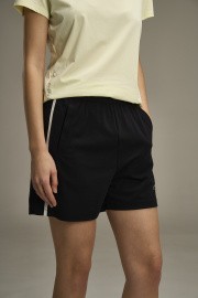 Стандартная посадка создает комфортное прилегание к телу, не сковывая движений. Эластичный пояс с внутренним регулировочным шнурком позволяет индивидуально настроить посадку на талии. Два боковых кармана обеспечивают удобное хранение мелочей. Стильные контрастные лампасы по бокам придают образу динамику с небольшой долей ретро. Классический черный цвет делает эти шорты универсальным элементом вашего повседневного гардероба.