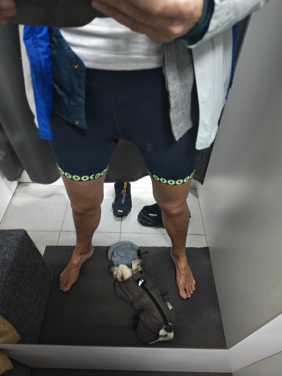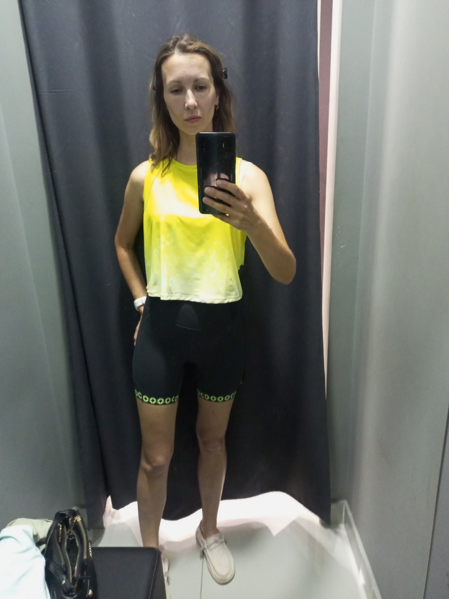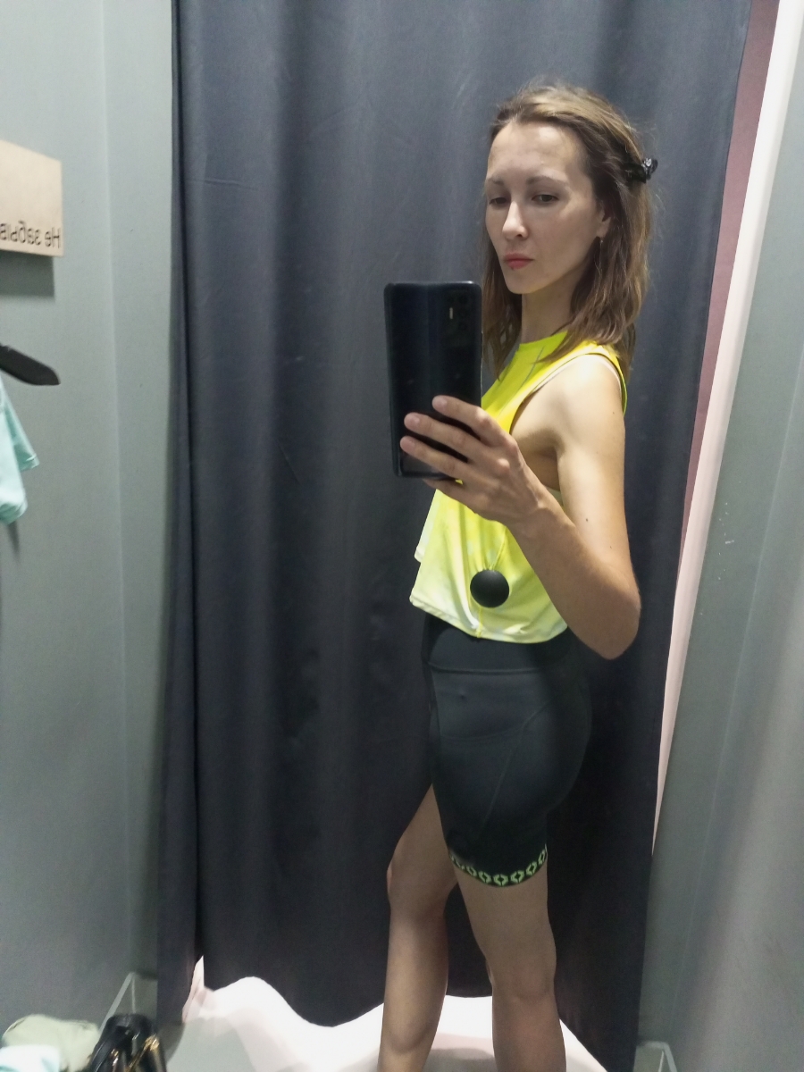 на фото в майке размер велосипедок XS -трещали на мне по швам в буквальном смысле).. (август 2025 фирменный магазин бренда), тогда я не купила из-за цены, но очень хотела. Взяла только теперь, со скидкой, уже на озоне, но и размеров к выбору не осталось. Самый маленький доступный был только L. Оставила, тем более что взяла ещё и майку. Сели, да свободноваты, не трещат)) - фото в куртке.