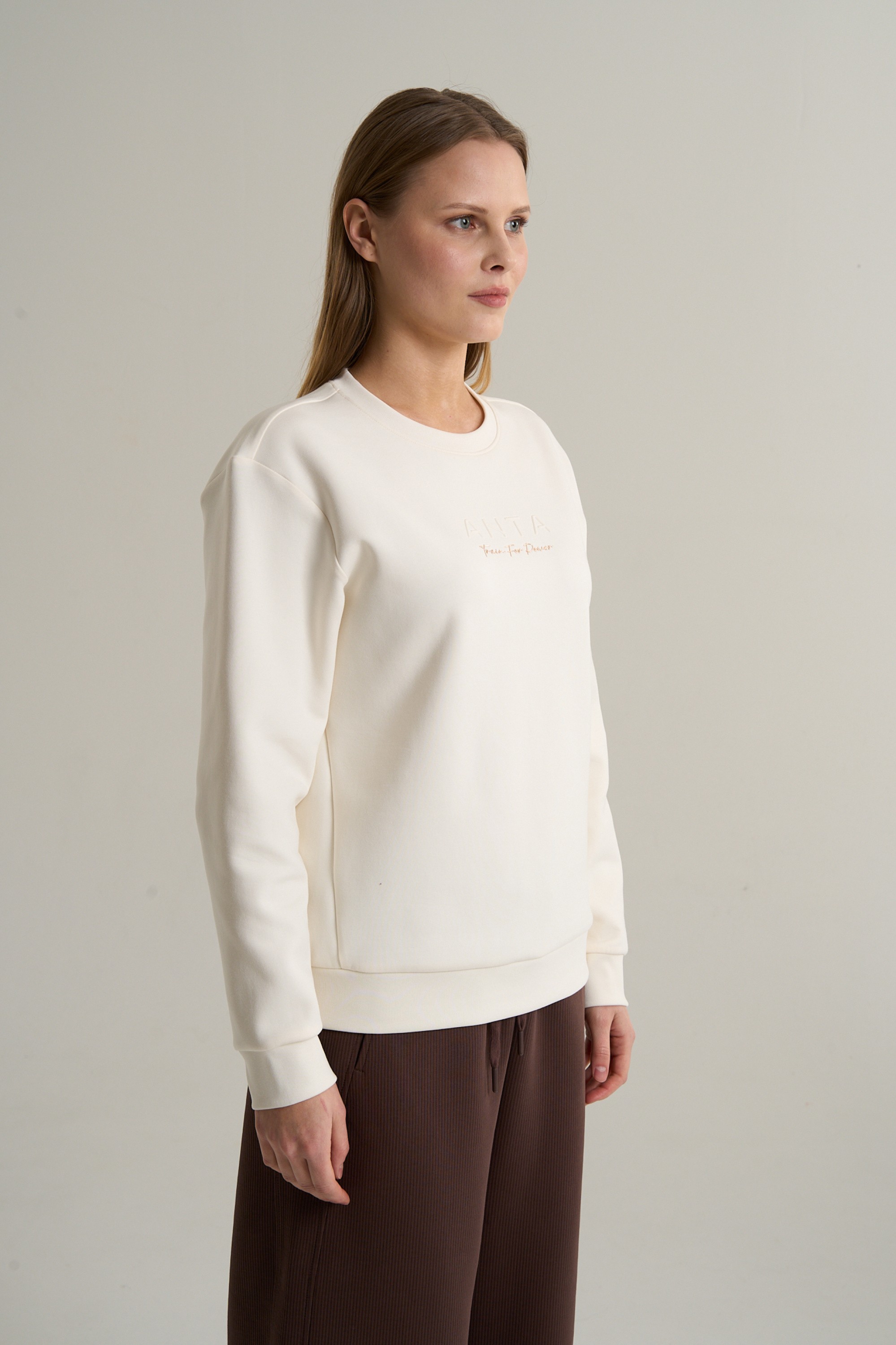 Свитшот изготовлен из высококачественного смесового трикотажа, где экологичные и технологичные волокна работают сообща. Полиэстер (48%) обеспечивает прочность и сохранение формы, хлопок (32%) дарит натуральную мягкость, а вискоза (14%) добавляет материалу благородную гладкость и улучшает его «дыхание». Добавление эластана (6%) создает необходимую эластичность. Полотно создано с использованием экологичной вискозы ECOCOSY, что подчеркивает ответственный подход бренда ANTA к сохранению окружающей среды.