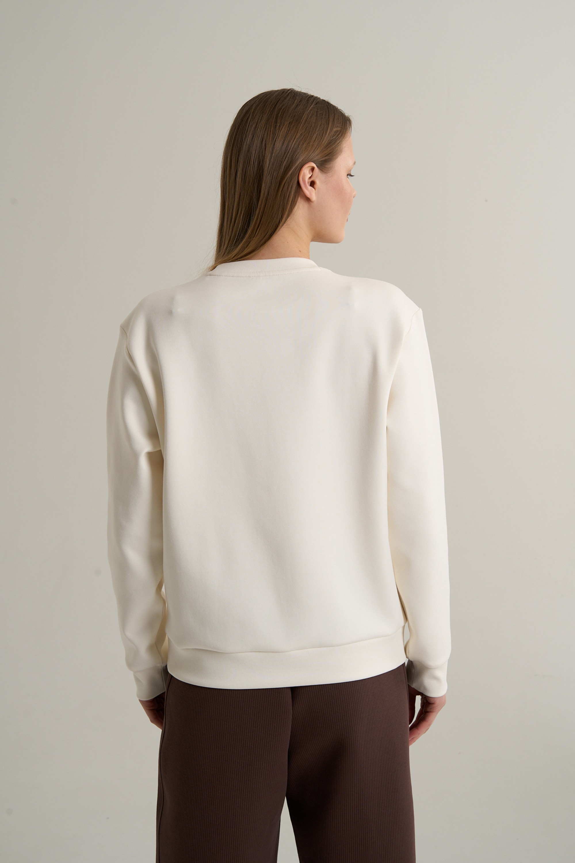 Свободный, но не объемный силуэт обеспечивает легкость движений. Круглый вырез горловины, укрепленный киперной лентой, сохраняет свою форму. Широкие трикотажные манжеты и низ добавляют ощущение уюта и завершают лаконичный образ.