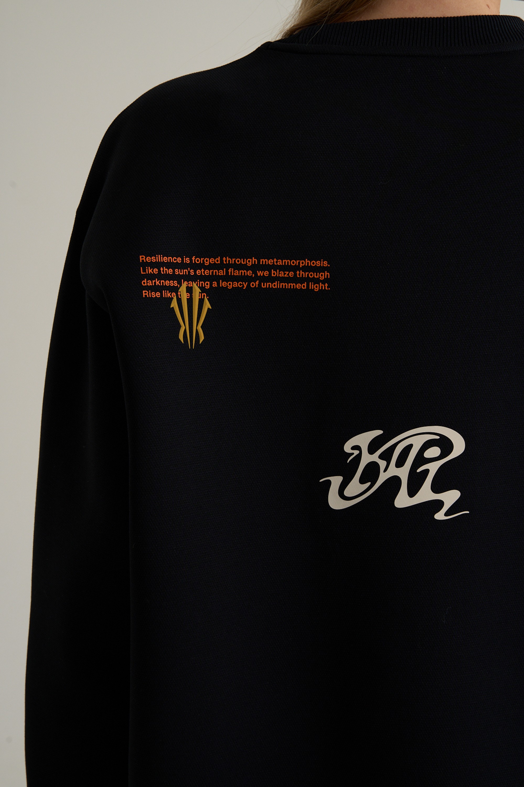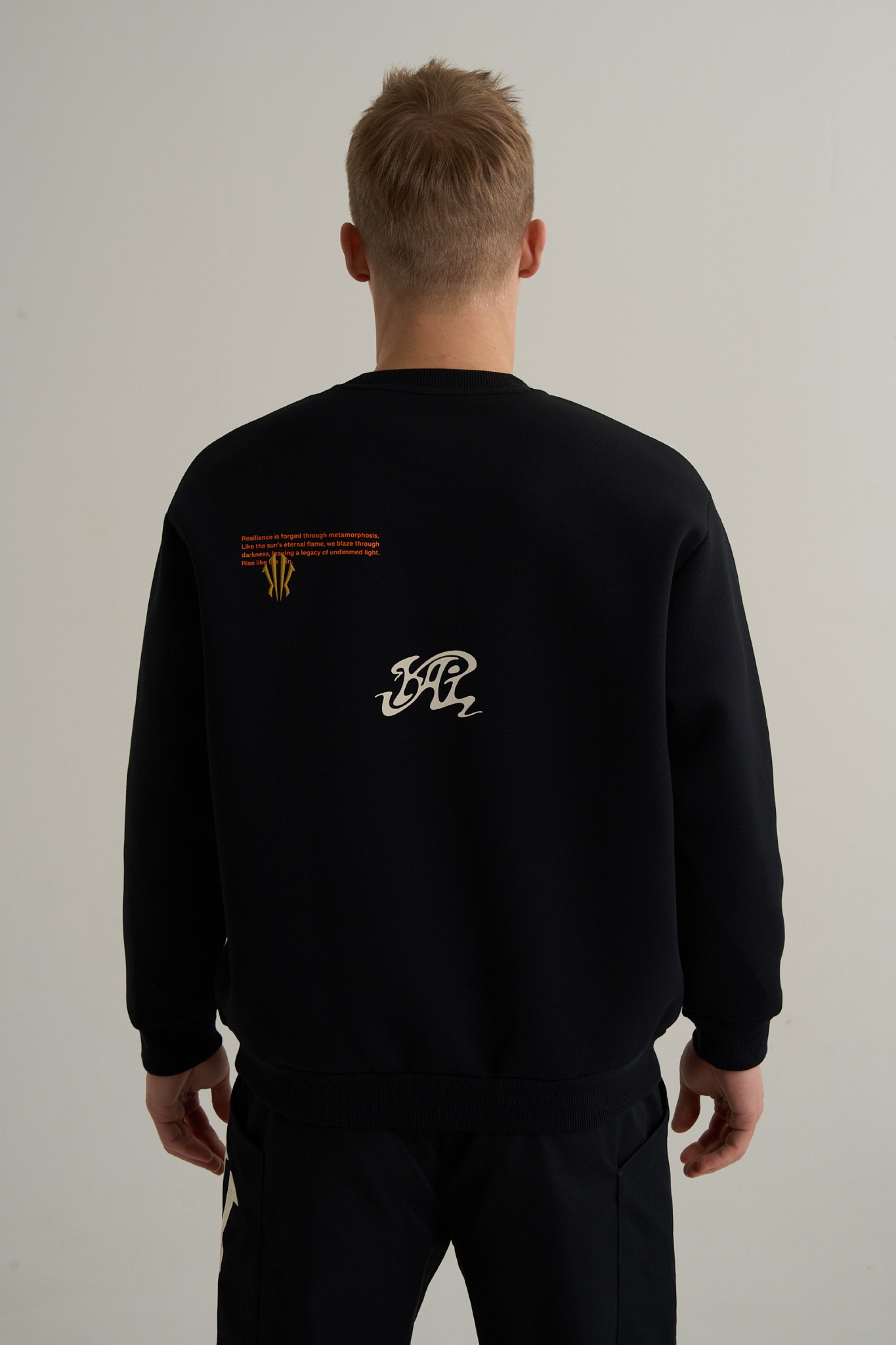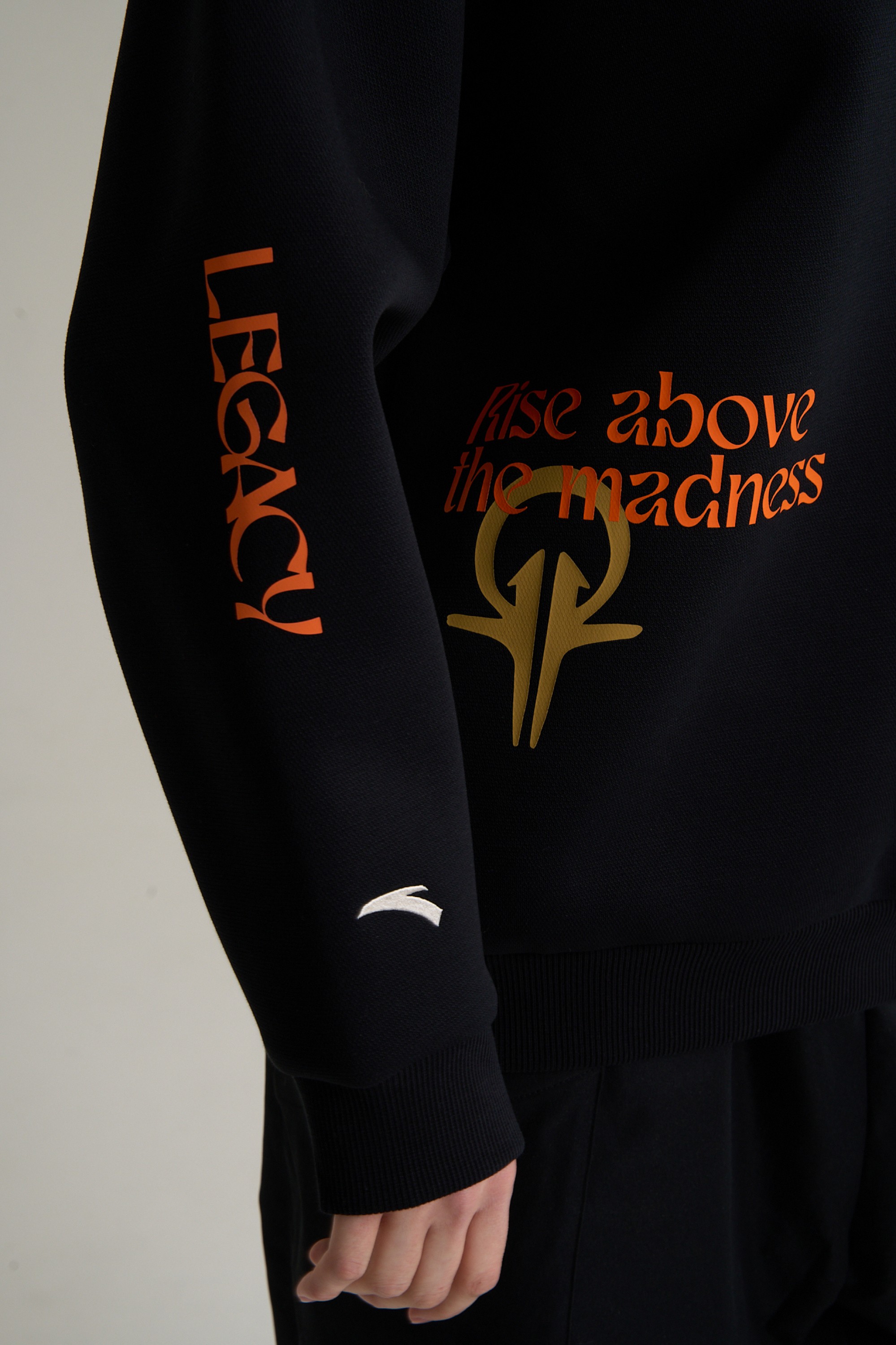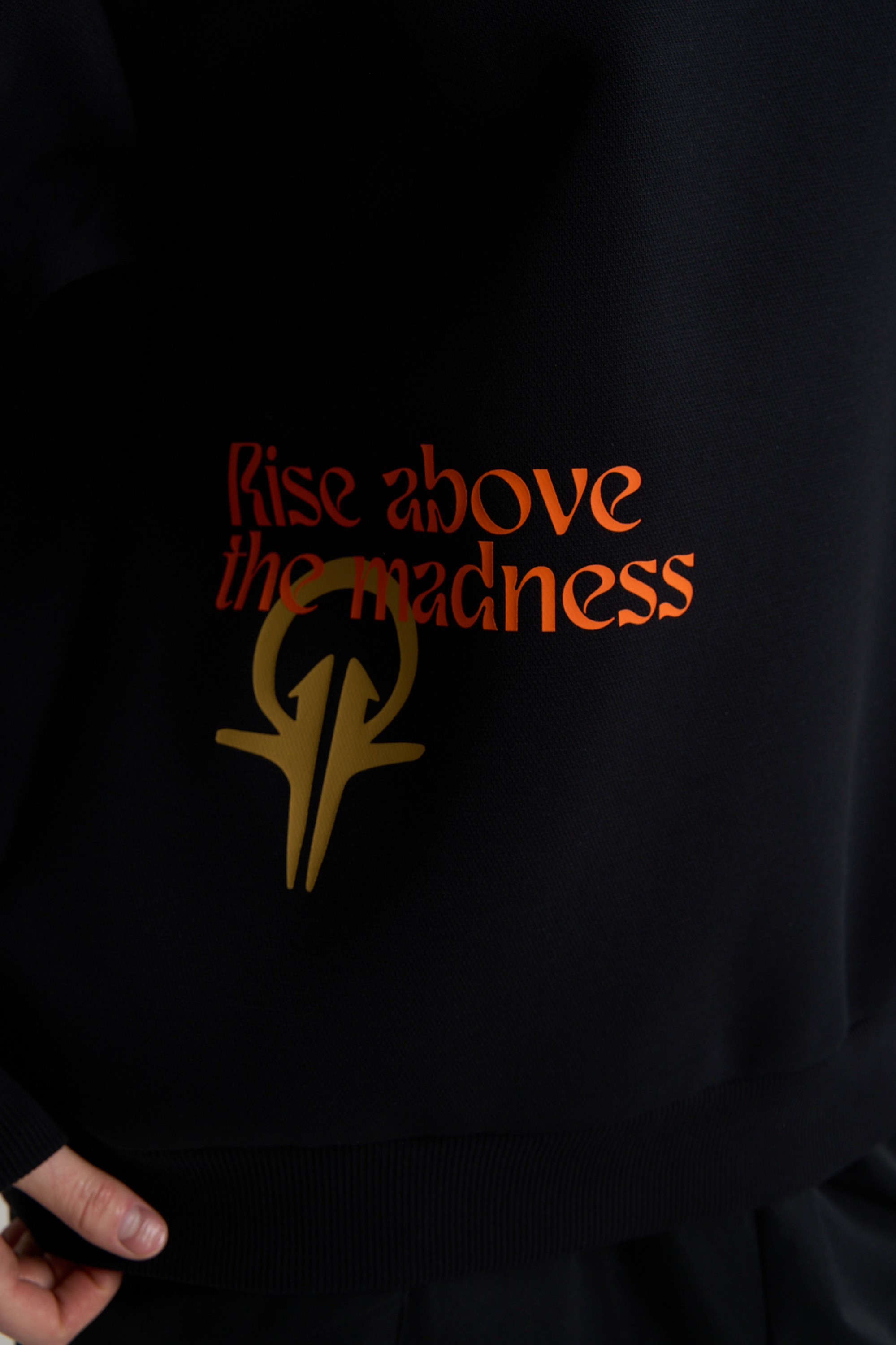 Дизайн свитшота строится вокруг мощного графического послания. Ключевой девиз RISE ABOVE THE MADNESS («Вознесись над безумием») дополнен графическими элементами коллекции. Их смещенное нанесение привлекает внимание и подчеркивает значимость каждого элемента. Глубокий черный цвет служит идеальным фоном для выразительного принта. В сочетании с оверсайз-брюками в баскетбольном стиле свитшот легко создает цельный и стильный комплект.