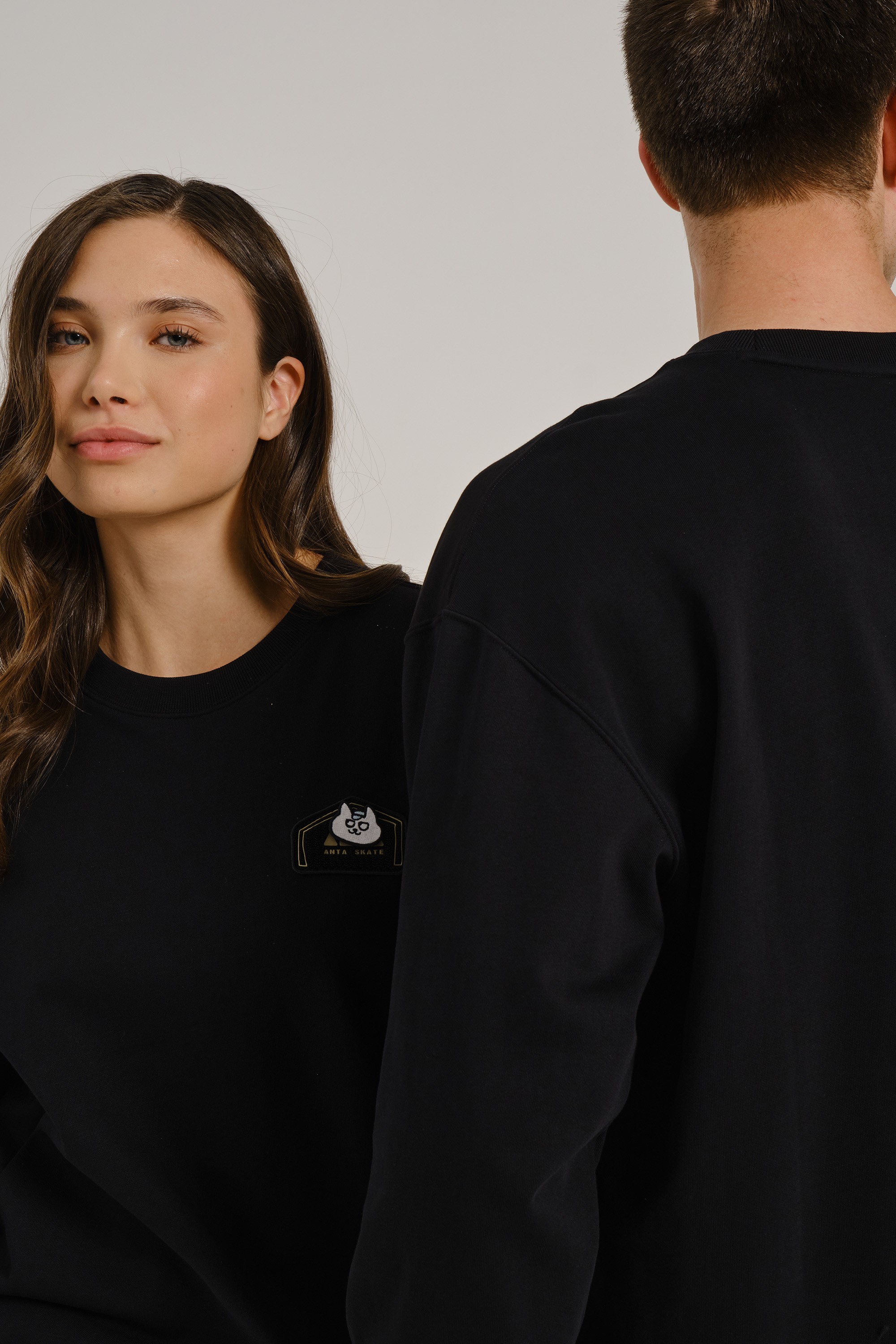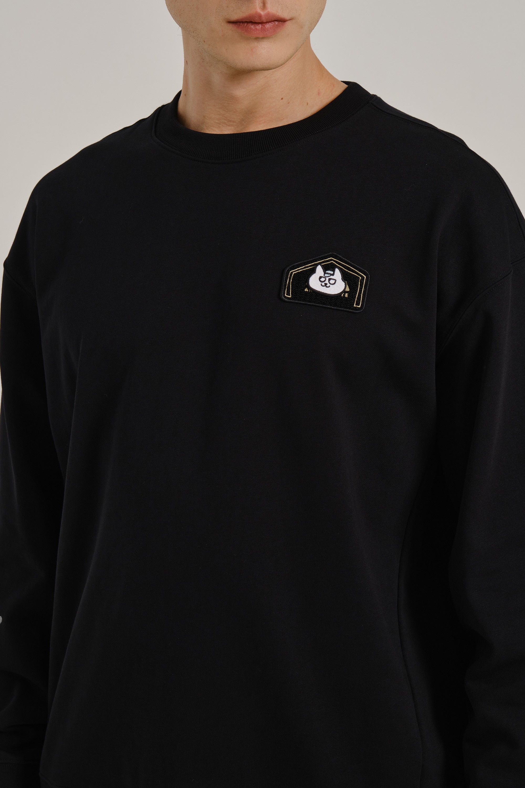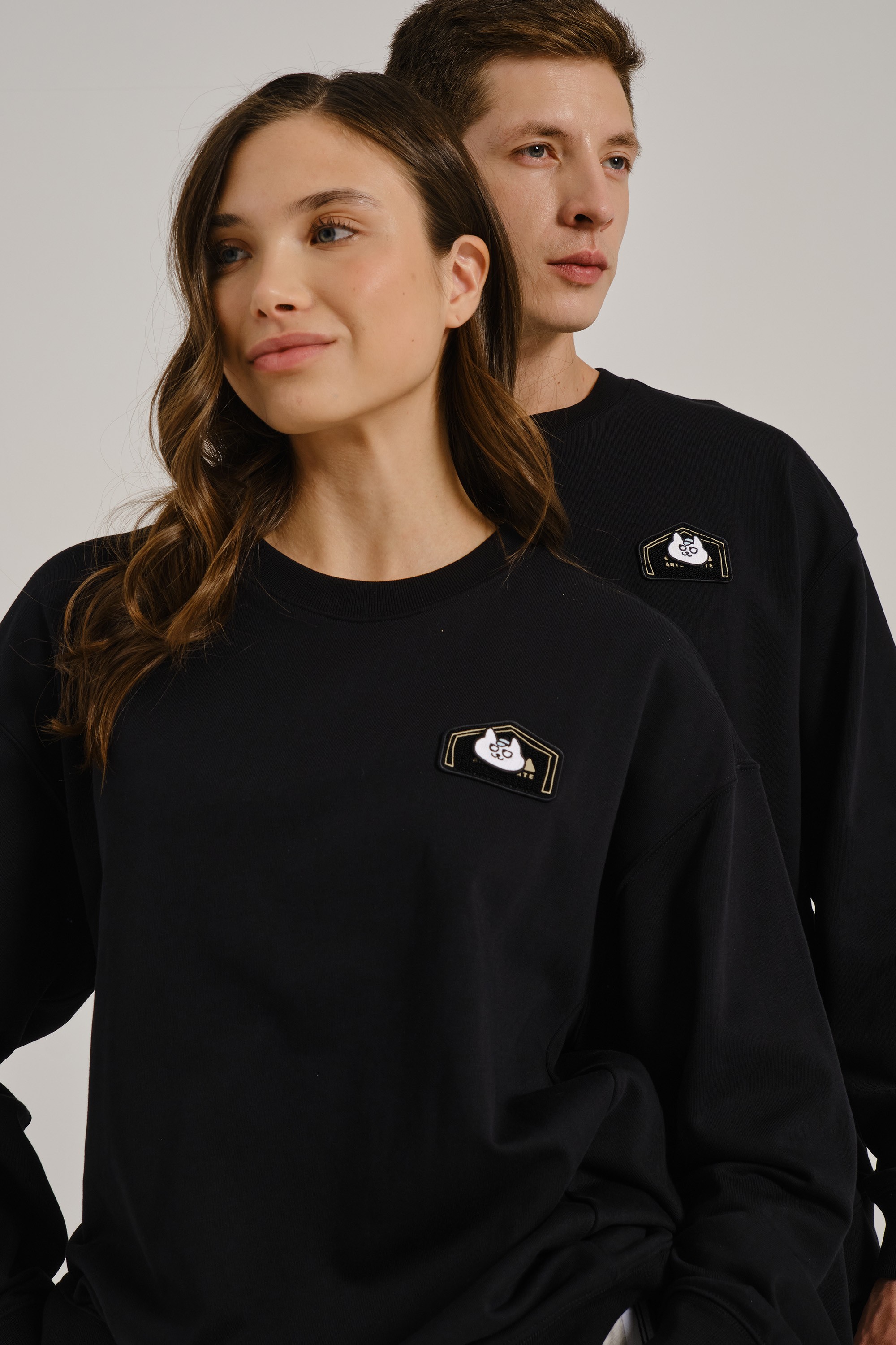 «Черная версия — антипод белой: если светлый свитшот кричал о смелости, то этот говорит шепотом, но веско. Белый кот на черном — как граффити в лунном свете, а серая надпись подчеркивает принадлежность к „семье“ без кричащих красок. Носите его с рваными джинсами и черными кедами для тотального монохрома, или с кислотно-желтыми шортами — чтобы кот „взорвал“ темноту».