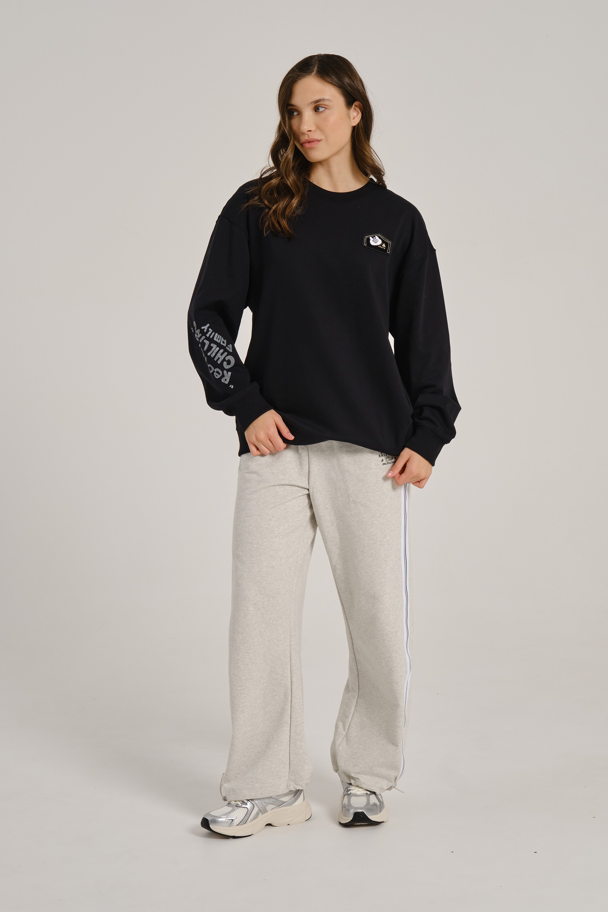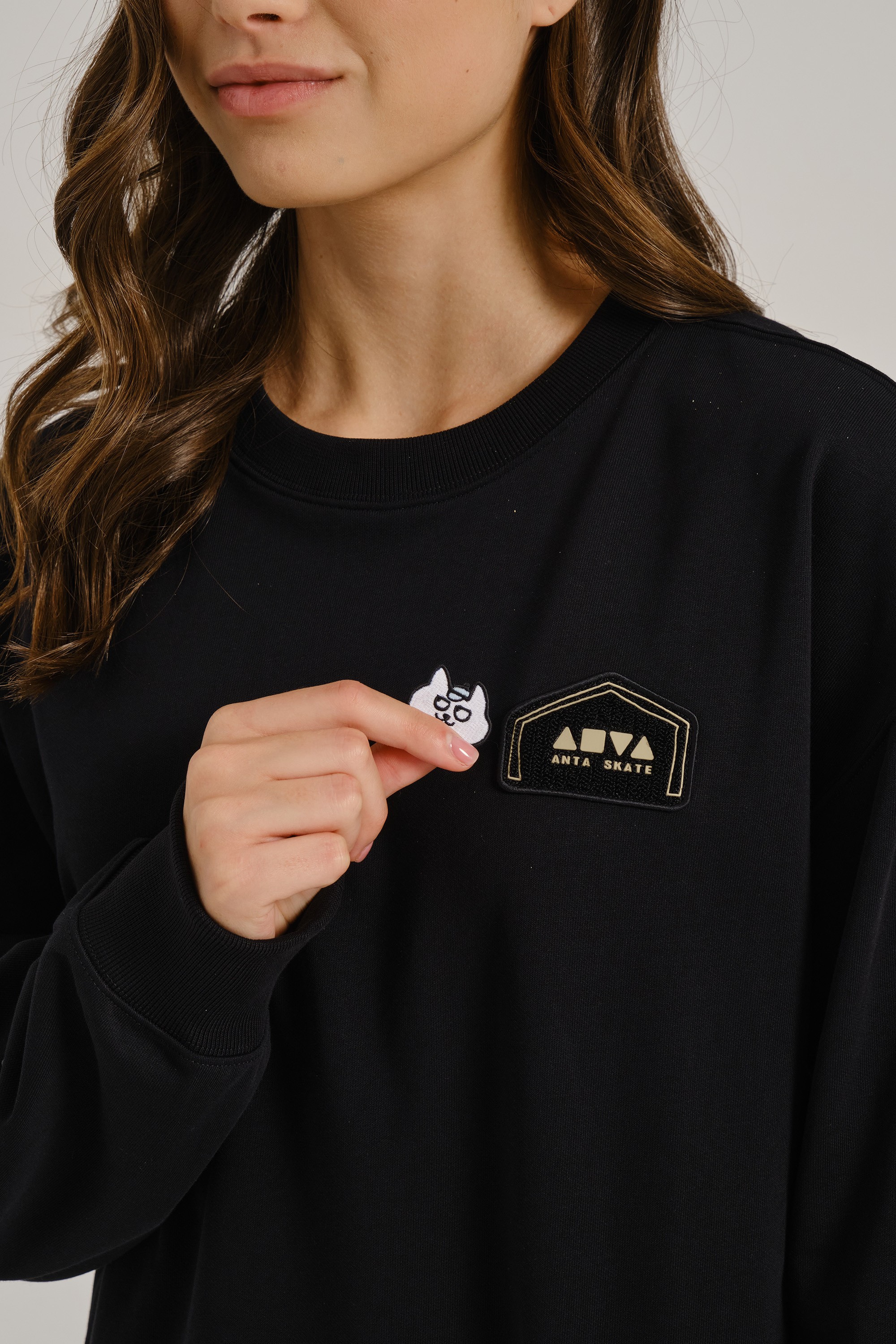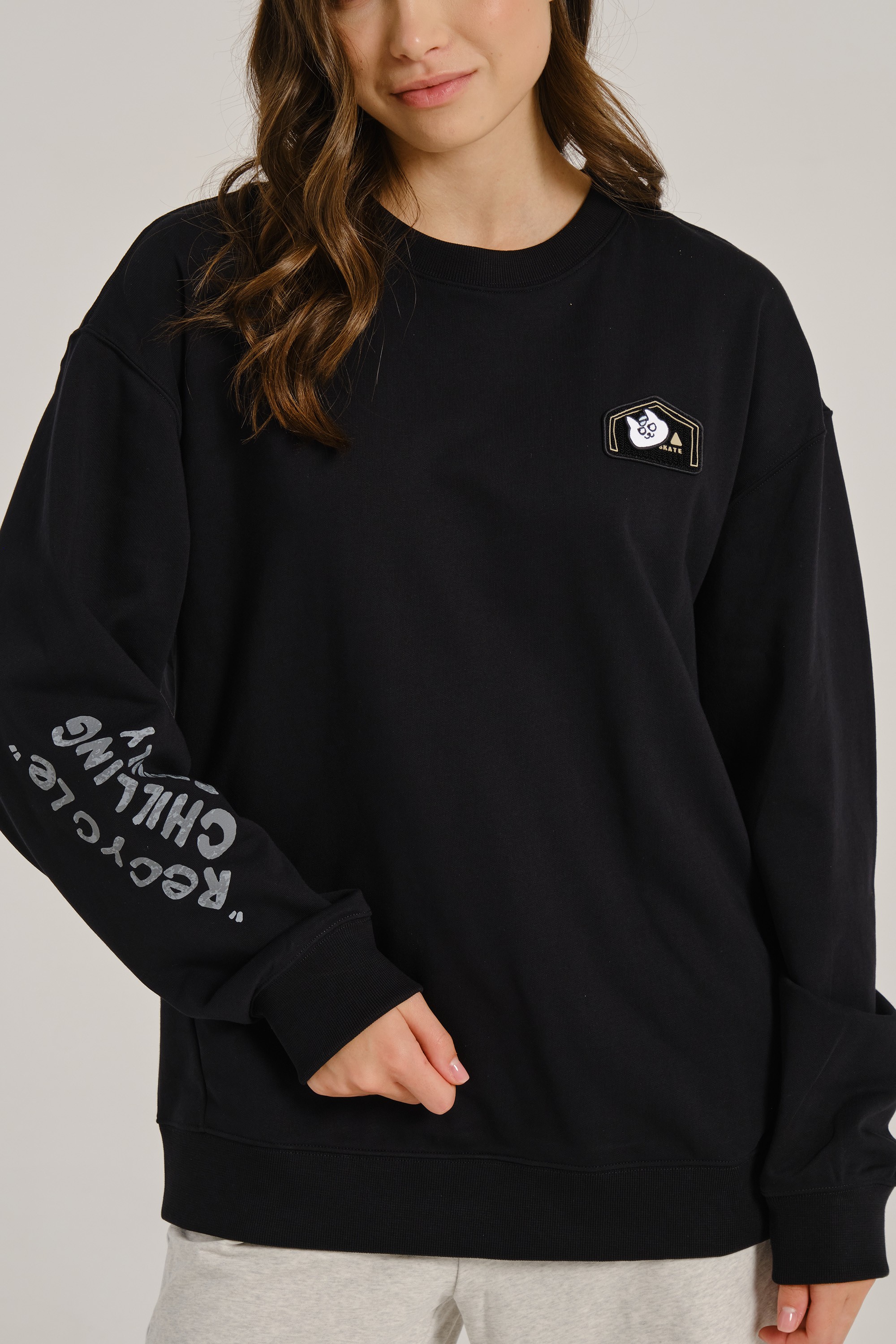 «Черная версия — антипод белой: если светлый свитшот кричал о смелости, то этот говорит шепотом, но веско. Белый кот на черном — как граффити в лунном свете, а серая надпись подчеркивает принадлежность к „семье“ без кричащих красок. Носите его с рваными джинсами и черными кедами для тотального монохрома, или с кислотно-желтыми шортами — чтобы кот „взорвал“ темноту».