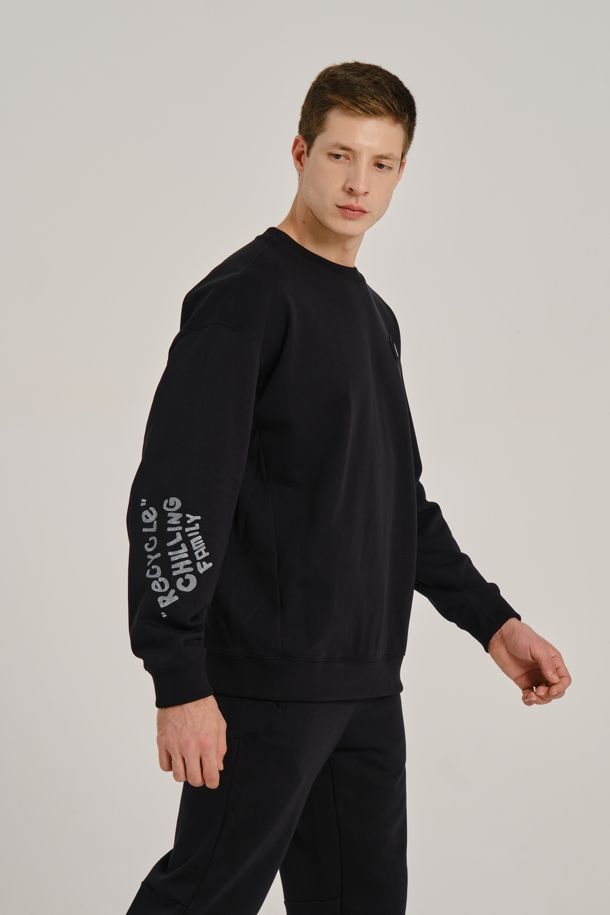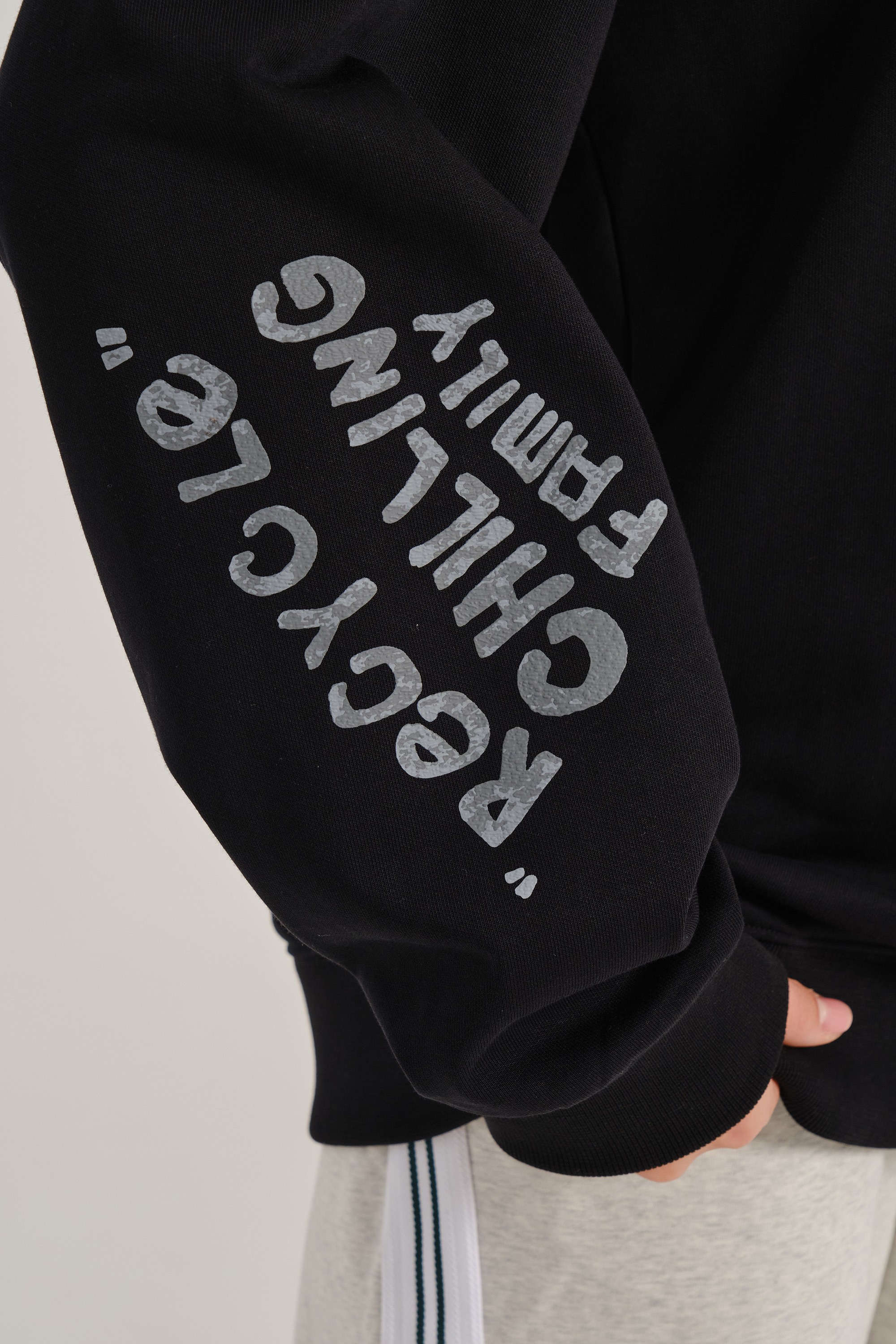 Серая надпись на рукаве — логотип коллекции в монохромной гамме. Шрифт сохраняет фирменный стиль, но цвет адаптирован под тотальный black-out образ.
