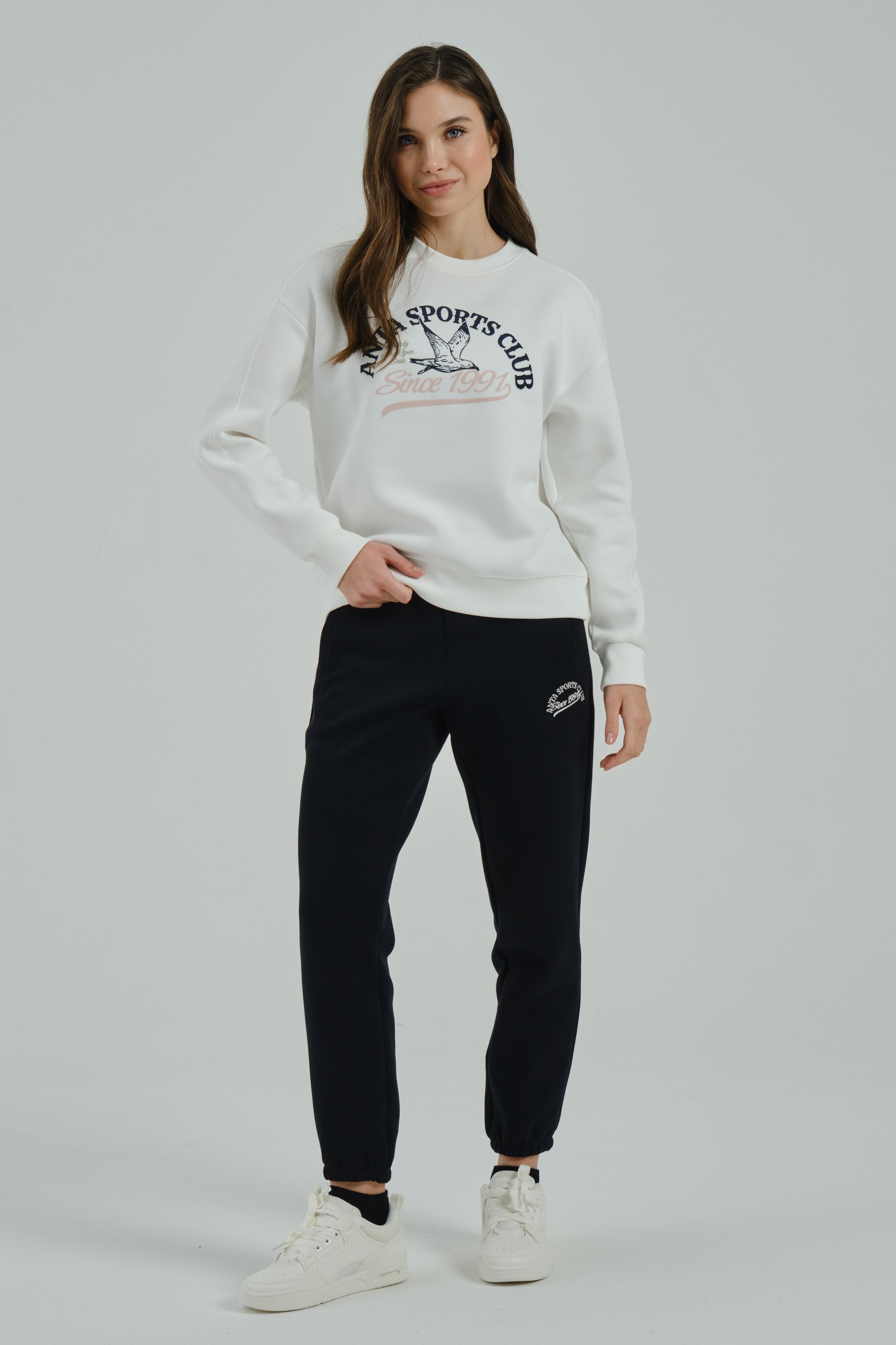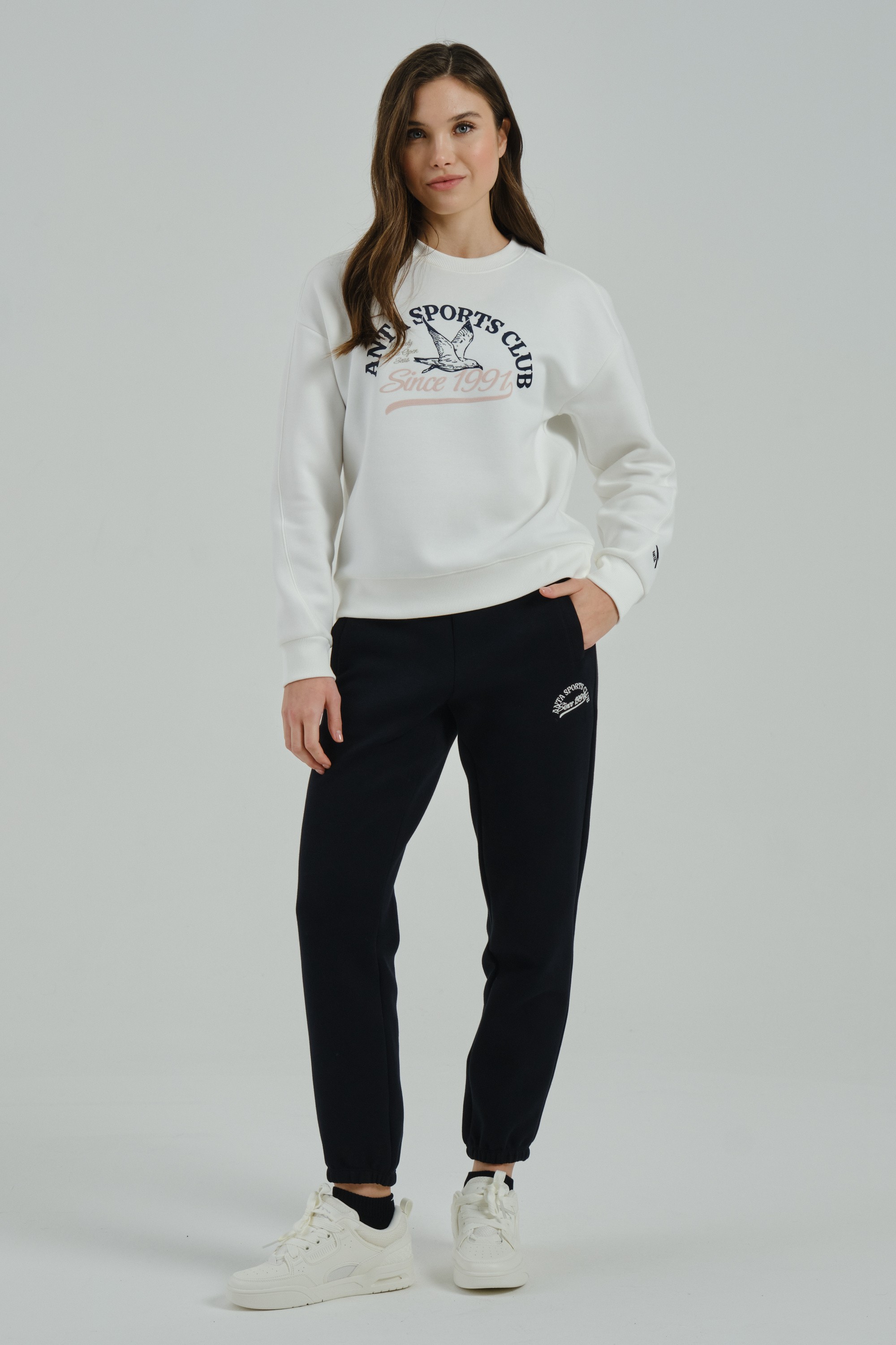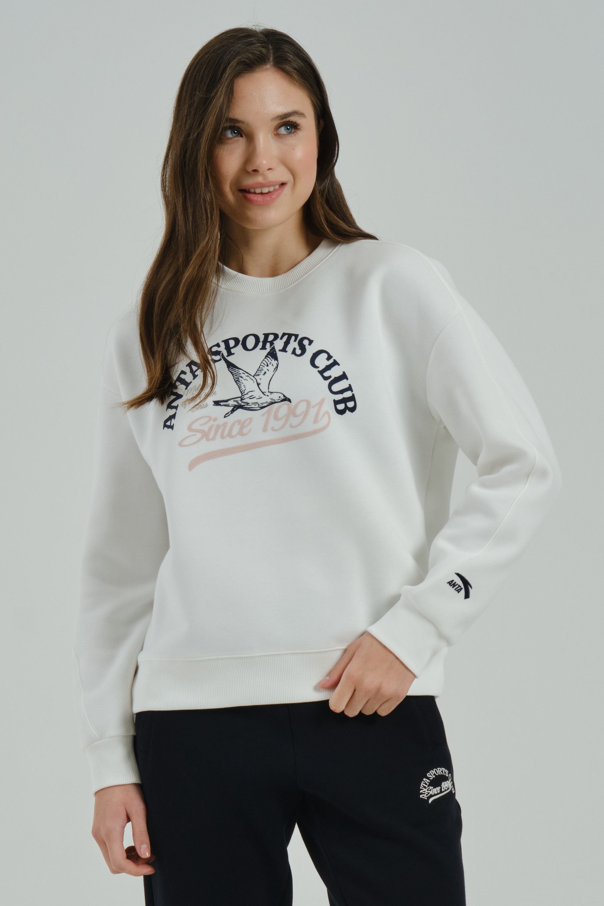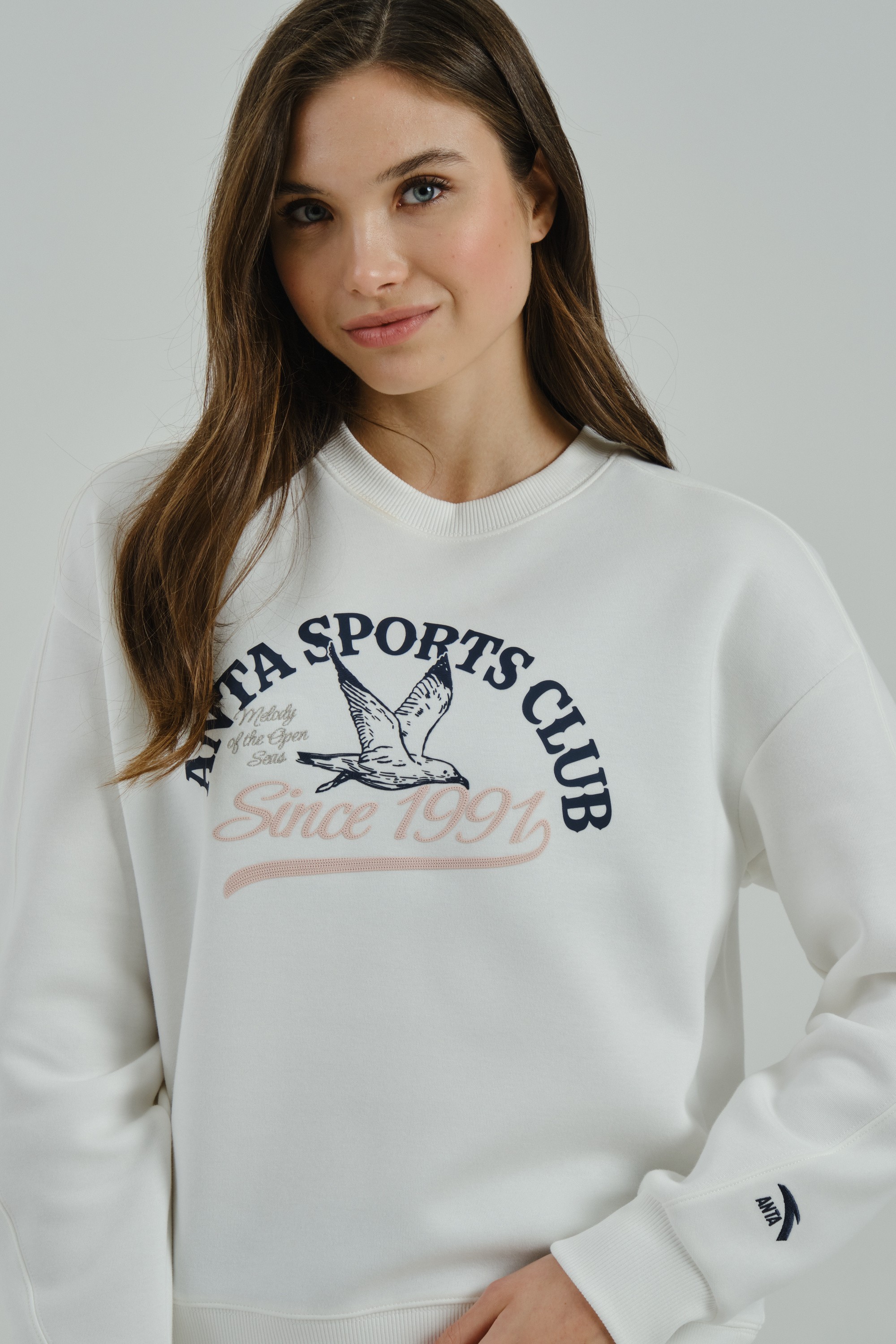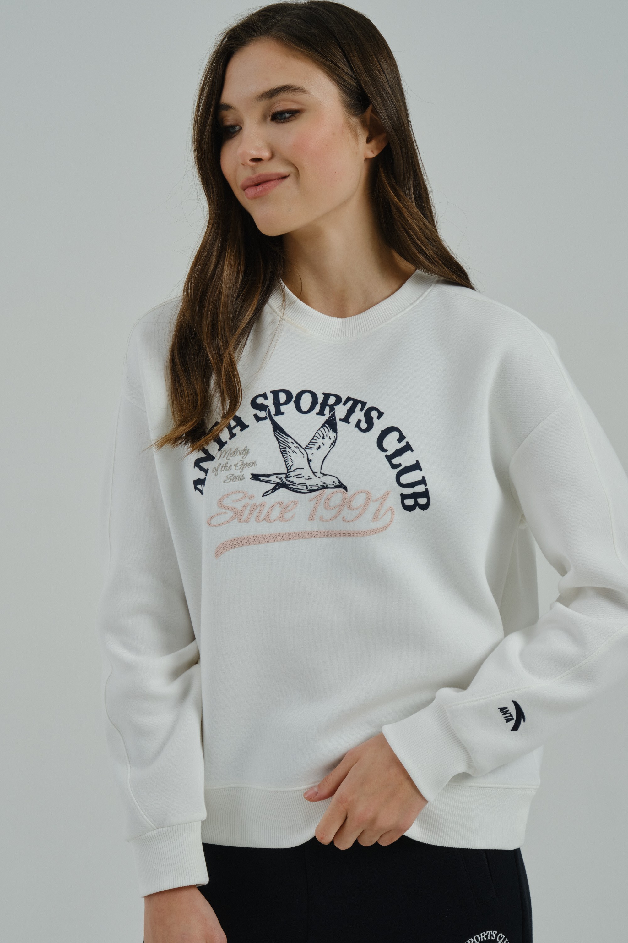 Женский свитшот свободного кроя из ретро-спортивной коллекции ANTA SPORTS CLUB, сочетающий в себе удобство, комфорт и романтические мотивы в дизайне.