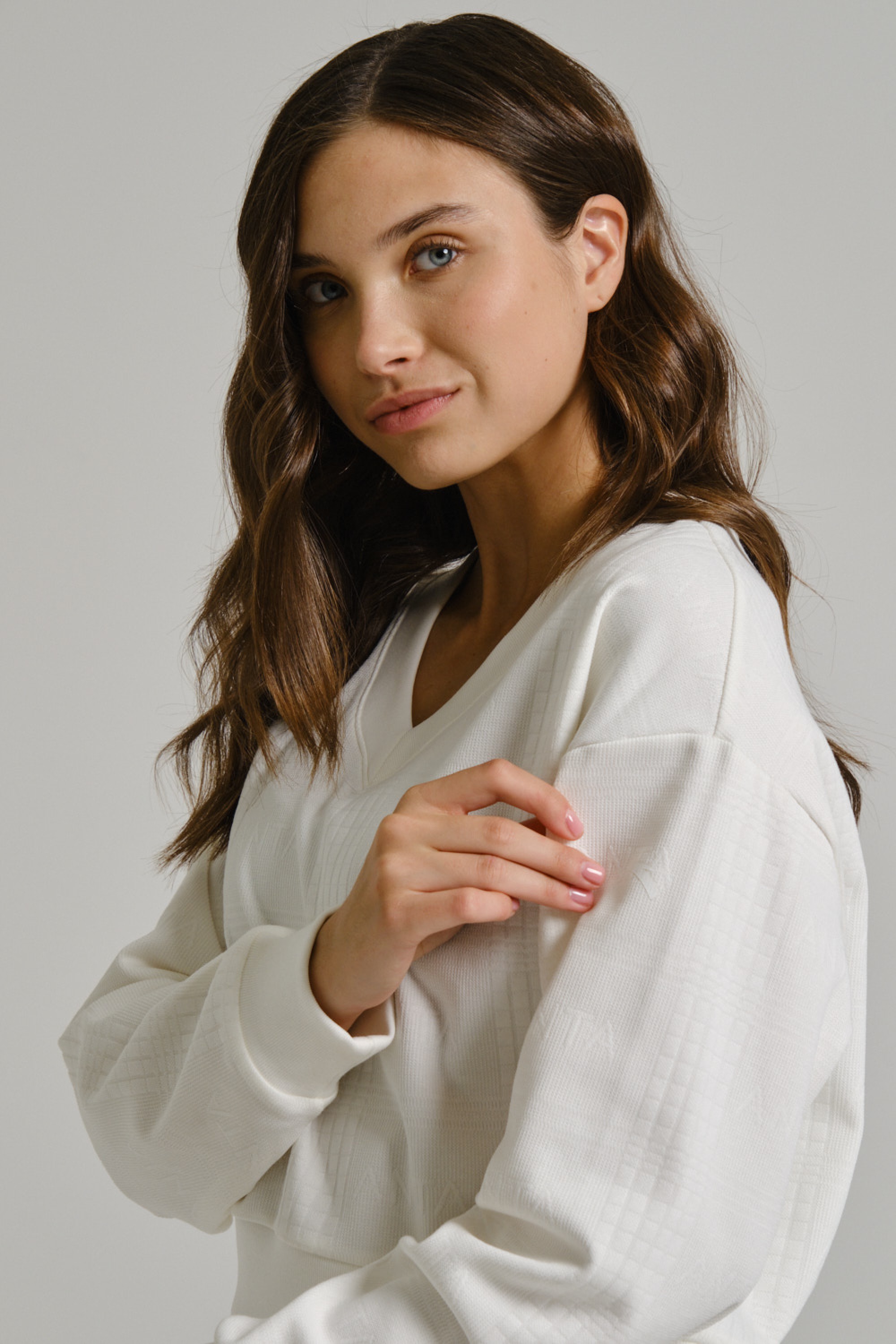 V-образный вырез горловины добавляет элегантность, визуально удлиняя шею и позволяя сочетать с цепочками или объемными шарфами.