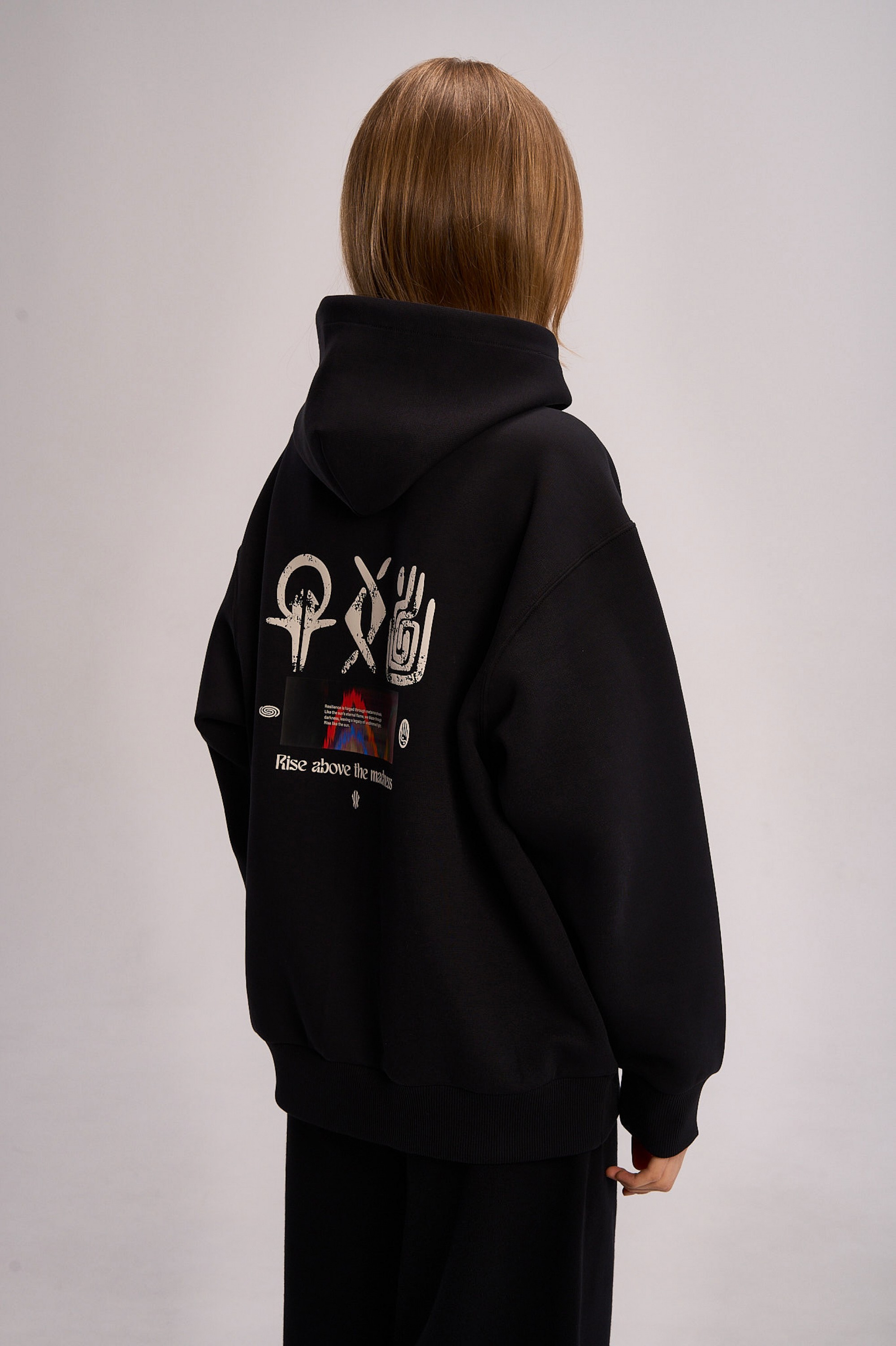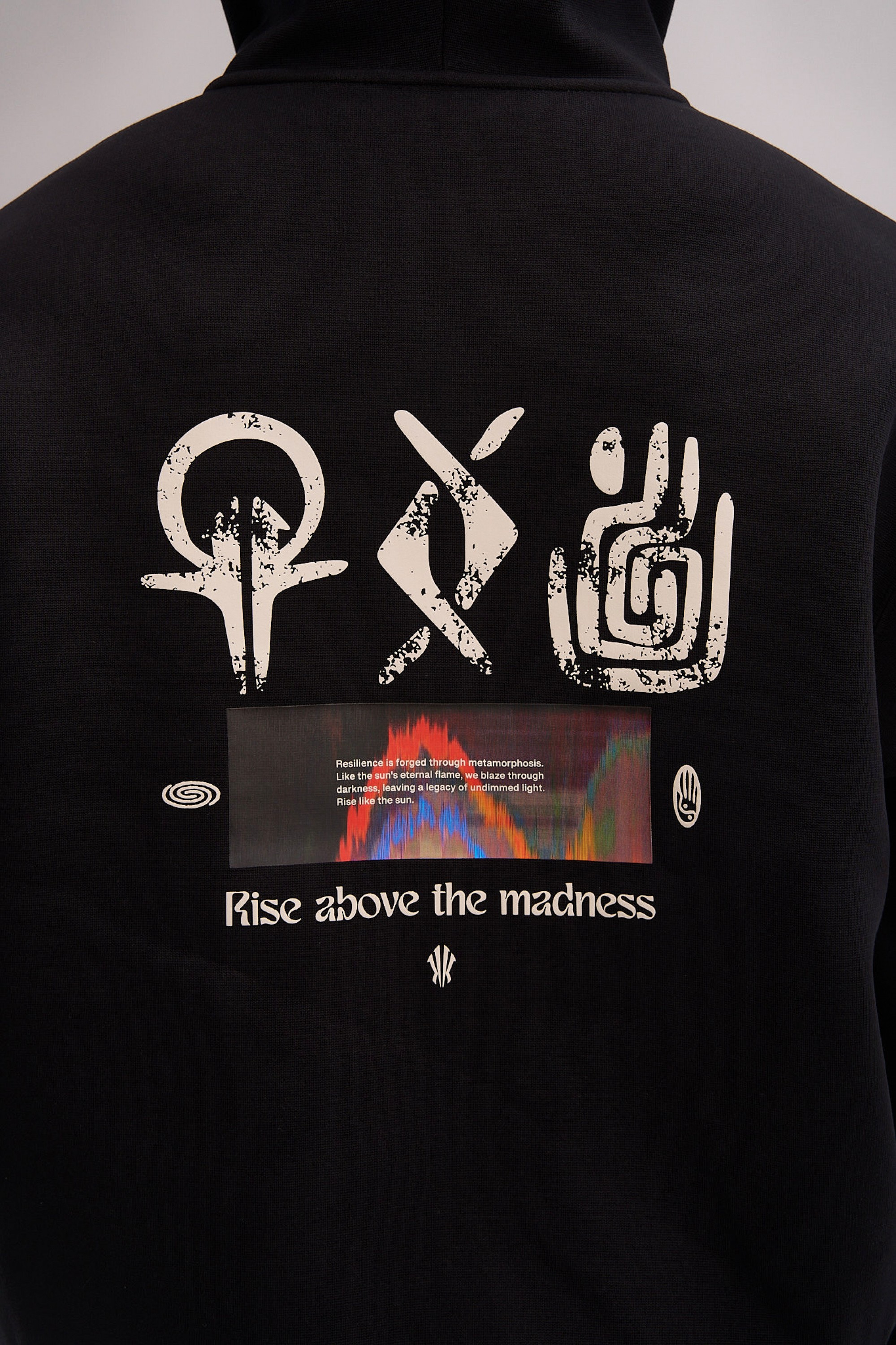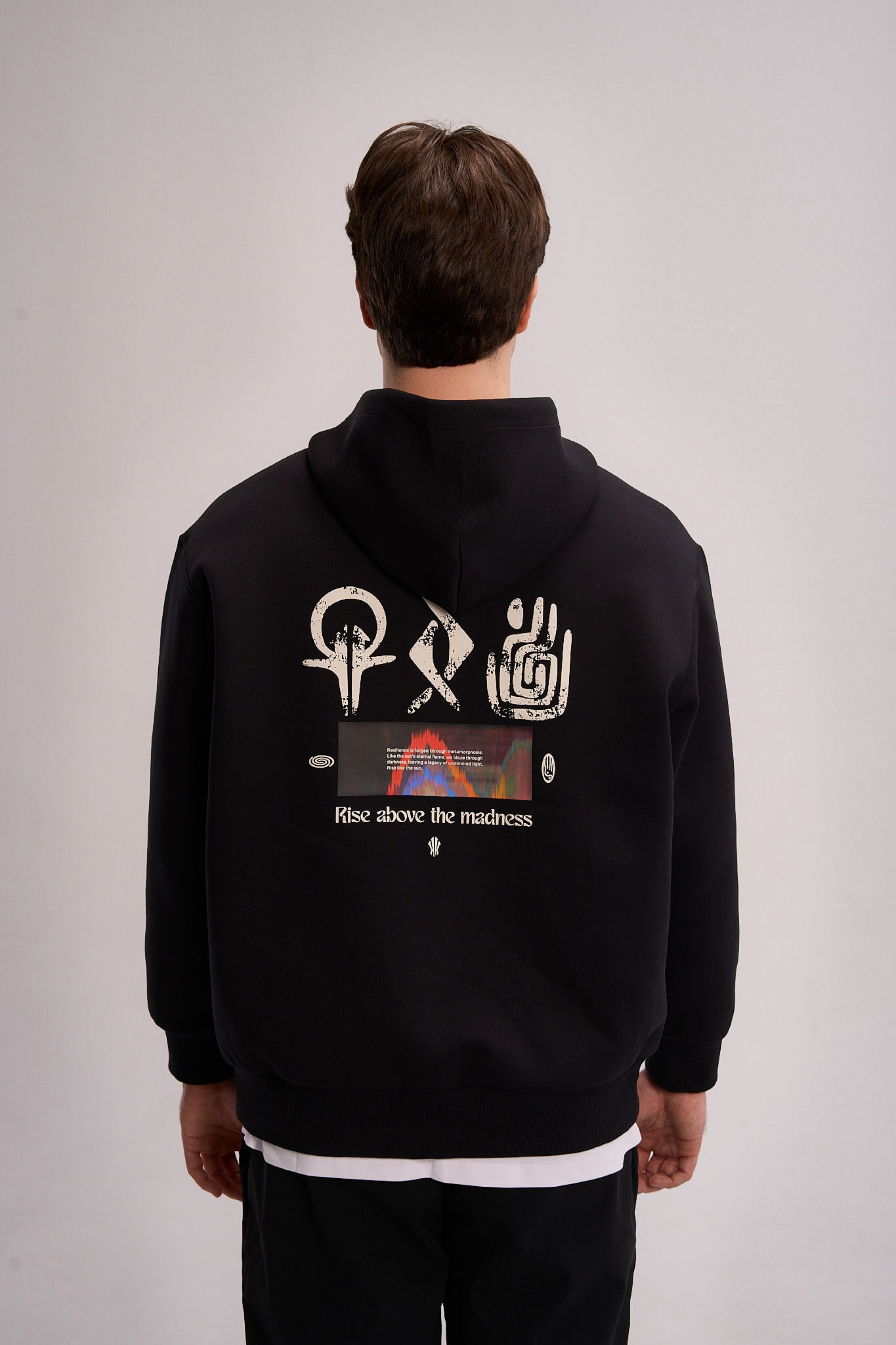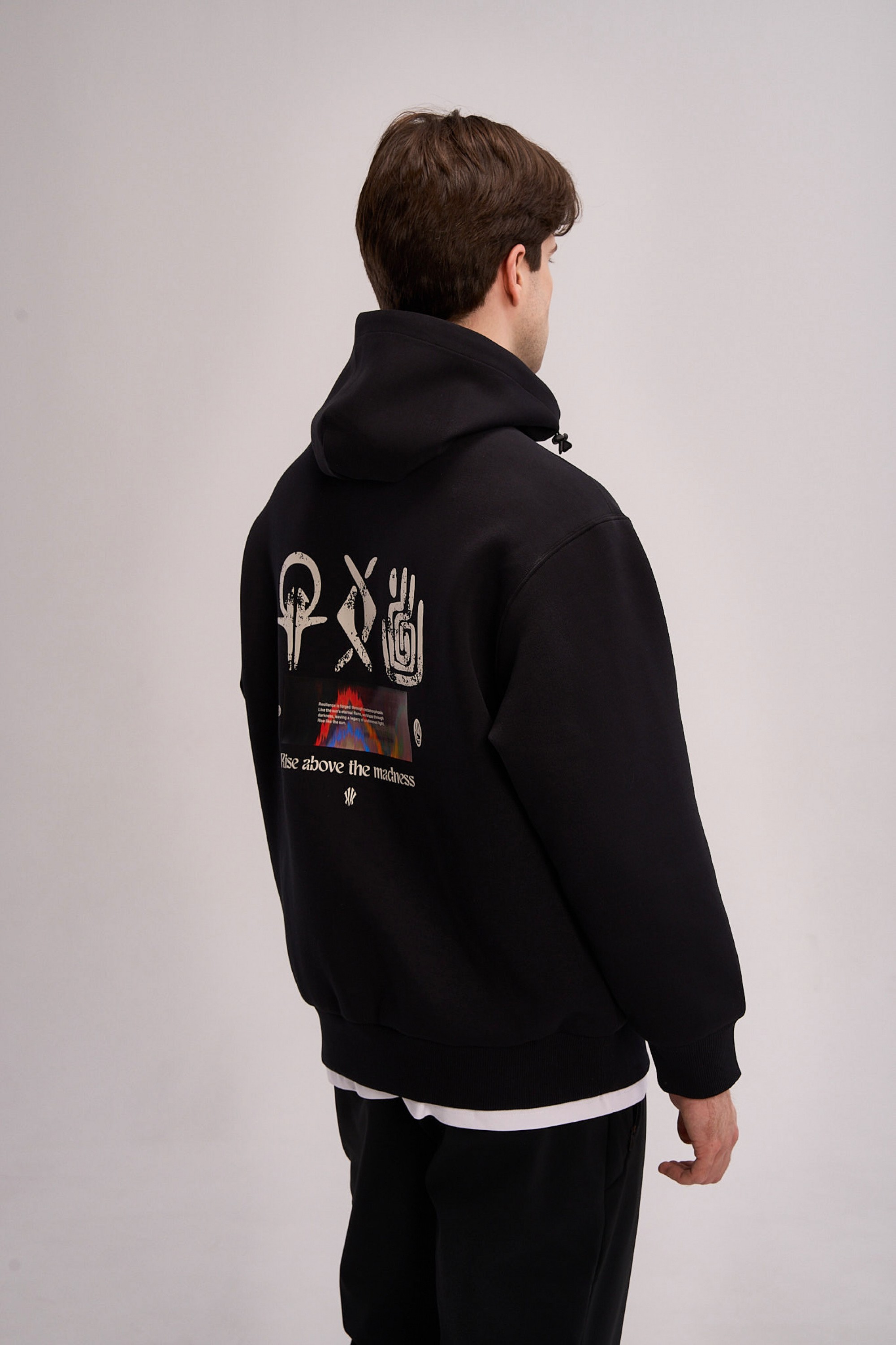 Дизайн модели строится на контрасте между минимализмом фронтальной части и экспрессией спины. Спереди акценты расставлены лаконично: контрастный логотип ANTA на левом рукаве и фирменный графический элемент «щит Ирвинга» на груди. Главное повествование разворачивается на спине: крупный полноцветный принт объединяет этнические орнаменты, хайтек-графику и вдохновляющий девиз Rise above the madness («вознесись над безумием»). Эта композиция визуализирует идею преодоления суеты и беспорядка через связь с корнями и фокус на цели. Классический черный цвет делает эту толстовку универсальным элементом вашего гардероба в баскетбольном стиле.