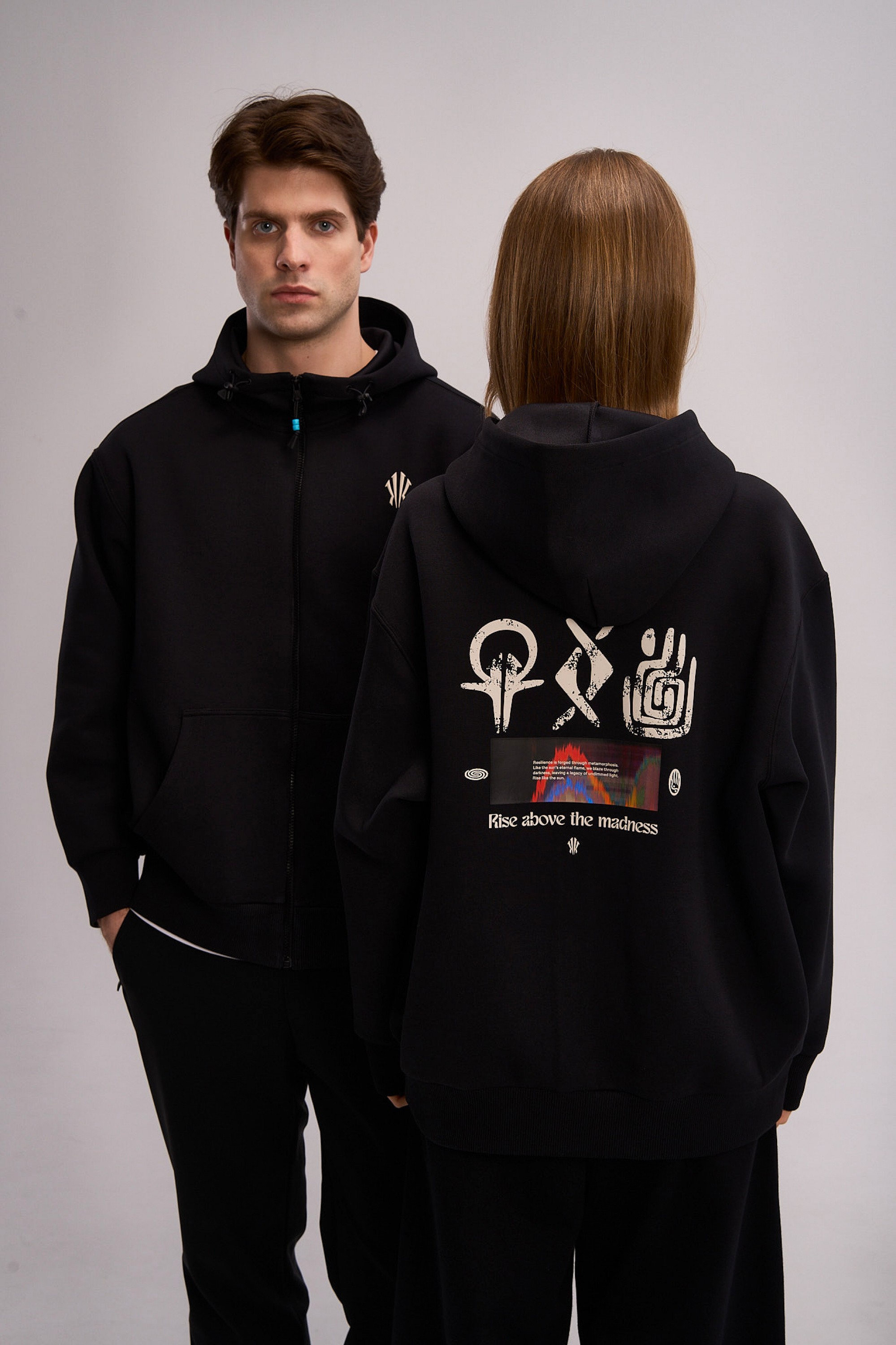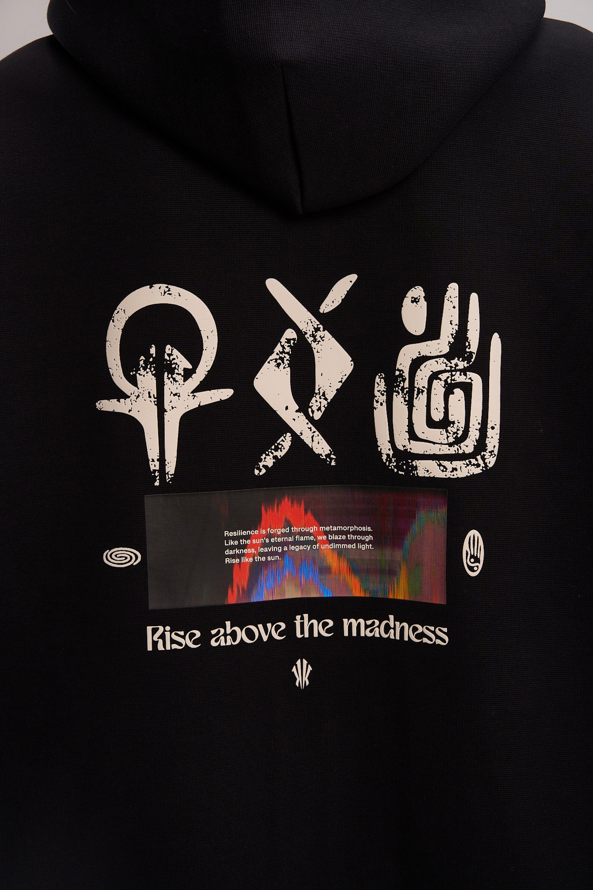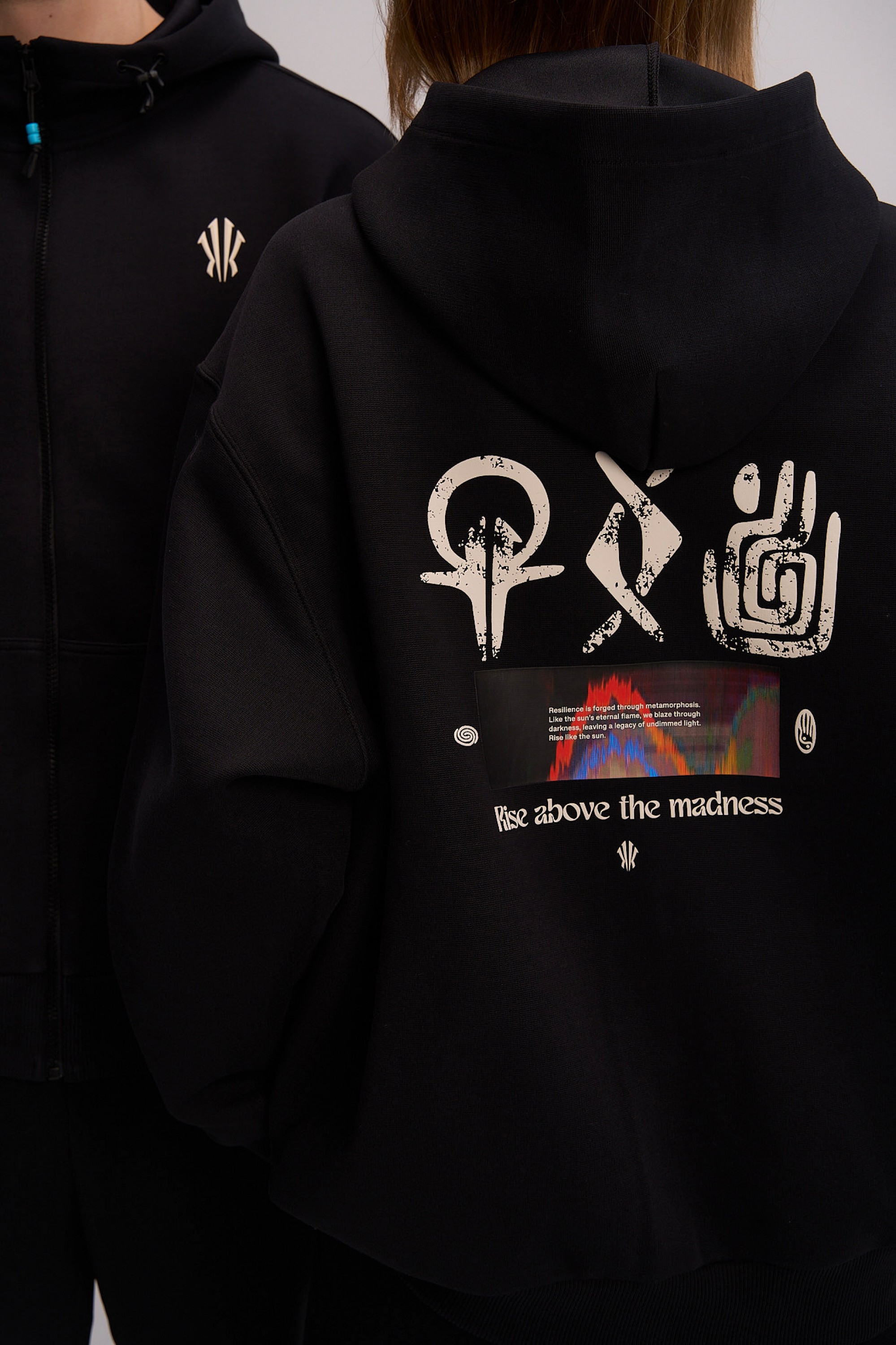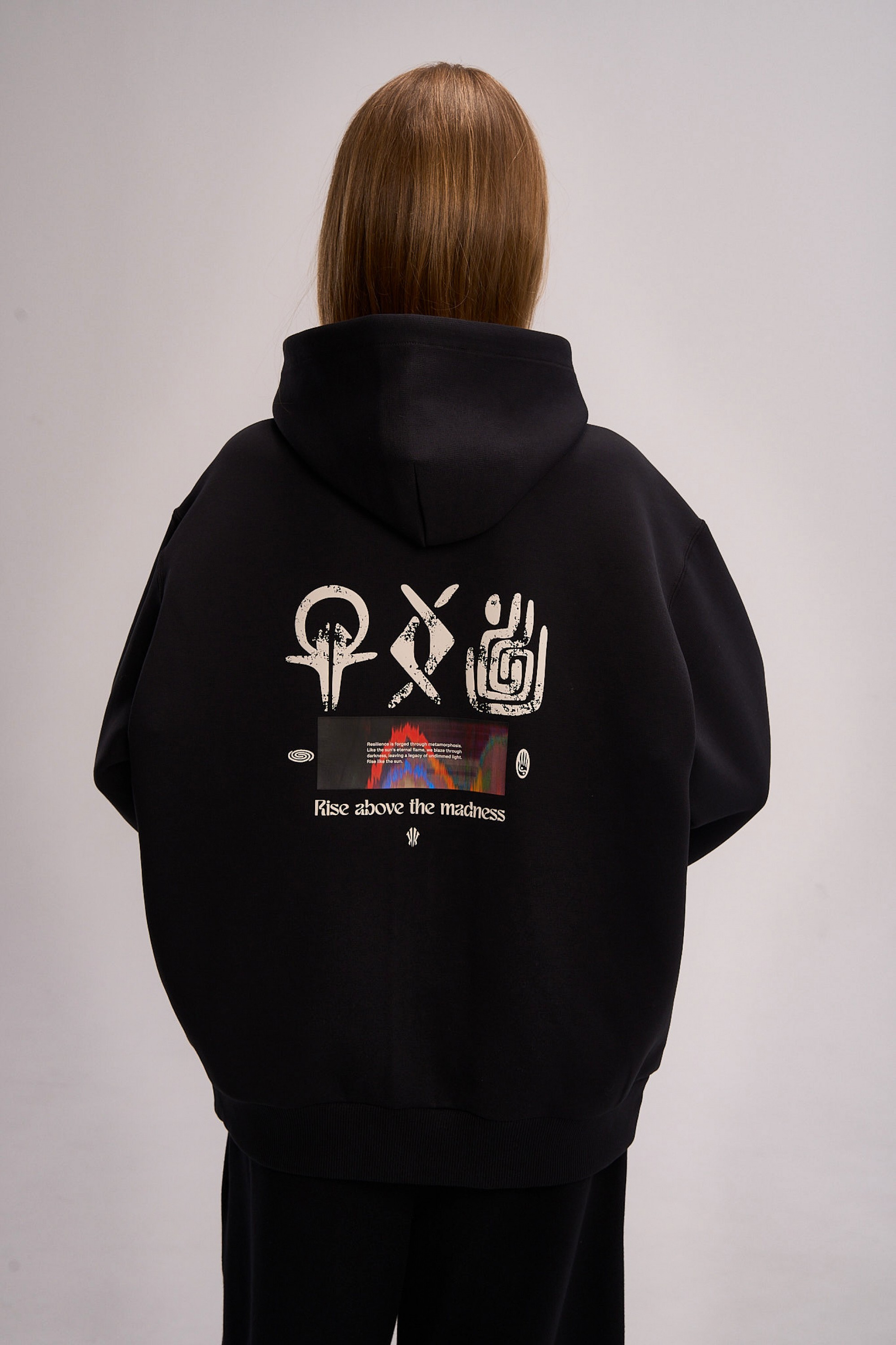 Дизайн модели строится на контрасте между минимализмом фронтальной части и экспрессией спины. Спереди акценты расставлены лаконично: контрастный логотип ANTA на левом рукаве и фирменный графический элемент «щит Ирвинга» на груди. Главное повествование разворачивается на спине: крупный полноцветный принт объединяет этнические орнаменты, хайтек-графику и вдохновляющий девиз Rise above the madness («вознесись над безумием»). Эта композиция визуализирует идею преодоления суеты и беспорядка через связь с корнями и фокус на цели. Классический черный цвет делает эту толстовку универсальным элементом вашего гардероба в баскетбольном стиле.