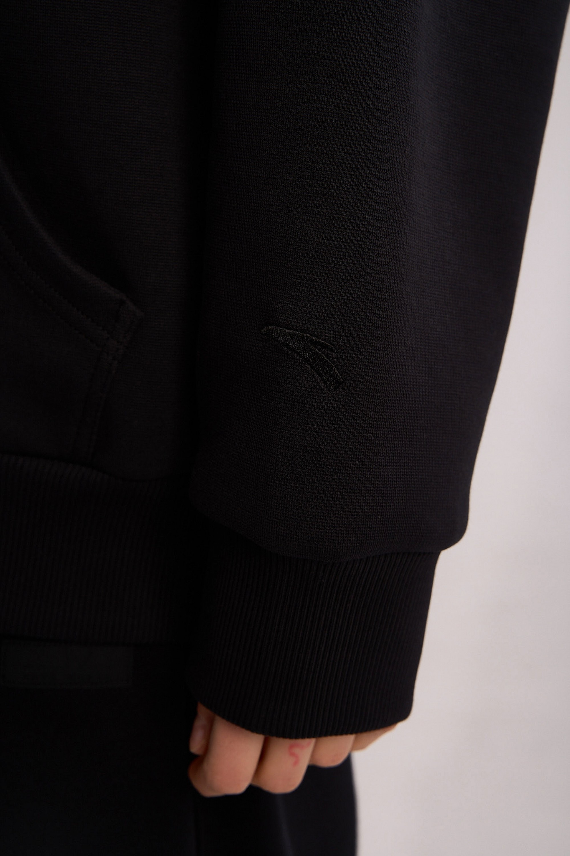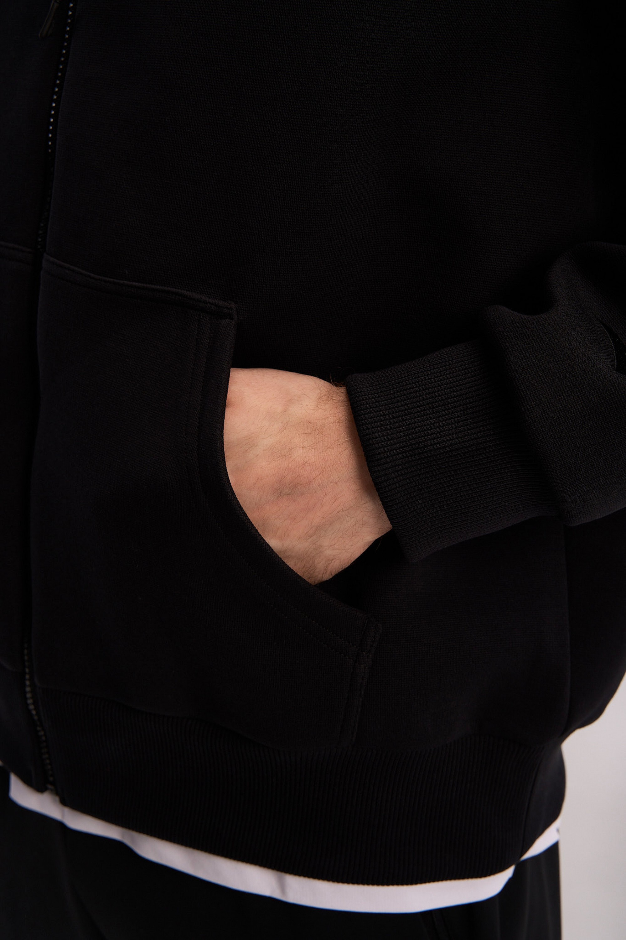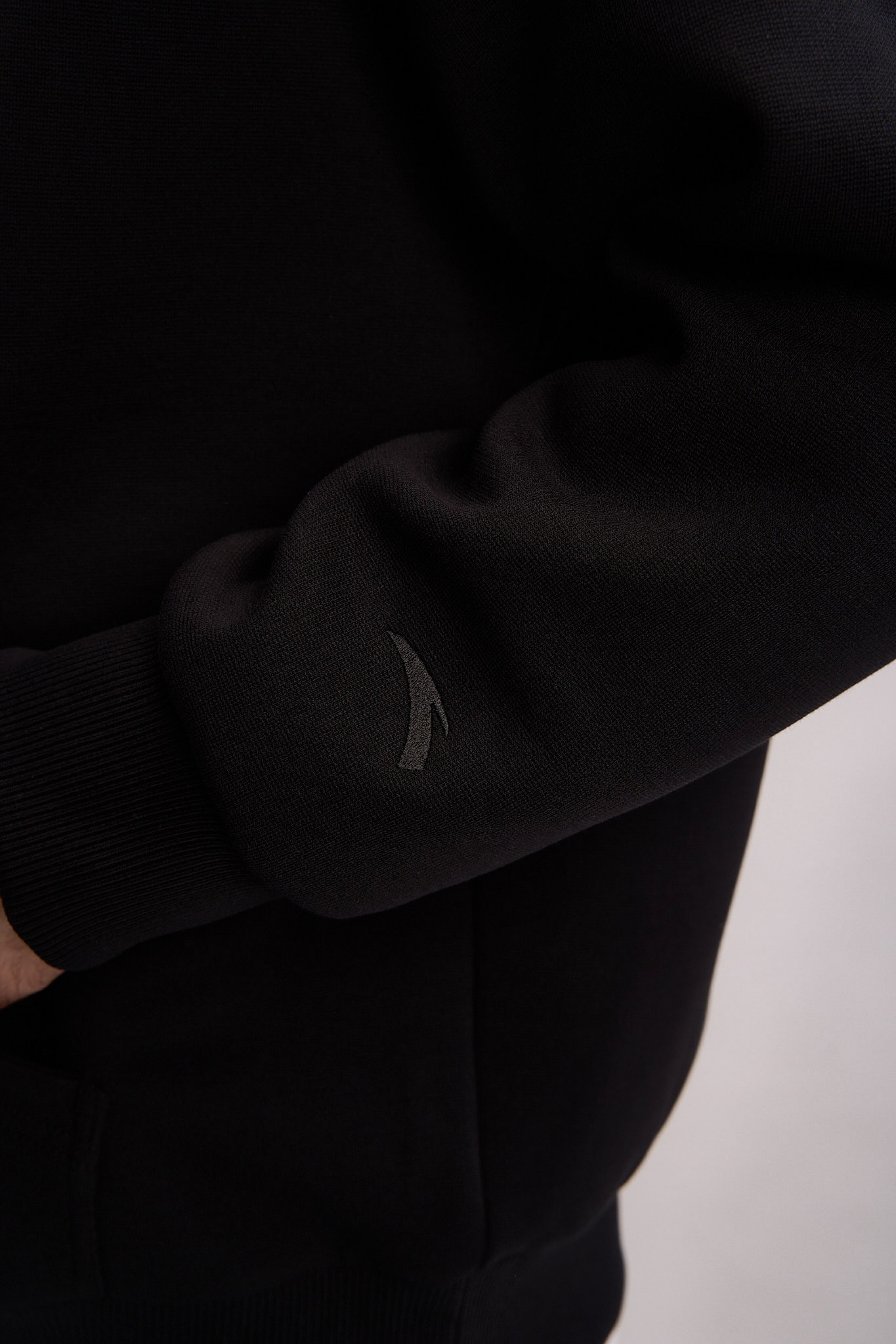 Толстовка изготовлена из высокоплотного (315 г/кв.м) трикотажного полотна премиального качества: полиэстер (61%) обеспечивает прочность и сохранение насыщенного черного цвета, хлопок (34%) отвечает за натуральный комфорт и воздухопроницаемость, а значительная доля эластана (5%) придает материалу выдающуюся эластичность для абсолютной свободы движений.