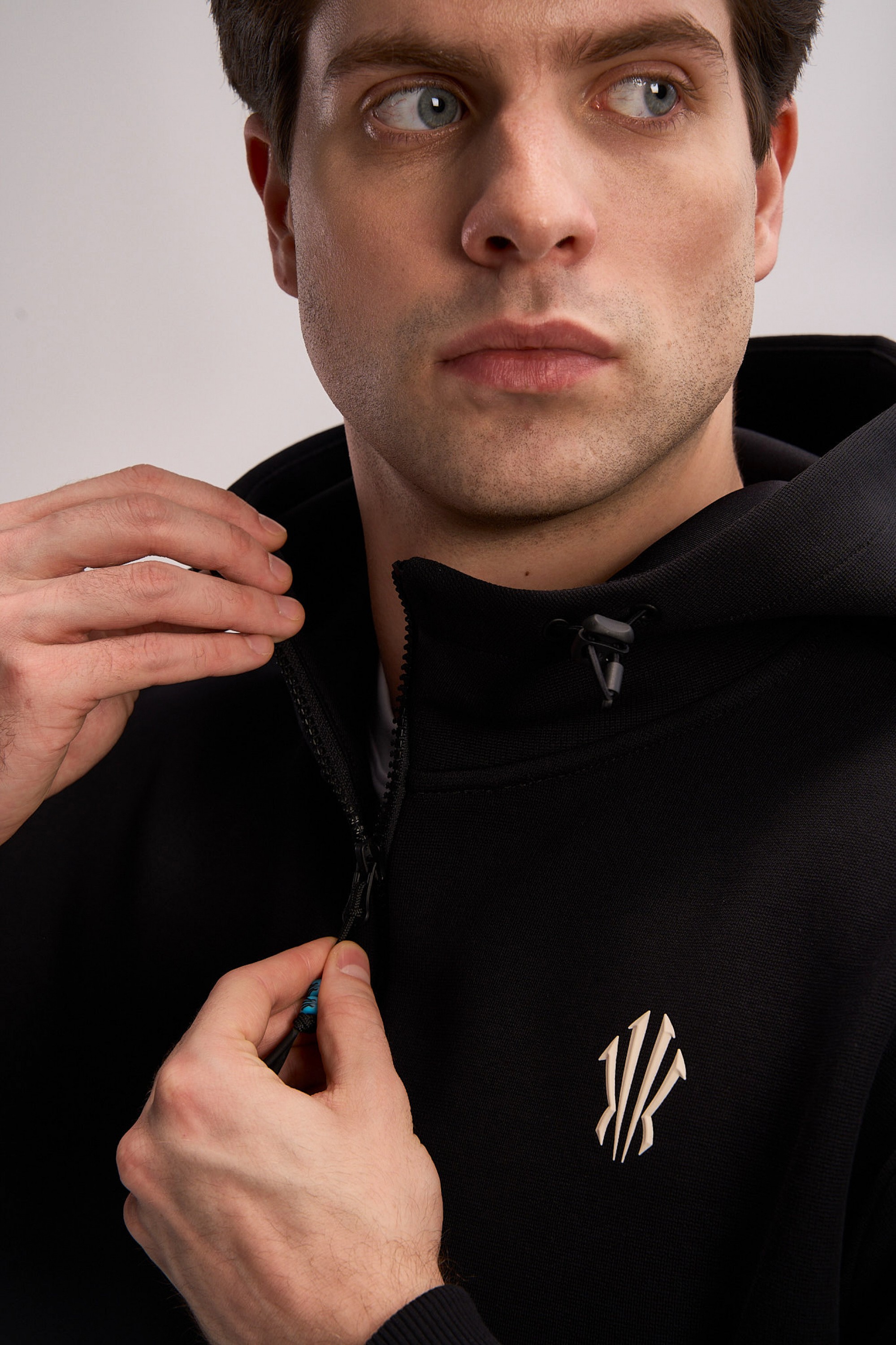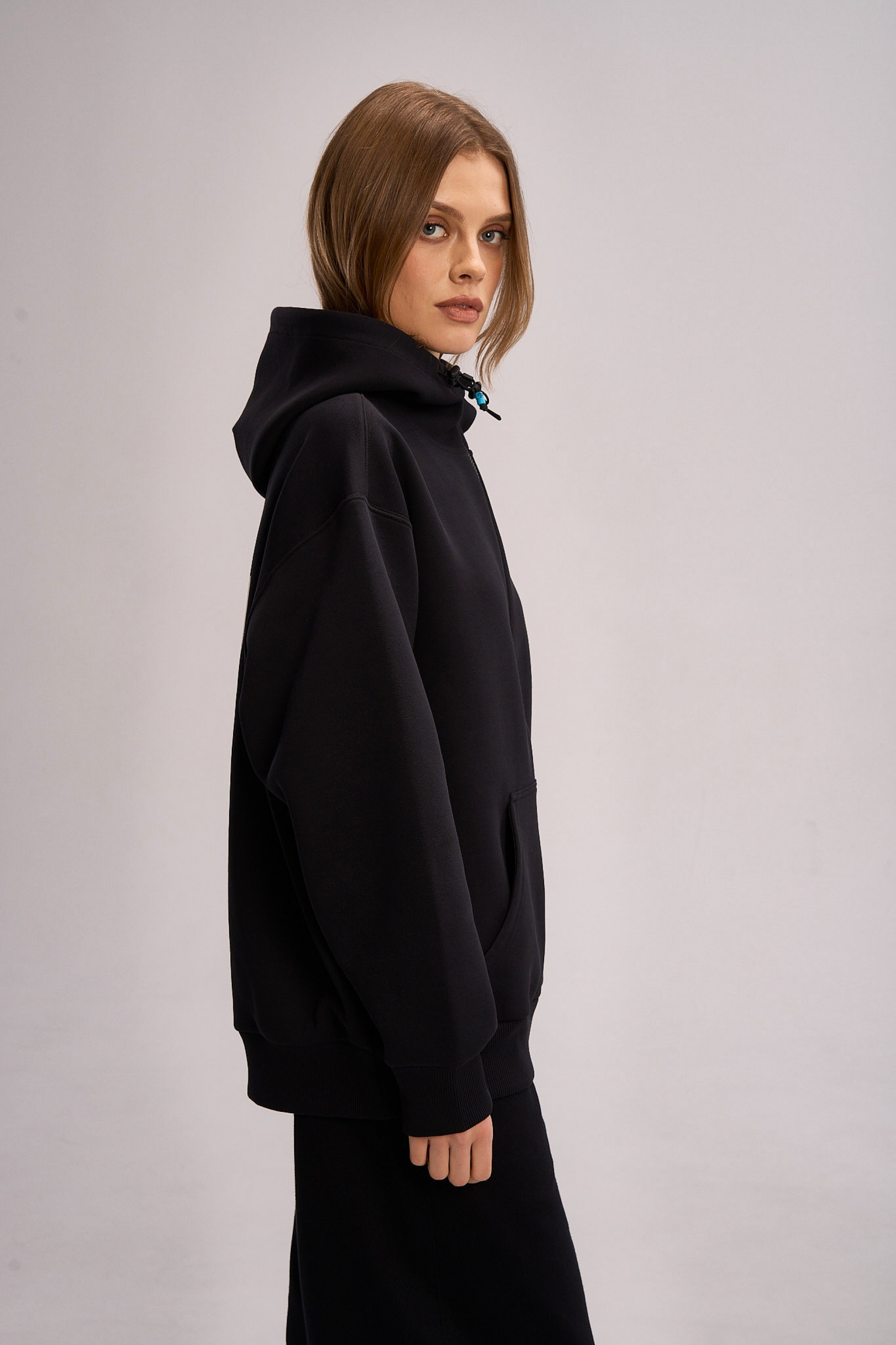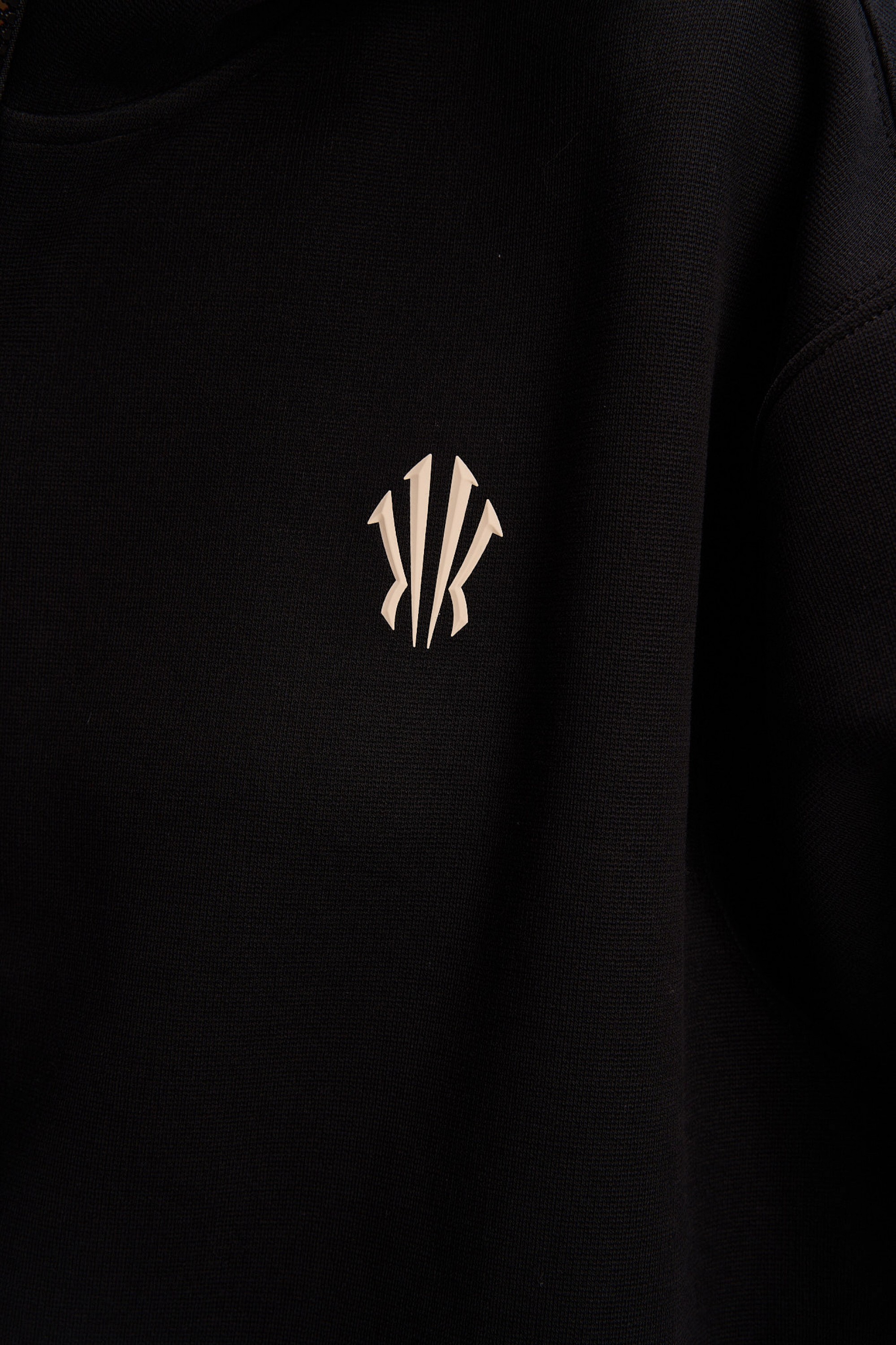Толстовка изготовлена из высокоплотного (315 г/кв.м) трикотажного полотна премиального качества: полиэстер (61%) обеспечивает прочность и сохранение насыщенного черного цвета, хлопок (34%) отвечает за натуральный комфорт и воздухопроницаемость, а значительная доля эластана (5%) придает материалу выдающуюся эластичность для абсолютной свободы движений.