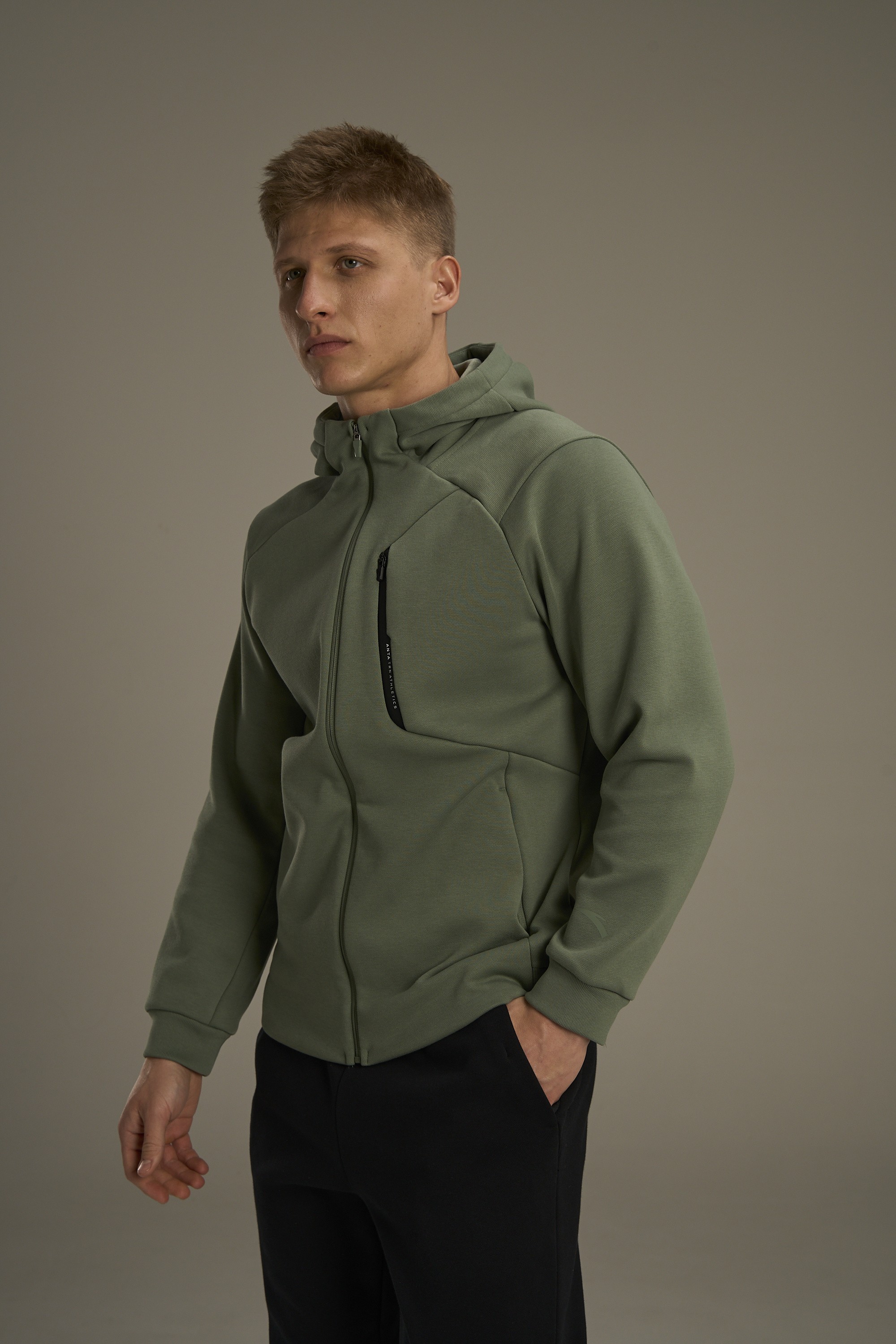 Толстовка имеет классический спортивный крой, гарантирует свободу движений и стильный вид. Карман на груди с ламинированной матовой отделкой добавляет изделию премиальности. В модели предусмотрены практичные карманы на молнии для хранения мелочей, а также эластичные манжеты на рукавах и по низу изделия для идеальной посадки.