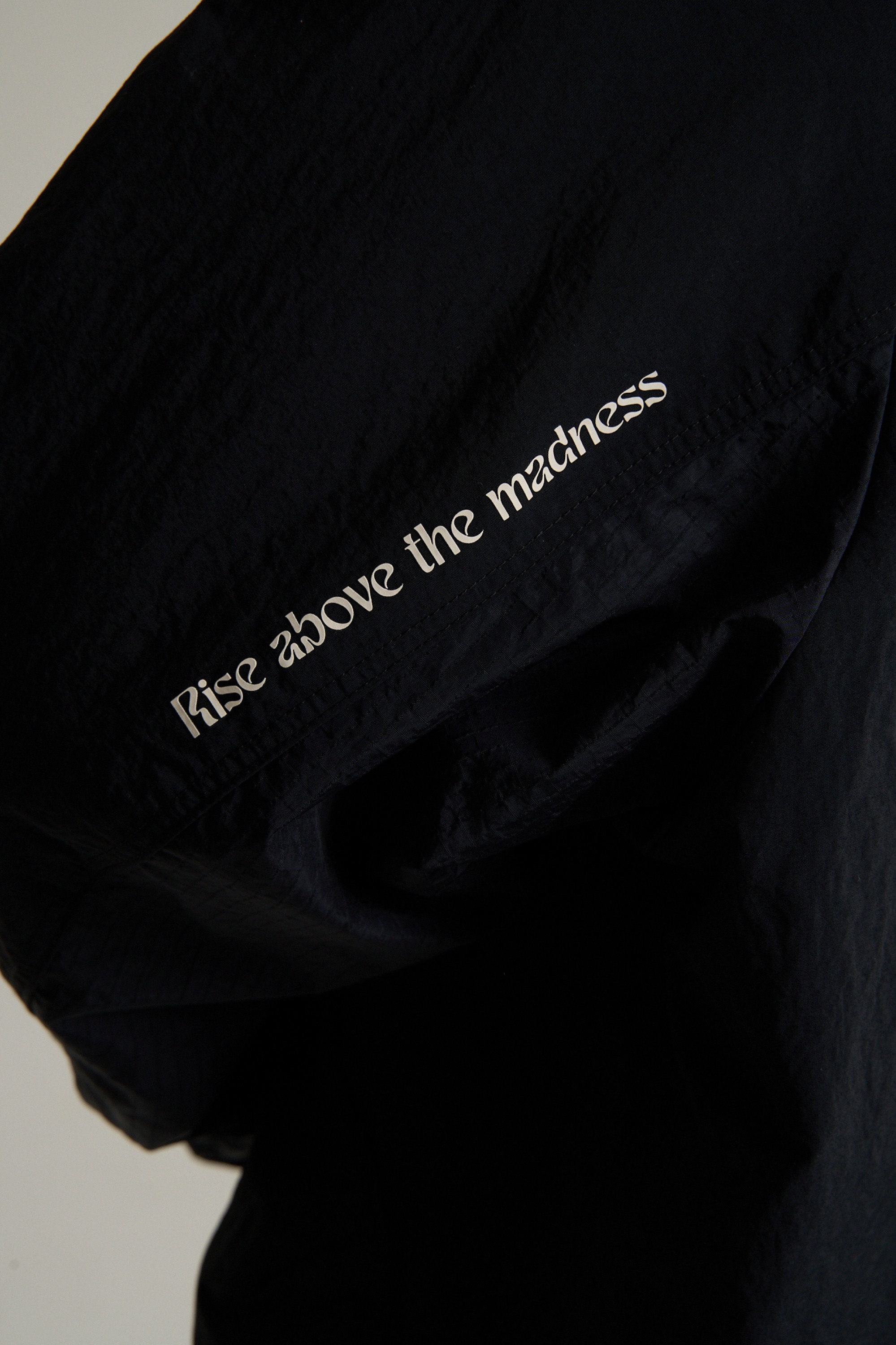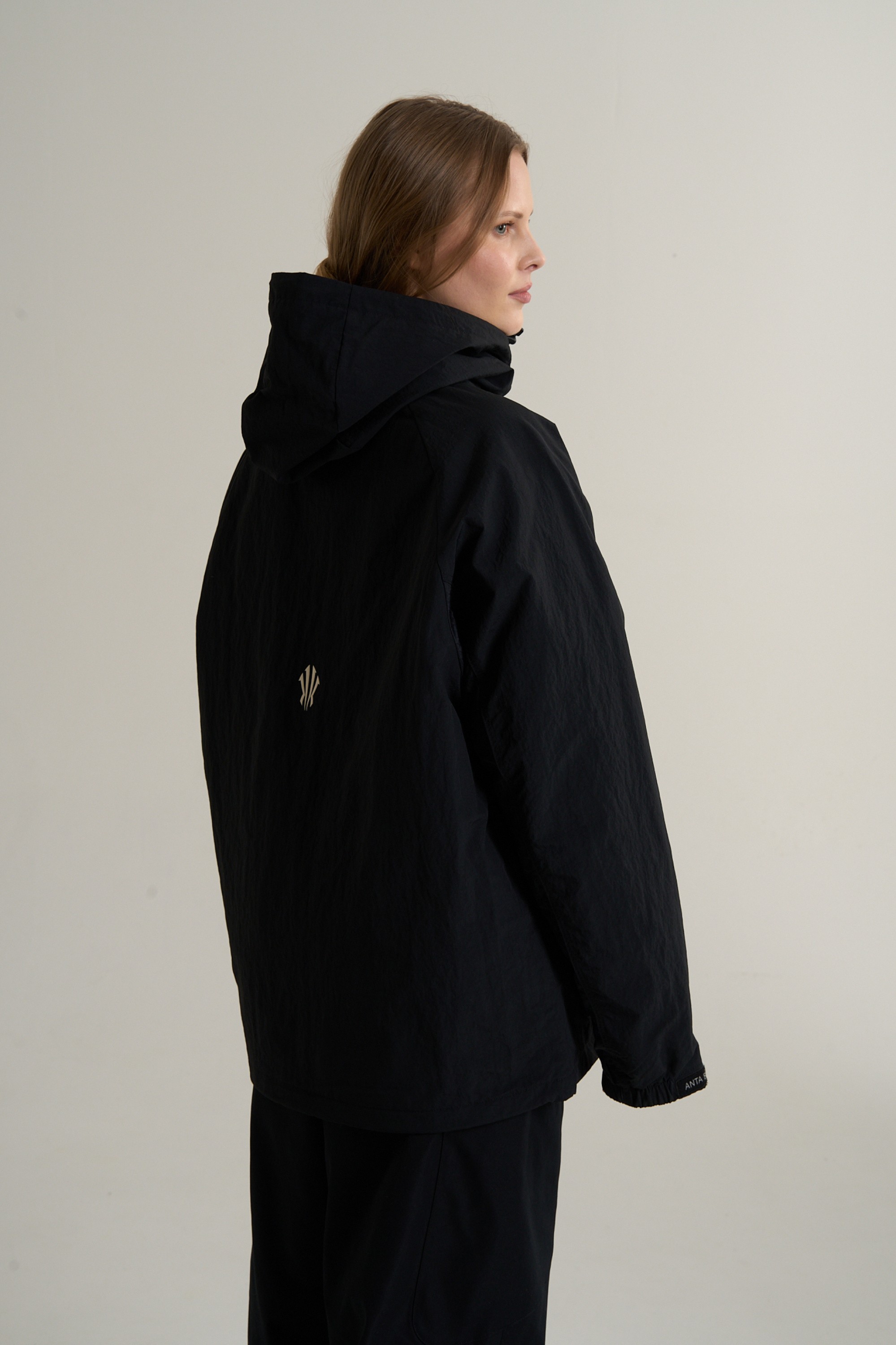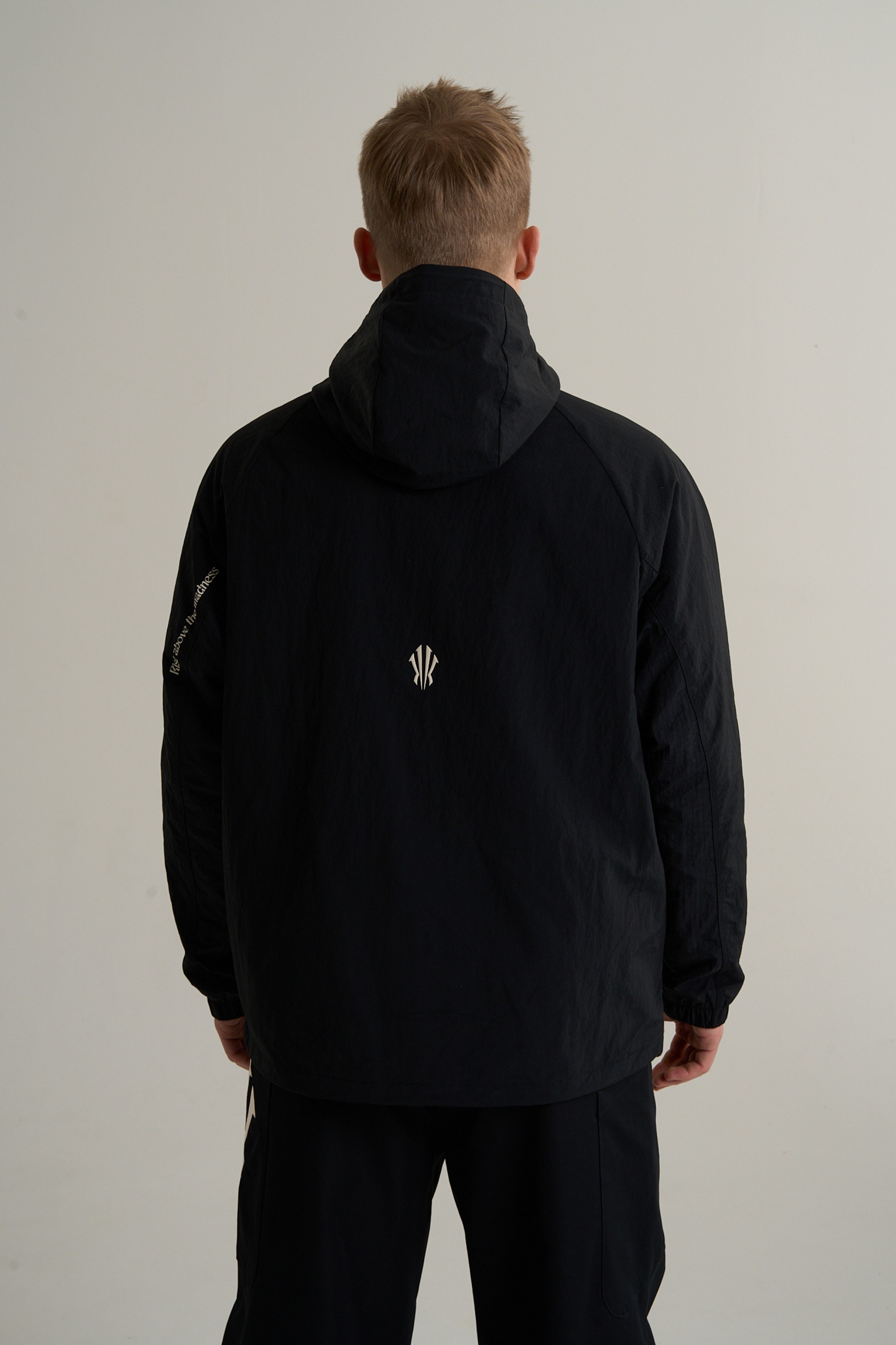 Строгость и минимализм дизайна подчеркивают технологичность. На левой стороне груди размещен логотип коллекции, на спине – небольшой визуальный элемент «щит Ирвинга», на рукаве – стильный вышитый логотип ANTA черный-на-черном. На правом рукаве размещено полускрытое послание Rise Above The Madness («вознесись над безумием»).