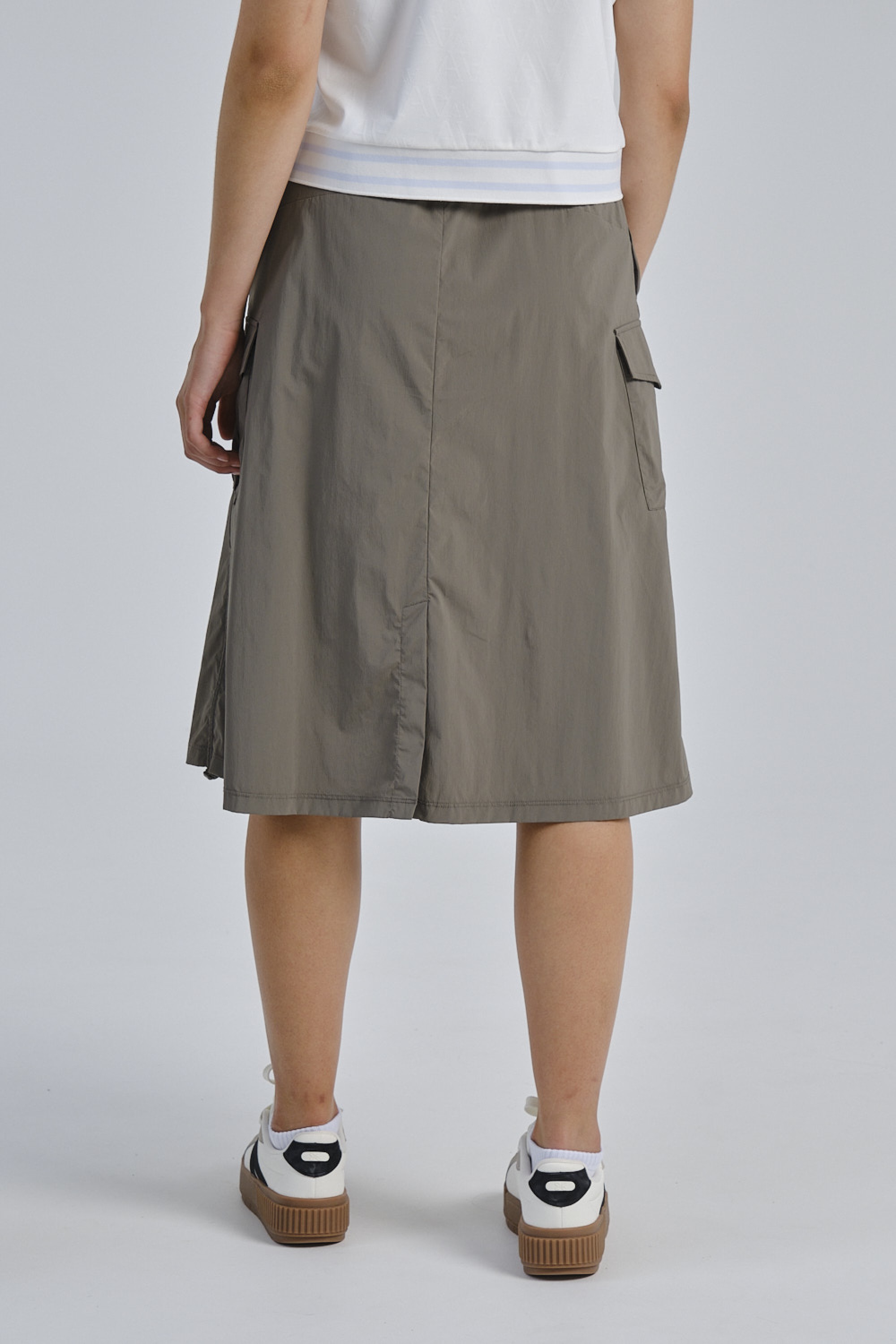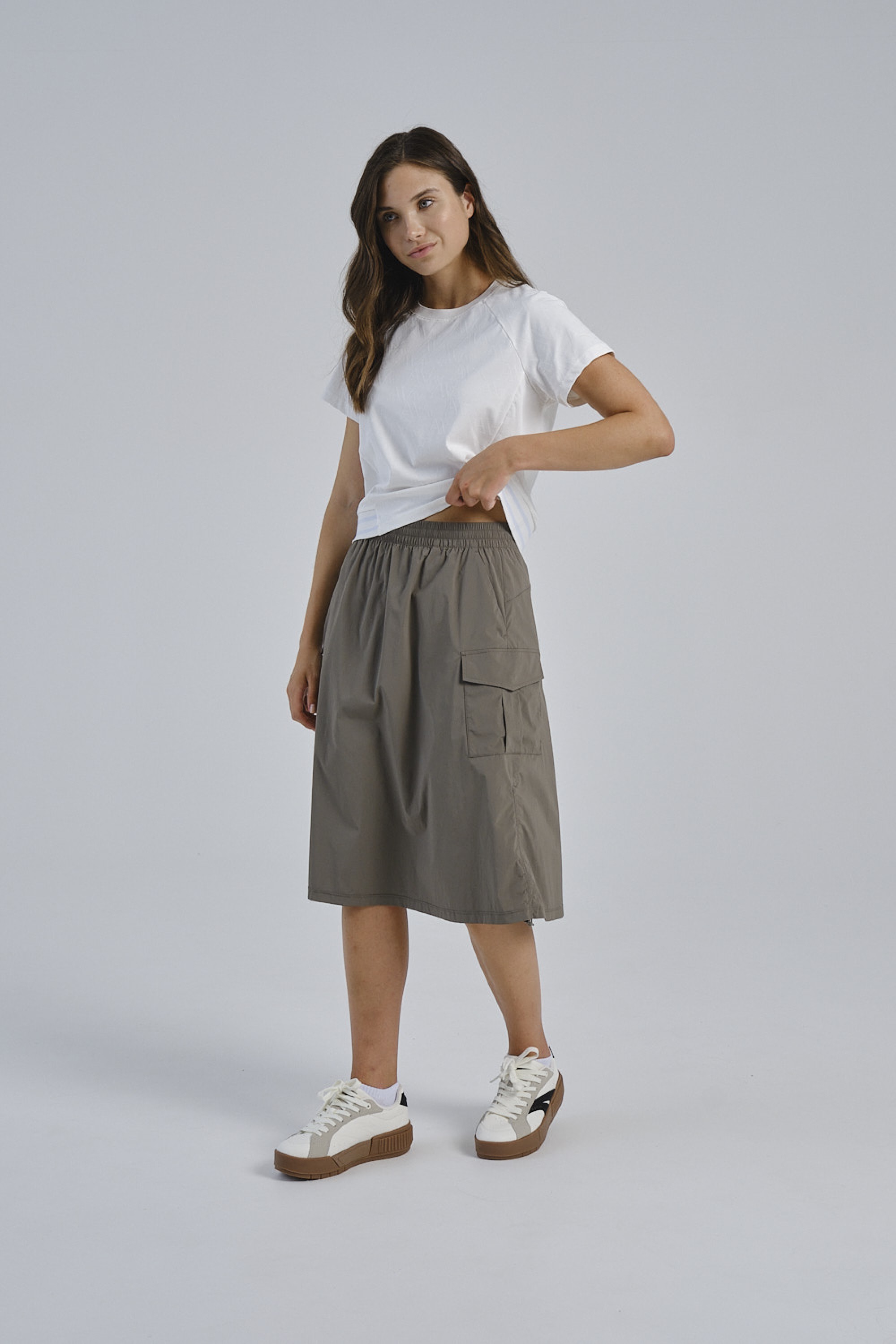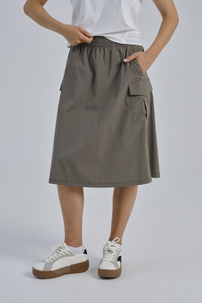 Широкий эластичный пояс с внутренним регулировочным шнурком обеспечивает комфортную и надежную посадку на талии. Оригинальные сборки по бокам, регулируемые шнурком с фиксатором, позволяют изменять силуэт юбки и создавать разные образы. Два боковых кармана и два вместительных накладных кармана с клапанами обеспечивают практичность и позволяют держать необходимые мелочи под рукой. Утилитарный цвет хаки делает эту юбку универсальным элементом вашего гардероба.